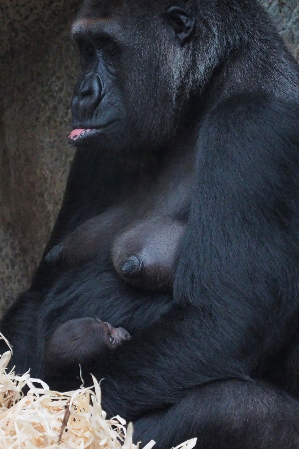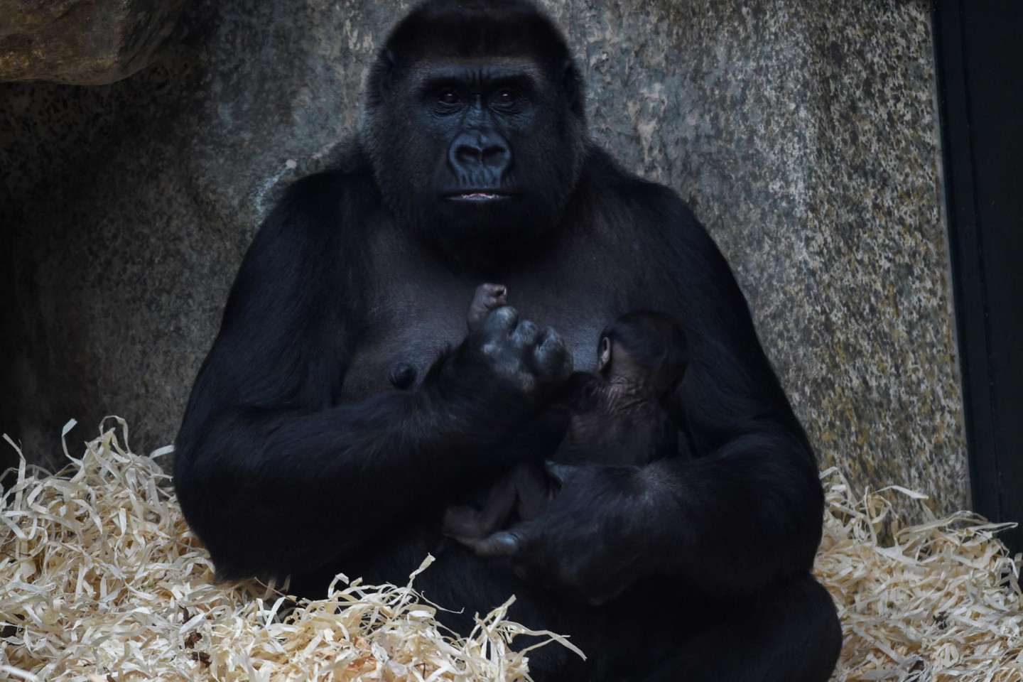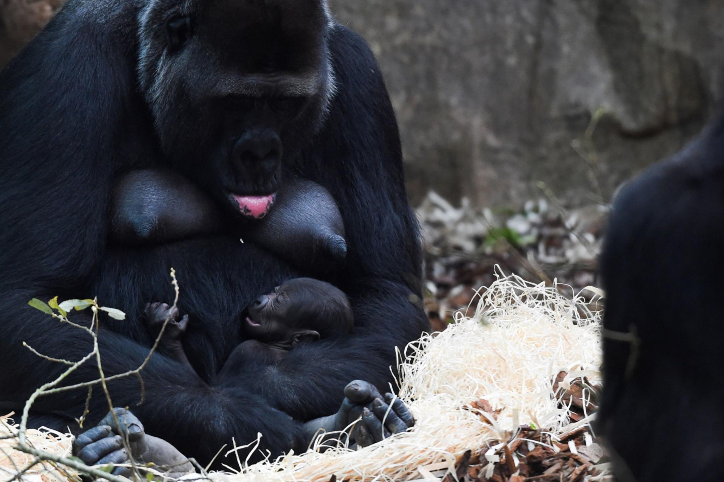 Zoodārzā Francijā iemūžināts, kā nesen dzimis gorillu mazulis atpūšas māmiņas rokās.