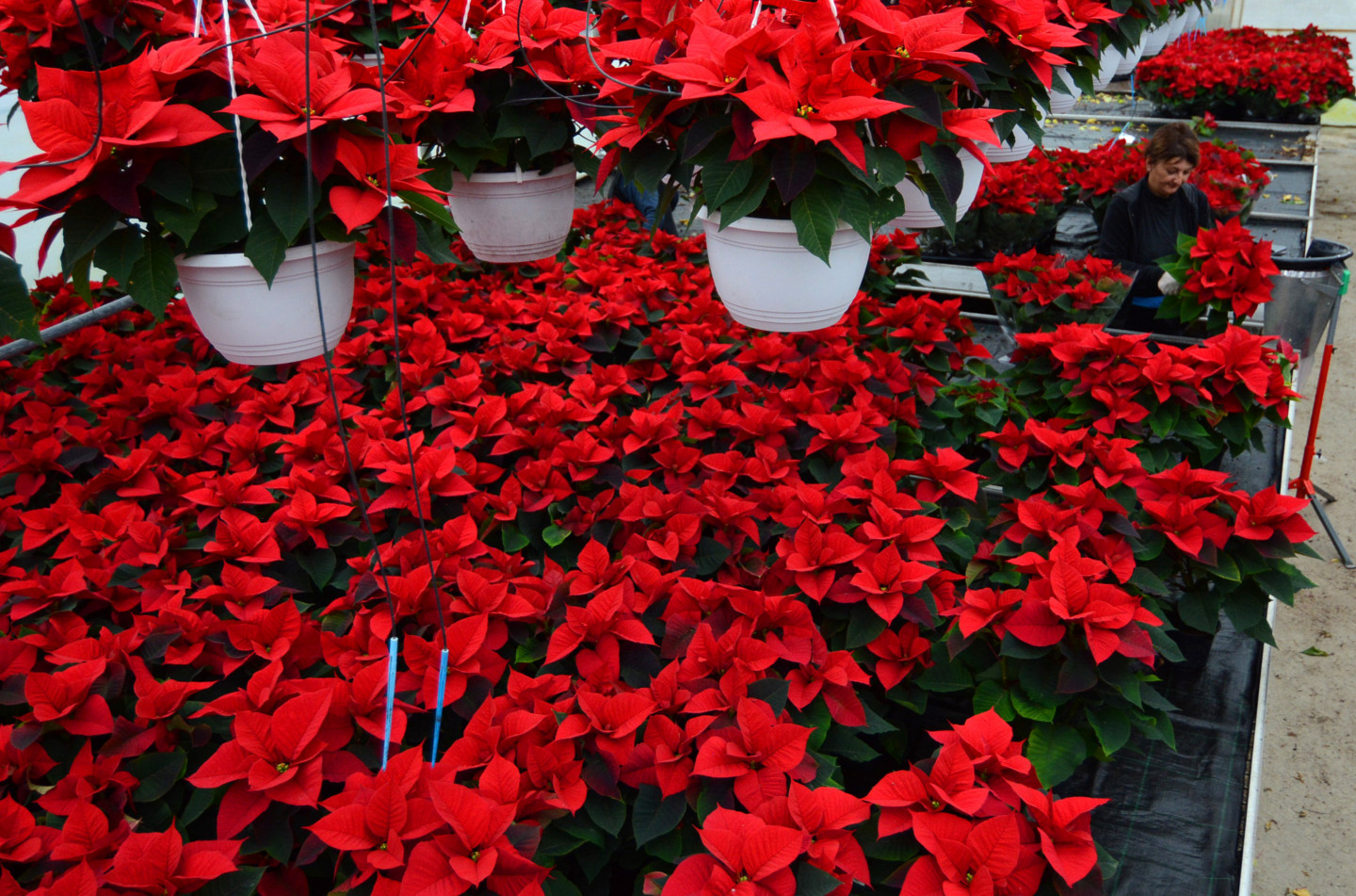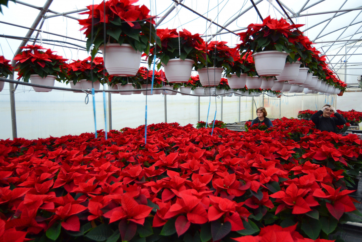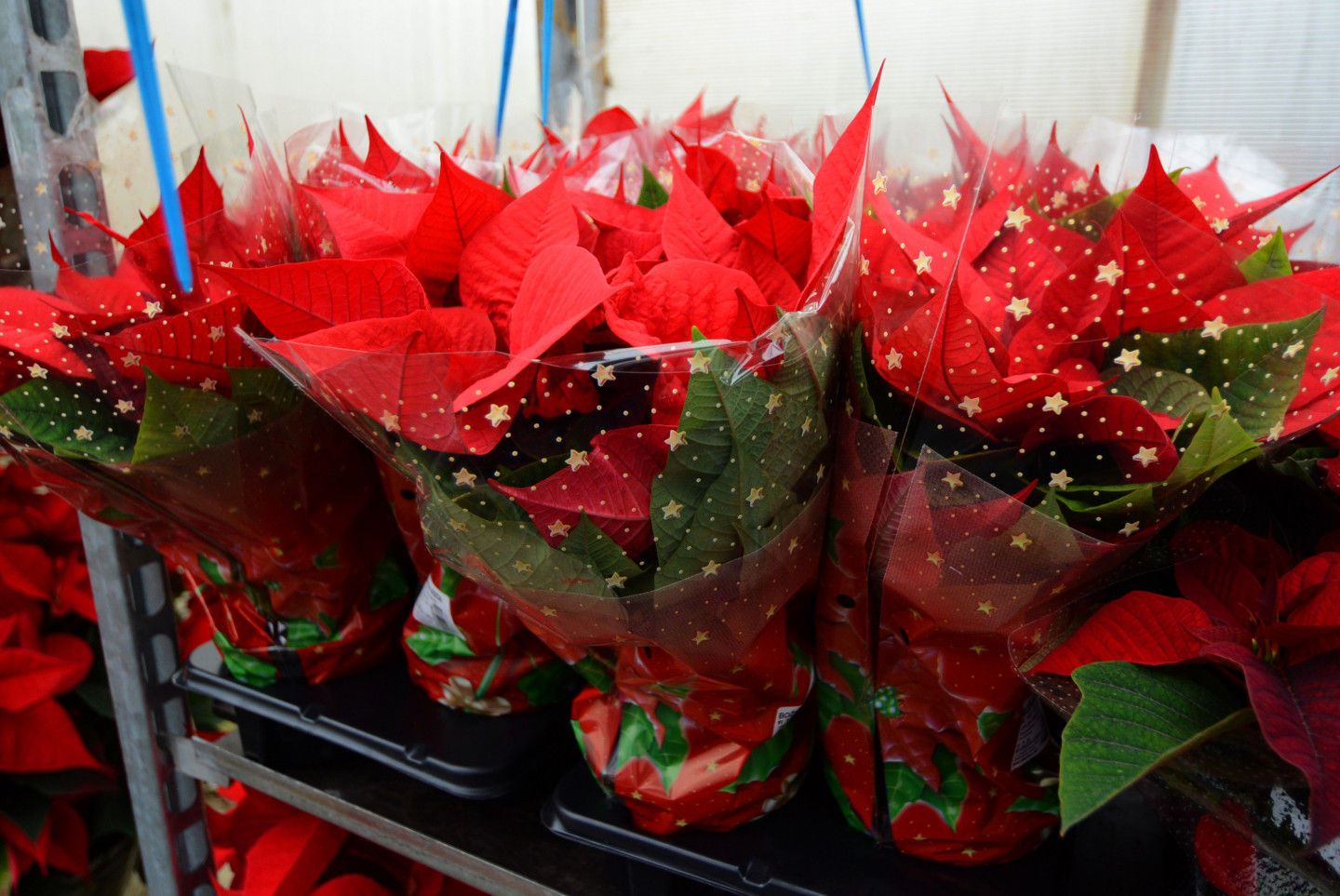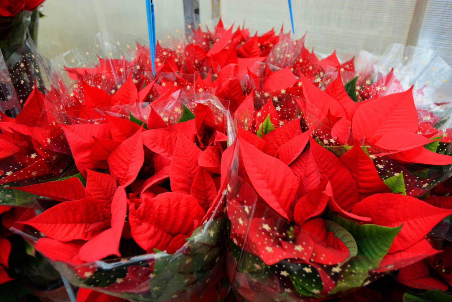 Kādā telpaugu tirdzniecības vietā pārdošanai sagatavots liels skaits puansetiju jeb "Ziemassvētku zvaigznes."