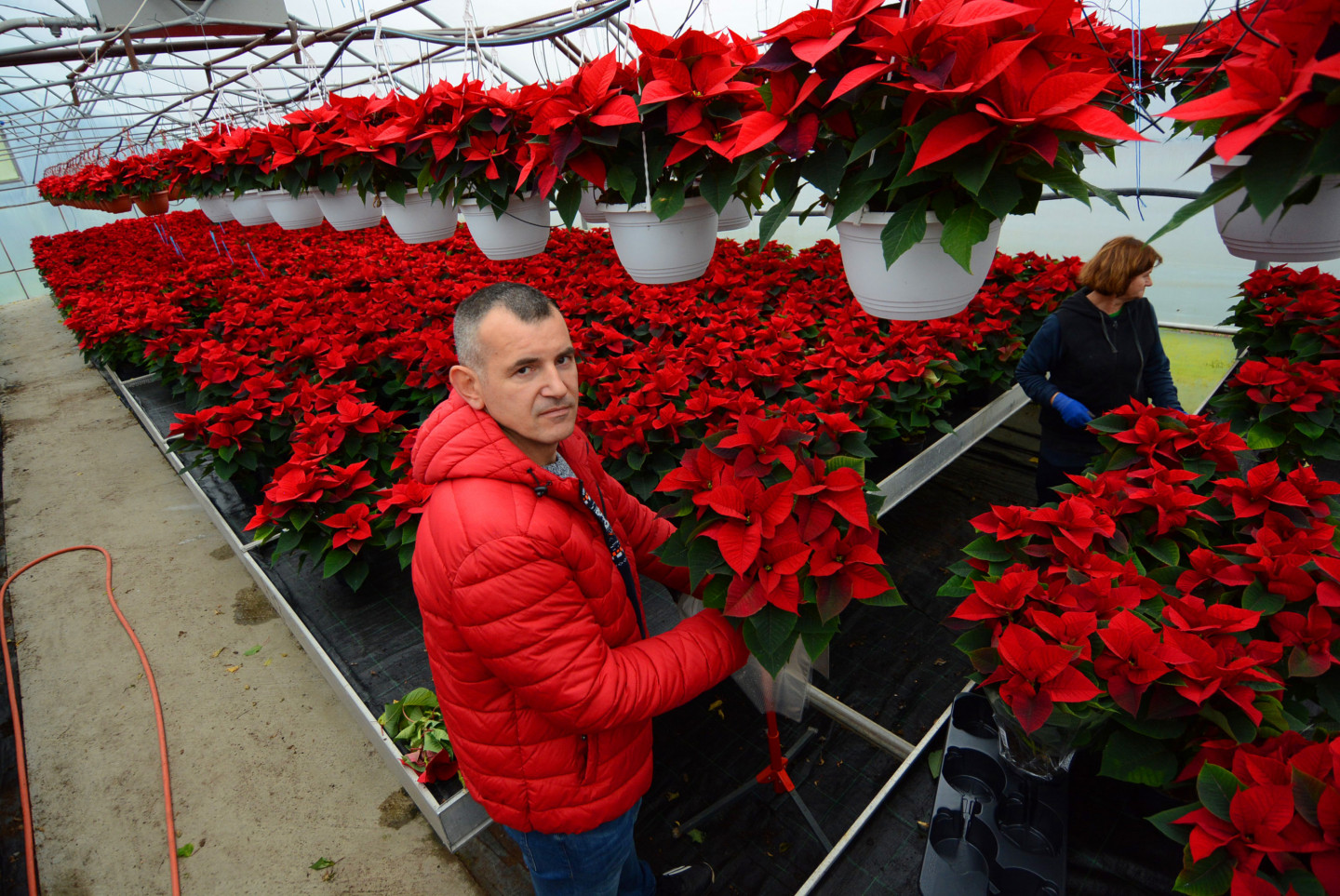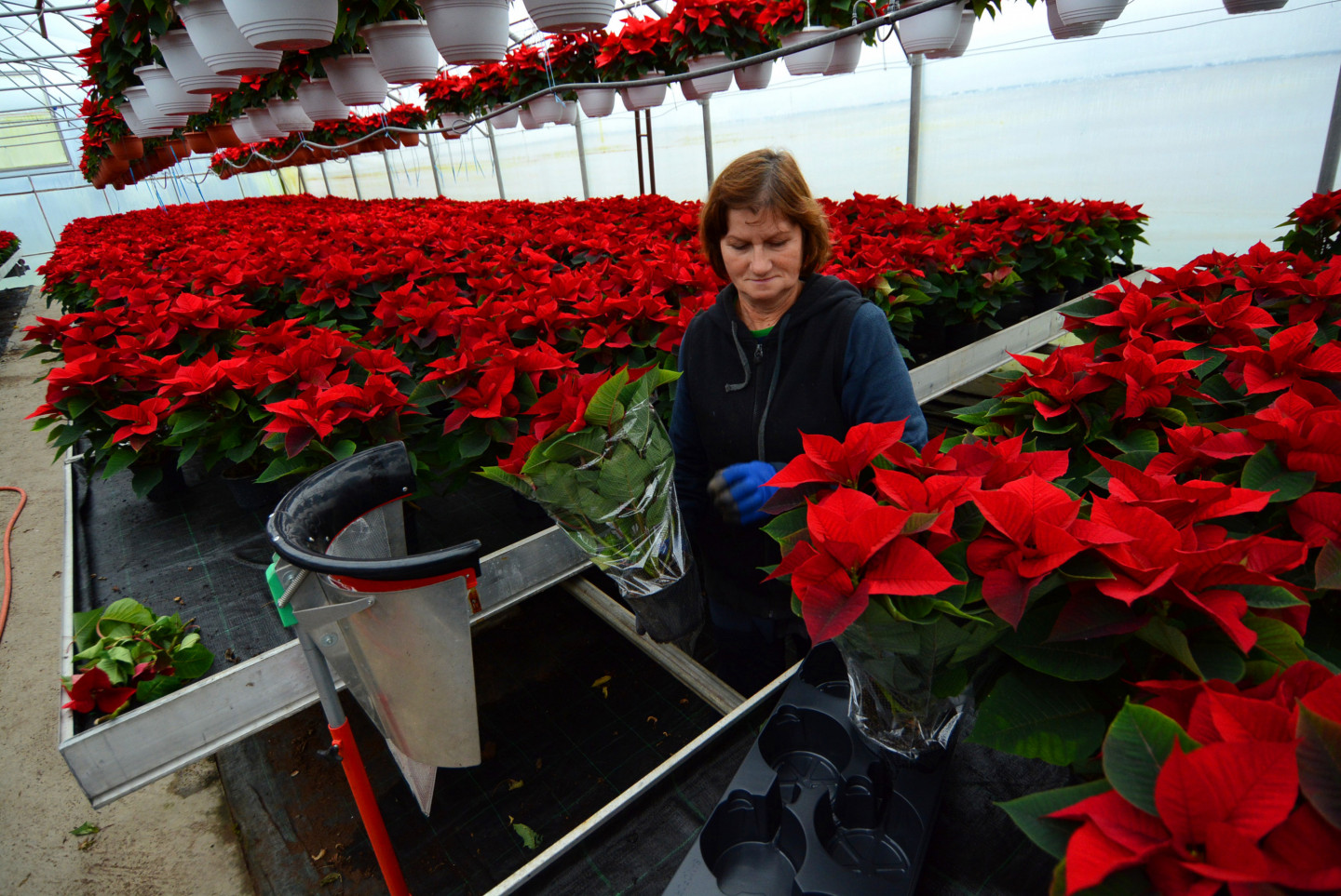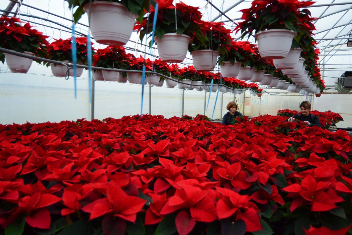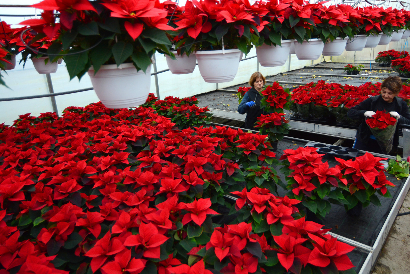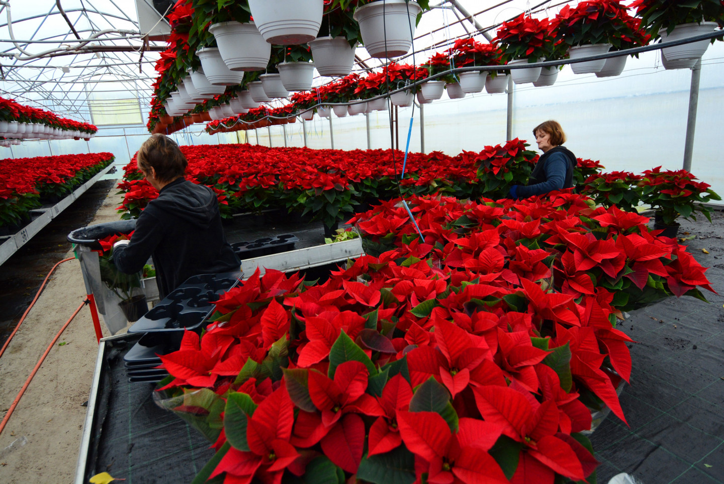 Kādā telpaugu tirdzniecības vietā pārdošanai sagatavots liels skaits puansetiju jeb "Ziemassvētku zvaigznes."