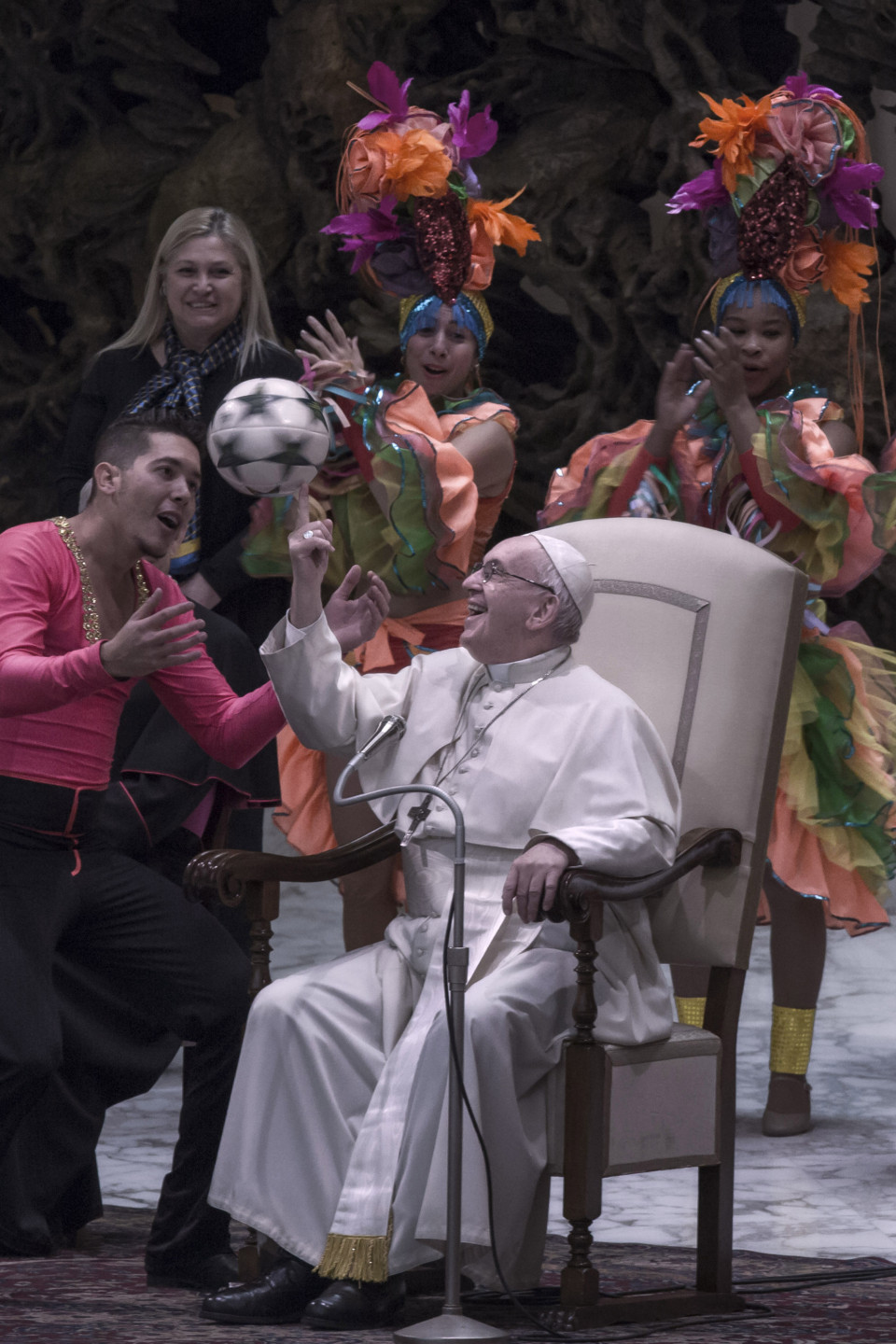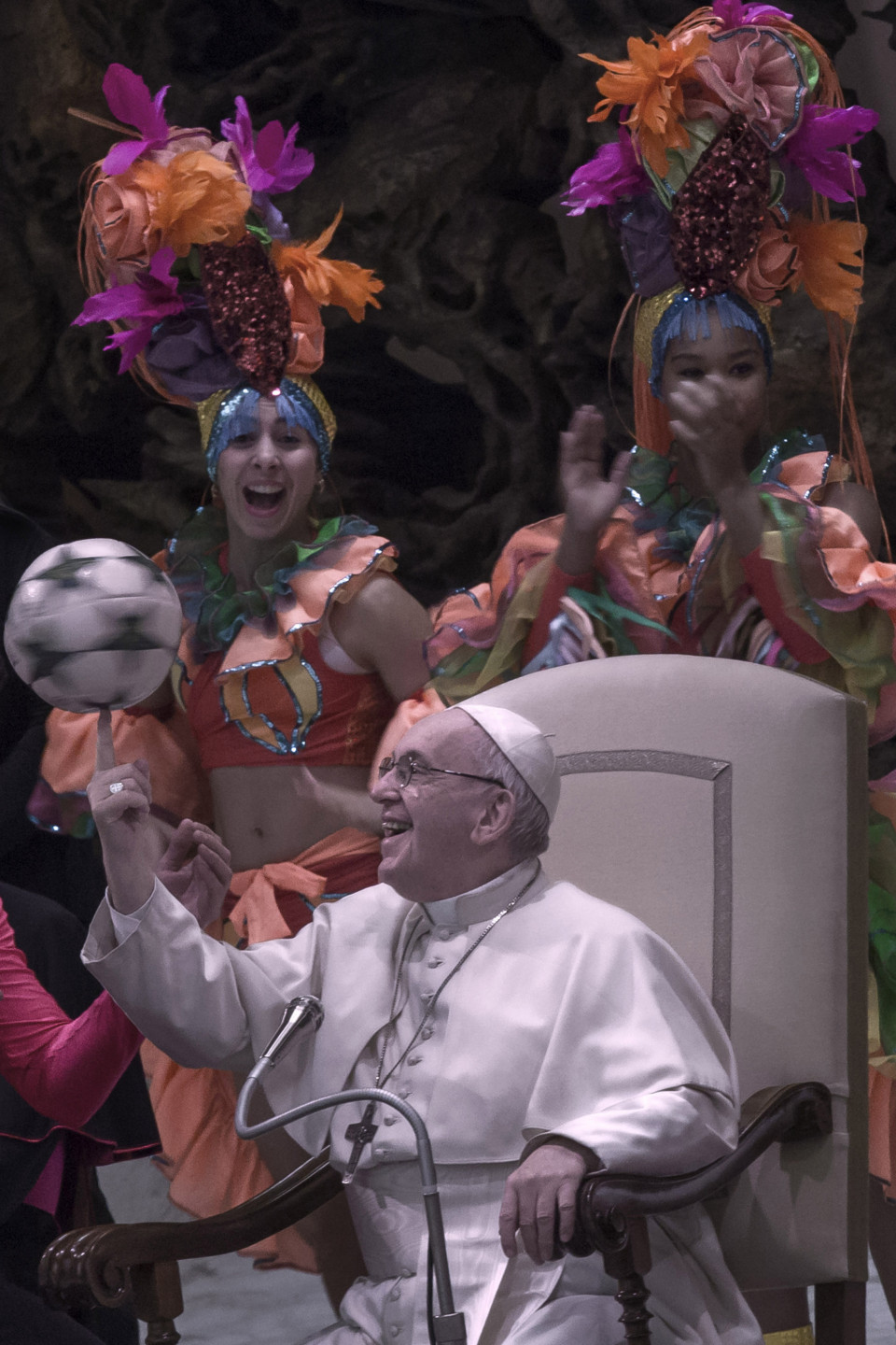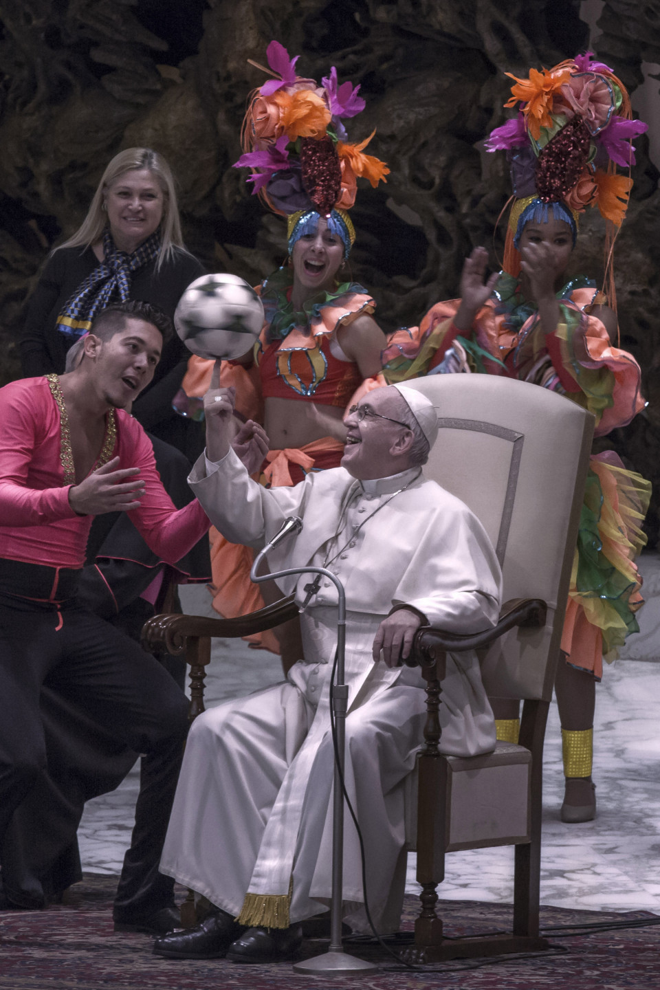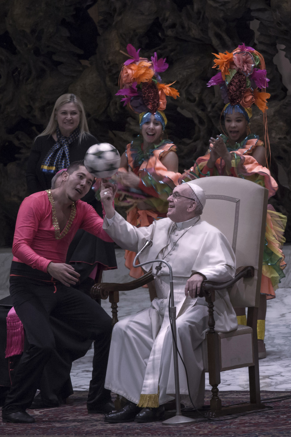 Pāvests Francisks publikai Vatikānā parādījis, kā prot uz pirksta griest futbola bumbu. Šo bumbu viņam uzdāvināja Kubas cirka dalībnieki.