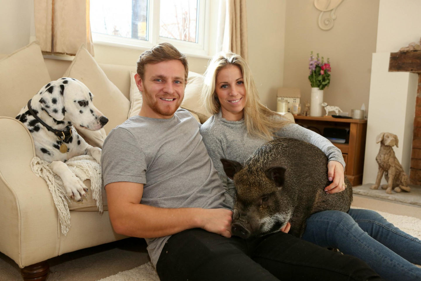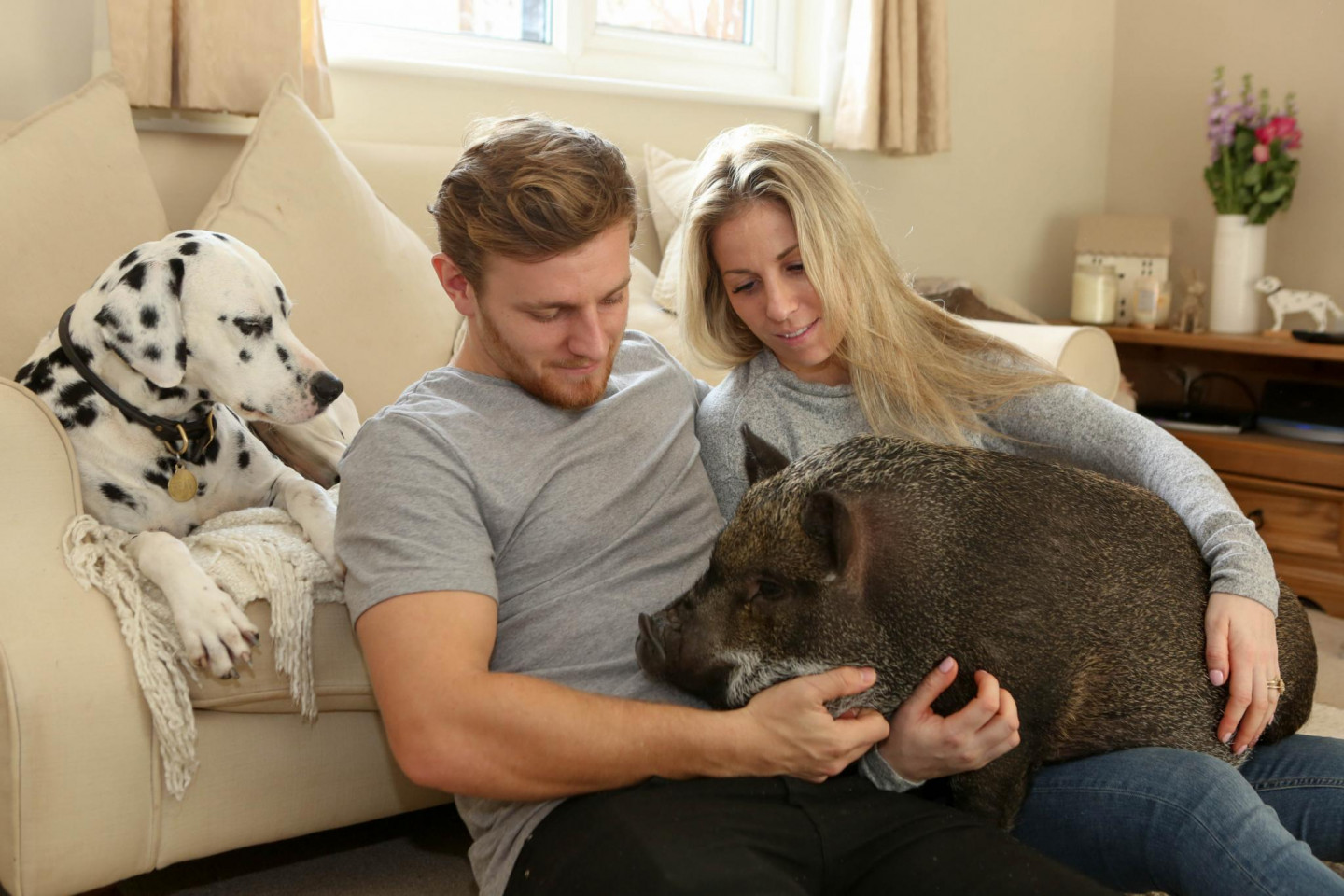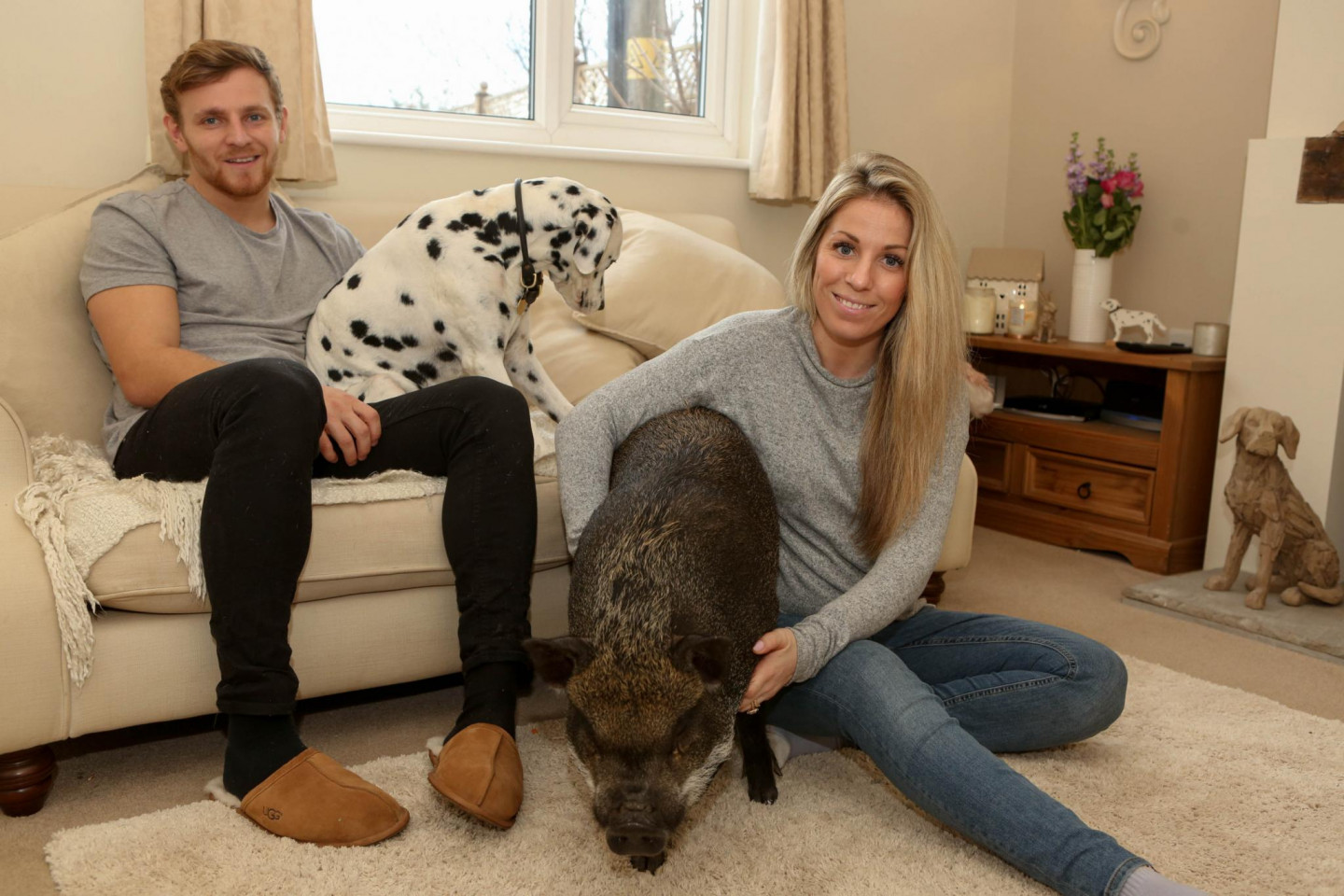 Kāds pāris Anglijā par savu mājdzīvnieku izvēlējušies ne vien dalmācieša šķirnes suni, bet arī cūku.