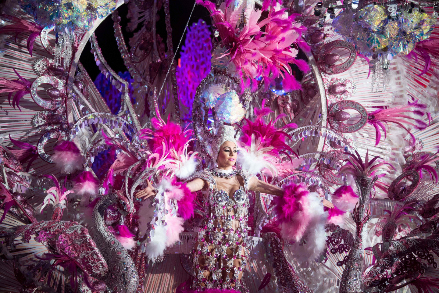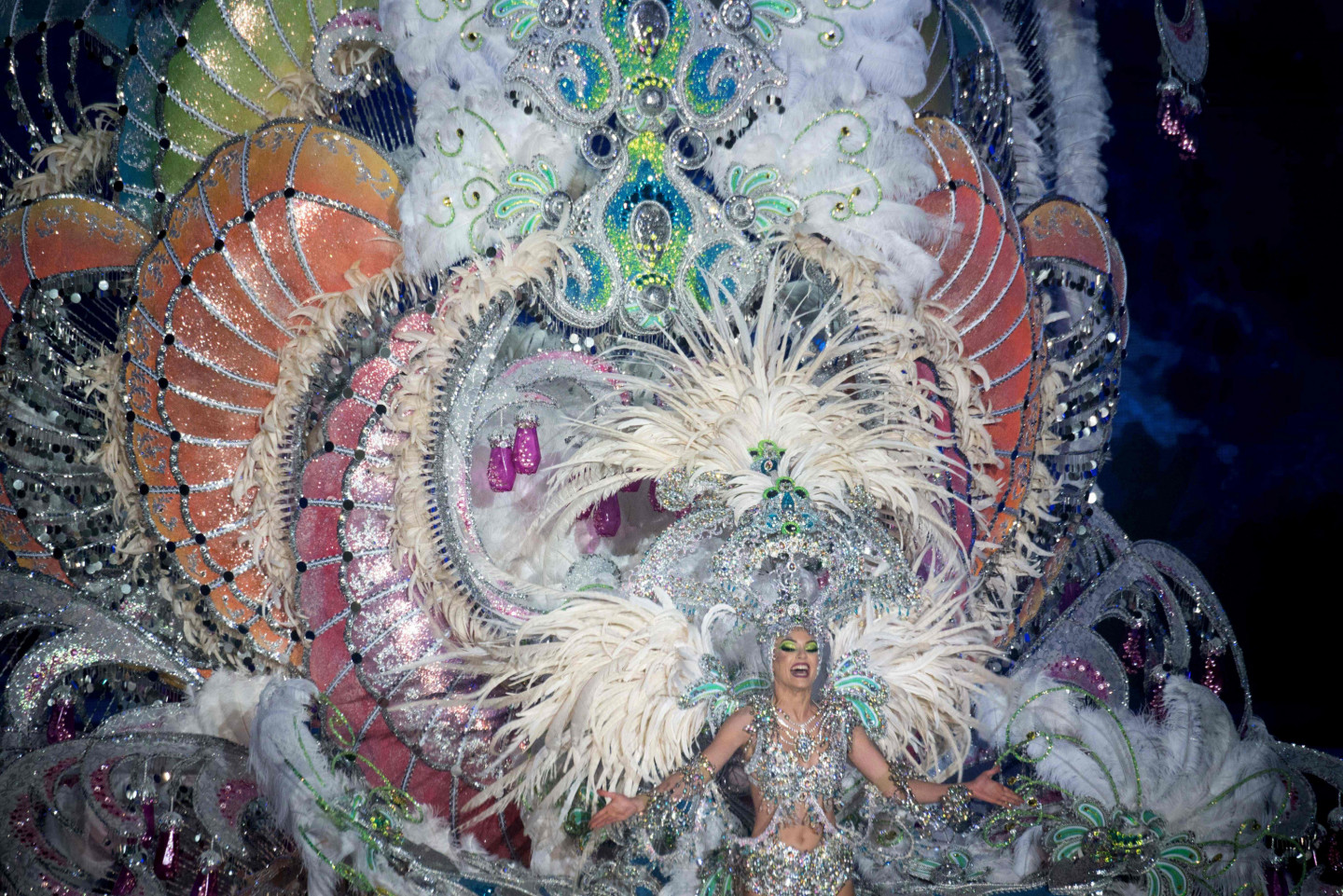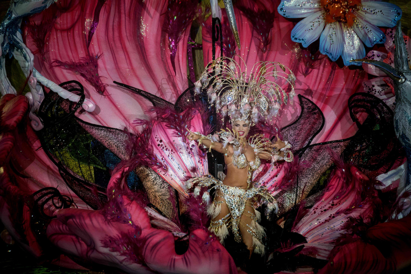 Tenerifē notiek krāšņais Santakrusas karnevāls, kur dalībnieki apbur ar saviem tērpiem.
