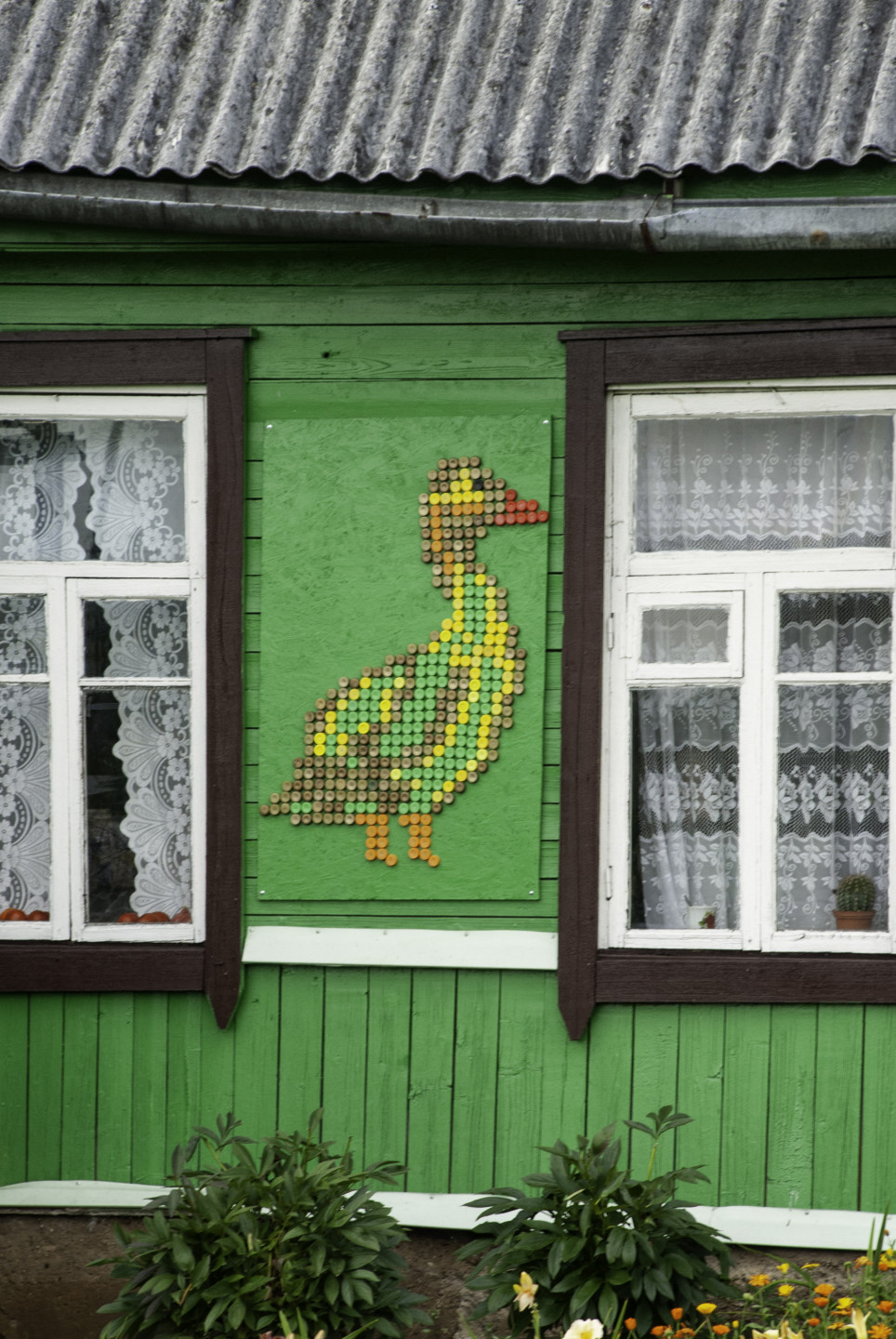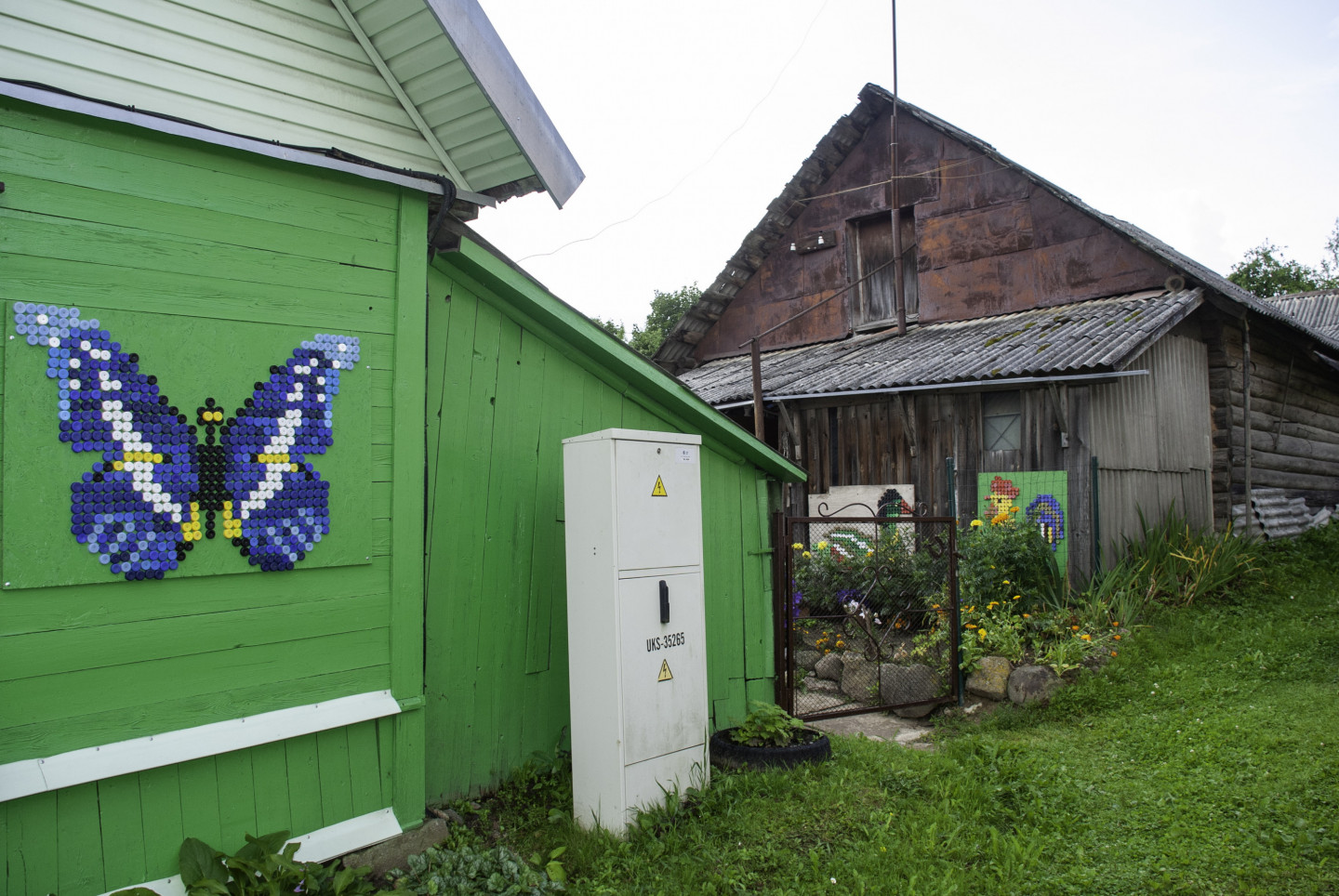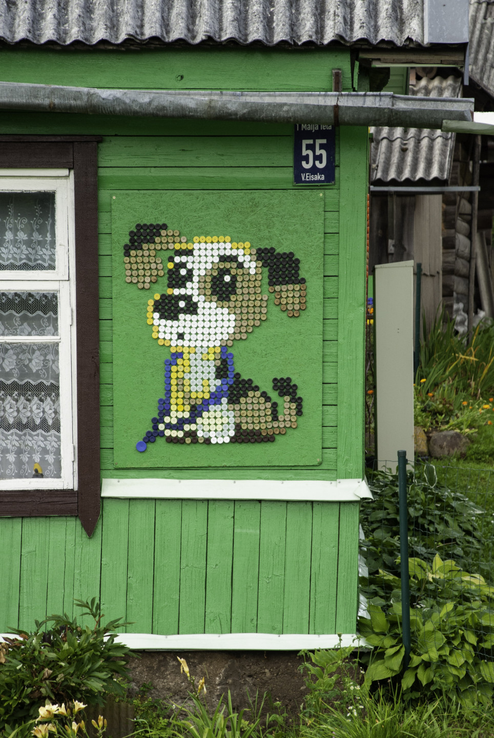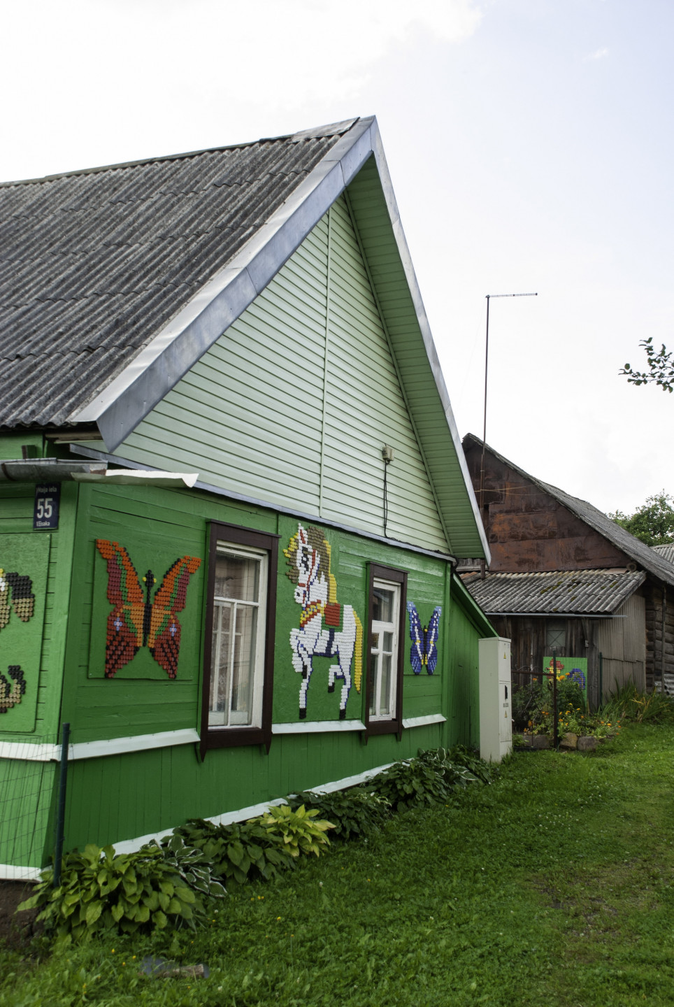 Latgales viensētas sienas rotātas ar dekoriem, kas veidoti no pudeļu korķiem