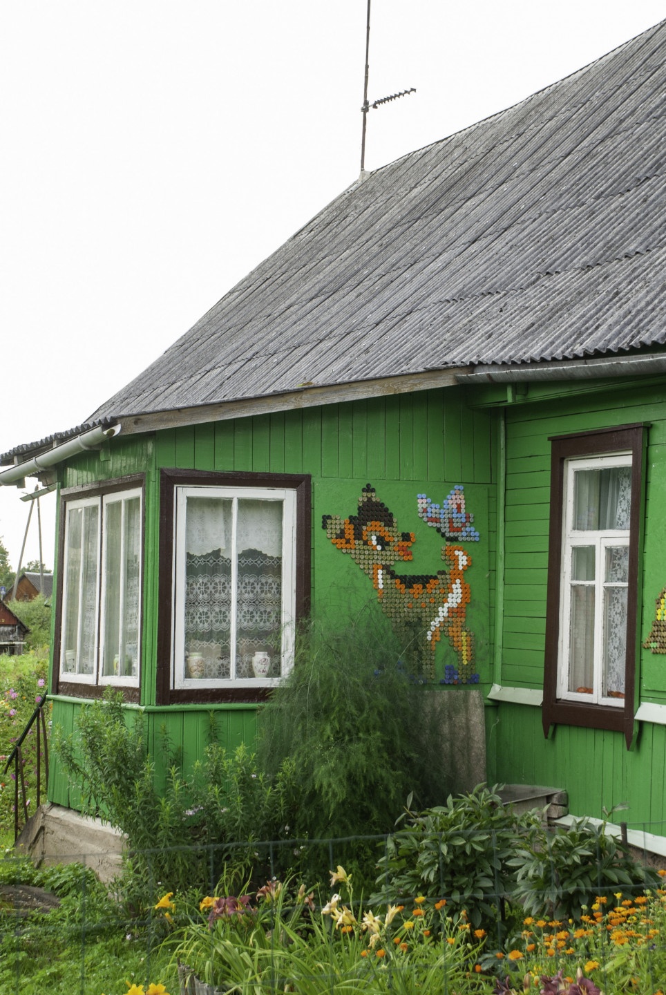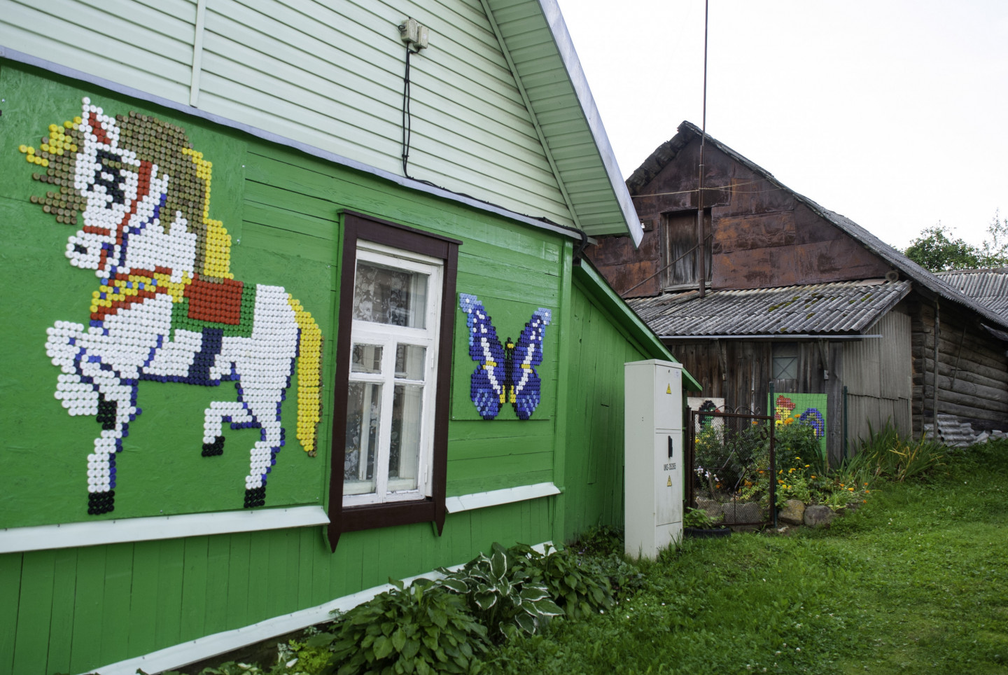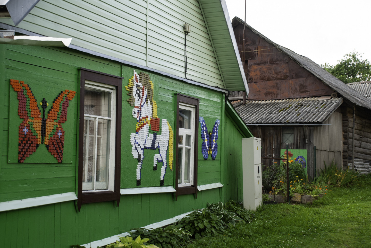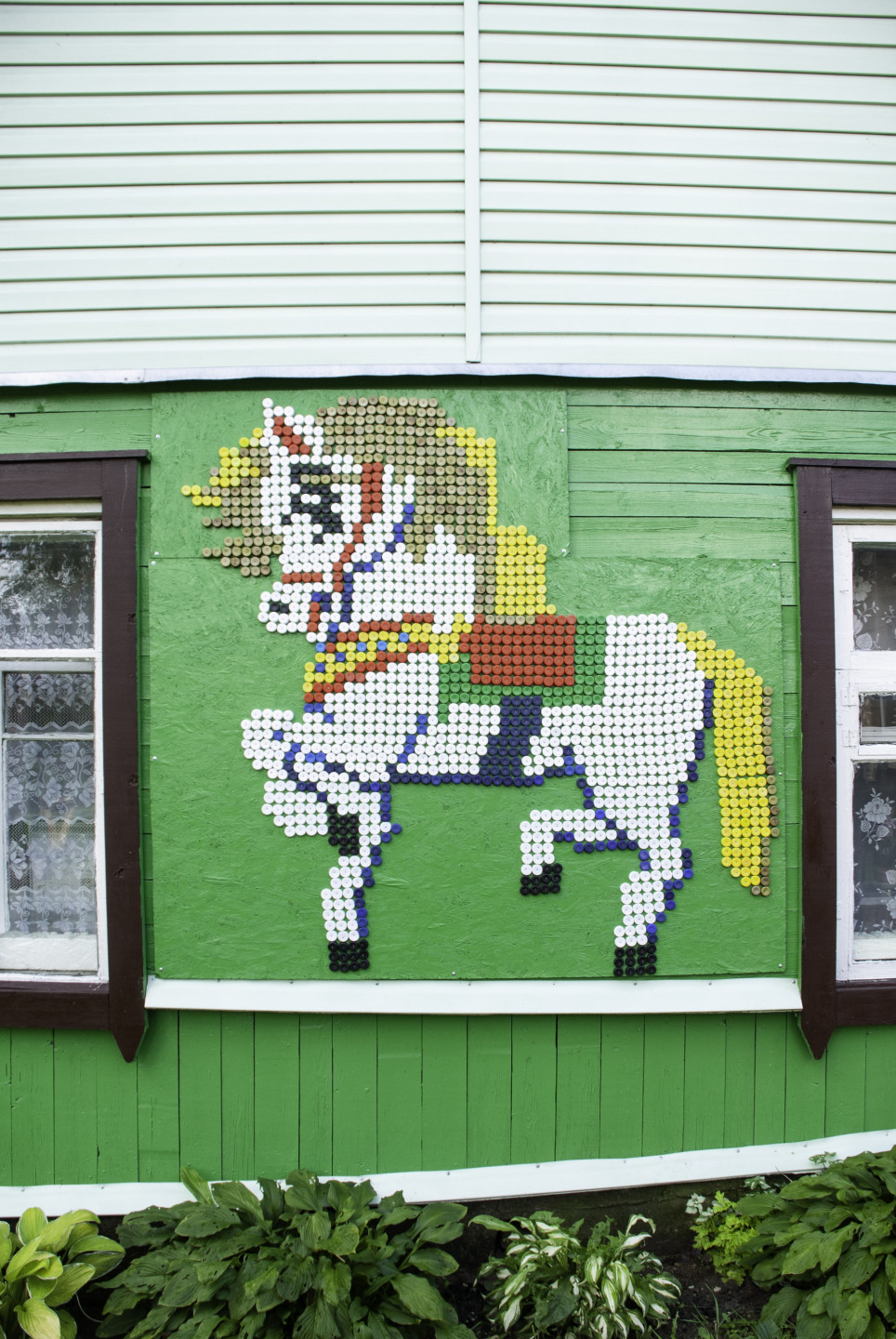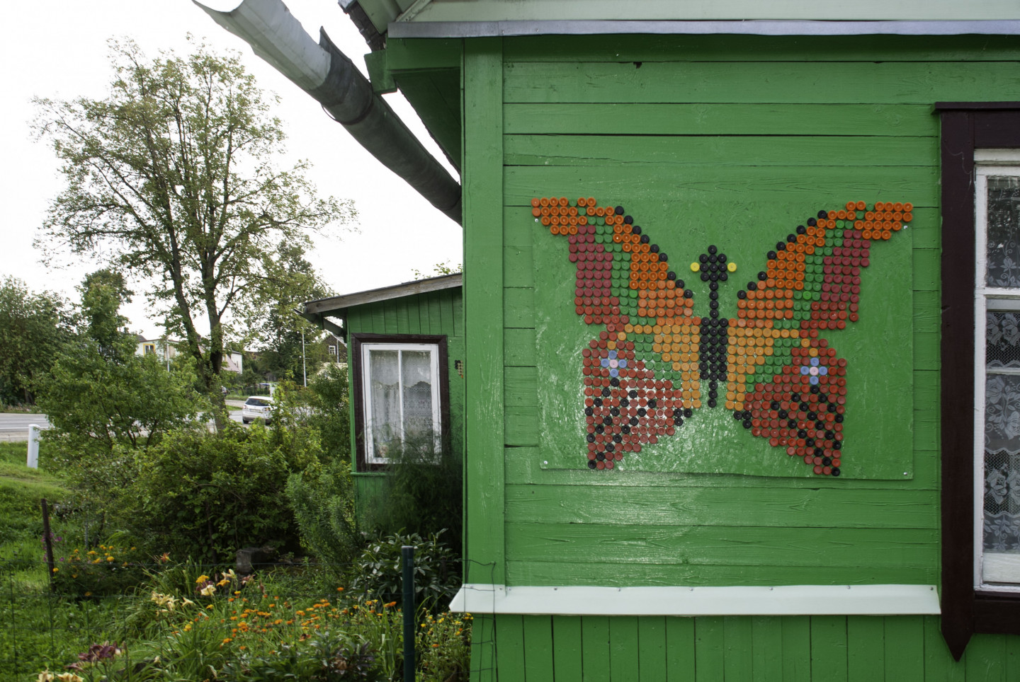 Latgales viensētas sienas rotātas ar dekoriem, kas veidoti no pudeļu korķiem