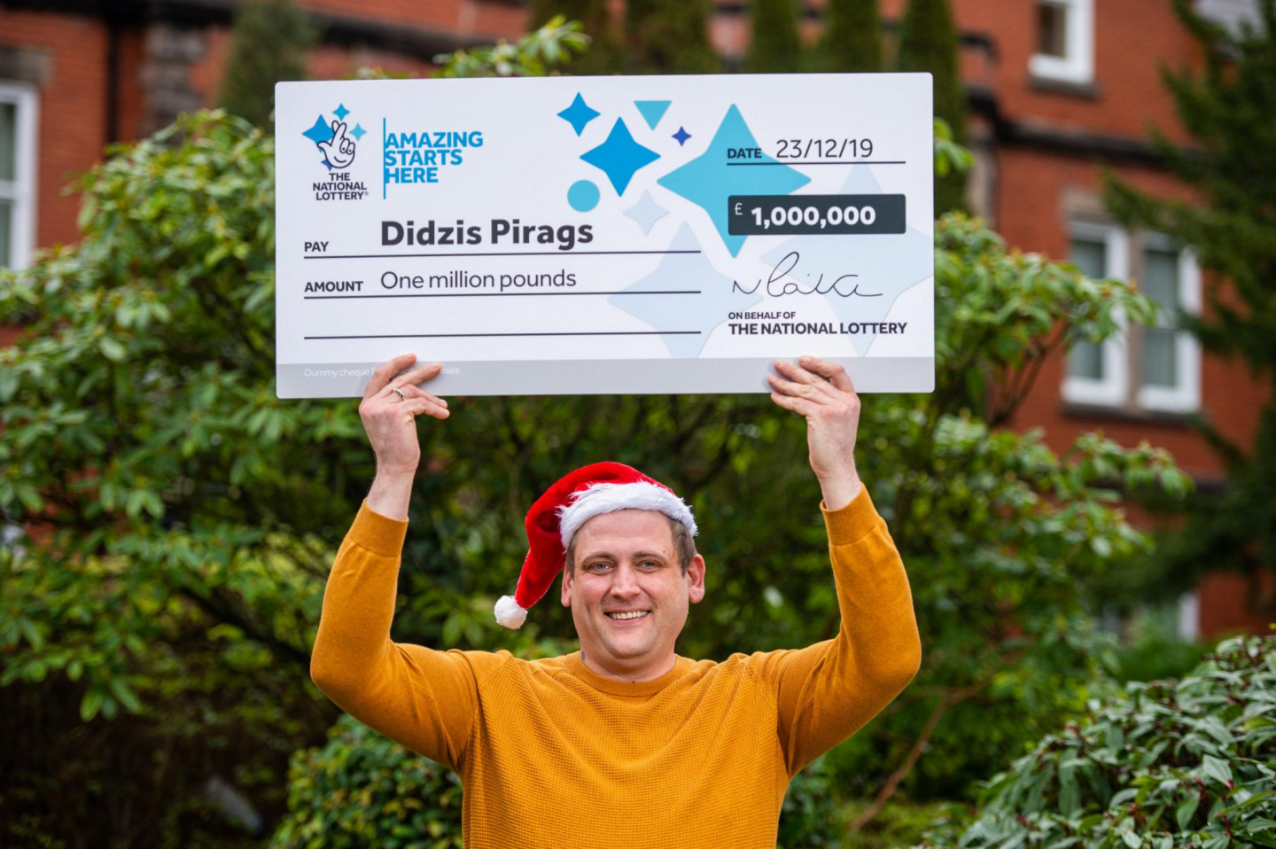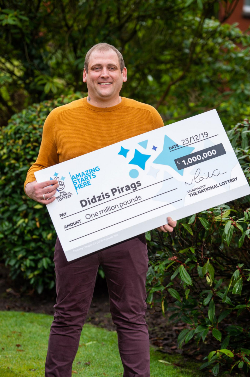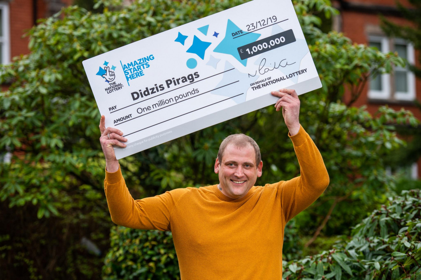 Jau vēstīts, ka gada izskaņā Anglijā veiksme uzsmaidījusi vientuļajam tēvam Didzim Pīrāgam no Latvijas, kurš loterijā laimējis miljonu mārciņu. Fotogrāfs steidzis iemūžināt, kā tad veiksminieks līksmojis vērtīgā laimesta pasniegšanas brīdī.