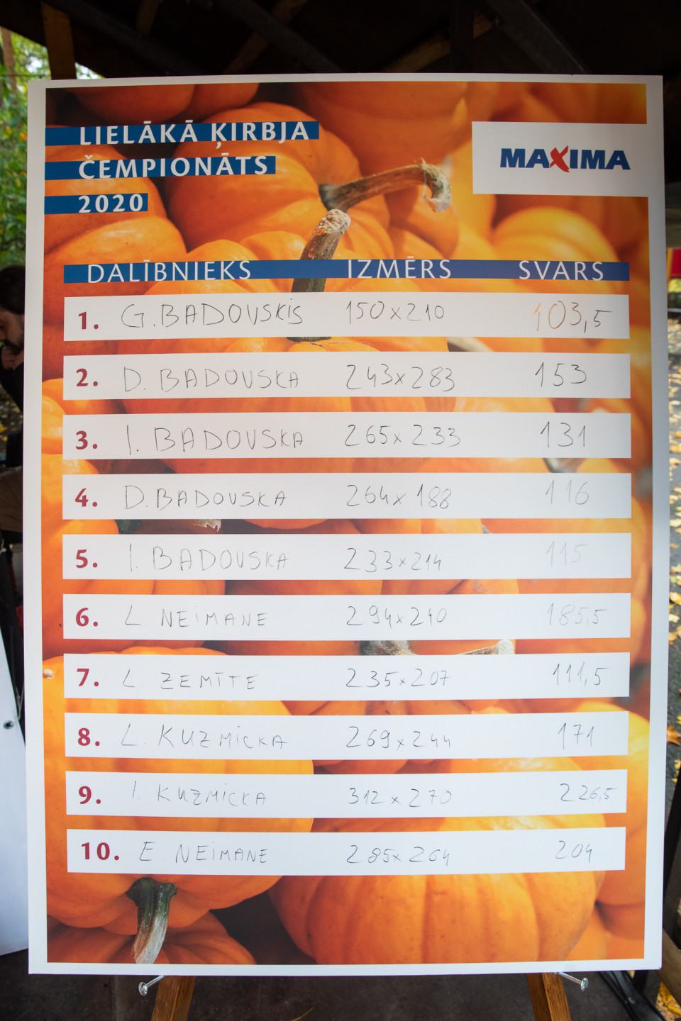 Šodien, 23. oktobrī, "Latvijas lielākā ķirbja čempionātā" noskaidroti šī gada lielāko ķirbju audzētāji. Vērienīgāko dižogu izaudzējusi Ingrīda Kuzmicka no Dobeles novada, ķirbim sasniedzot 312x270 cm apkārtmēru un 226,5 kg. Čempionātu Rīgas Zooloģiskajā dārzā kā ierasts organizē "Maxima Latvija", jau 15. gadu pēc kārtas godinot Latvijas vietējos dārzeņu audzētājus. Čempionāta finālā uz Rīgas Zooloģisko dārzu tika atvesti desmit finālisti – Latvijas lielākie ķirbji no Kuldīgas, Dobeles, Ādažu, Ventspils un Skrundas novadiem. Svinīgo mērīšanas un svēršanas procesu nodrošināja Latvijas vadošo spēkavīru Daiņa Zāģera un Didža Zariņa spēcīgais tvēriens, kā rezultātā sarindoti TOP 10 smagākie ķirbji. Otrās vietas ieguvējs ir Elīzas Neimanes audzētais ķirbis, sasniedzot 204 kg, savukārt trešo vietu – Luīzas Neimanes 185,5 kg smagais ķirbis. Abas dižogas izaugušas Kuldīgas novadā.