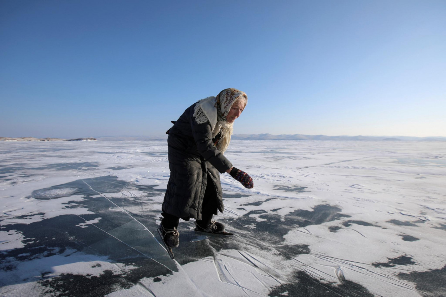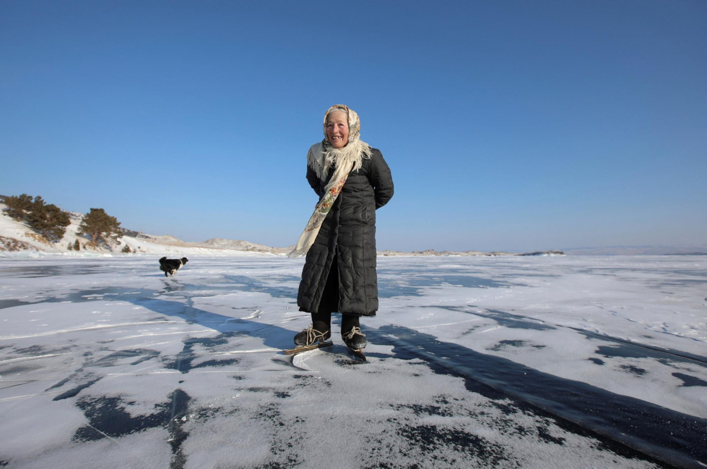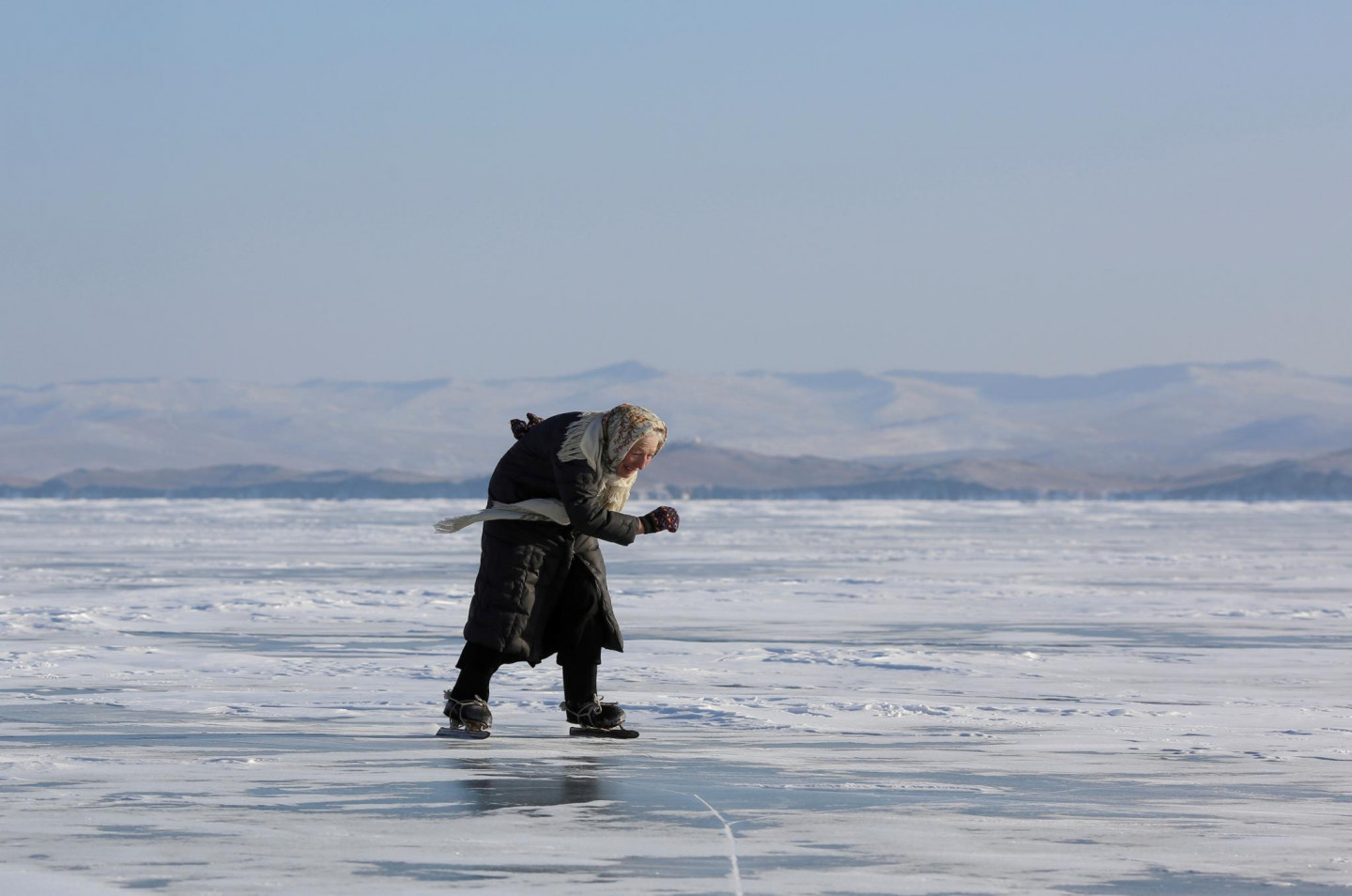 79 gadus vecas omītes aizraušanās - slidošana pa Baikāla ezeru