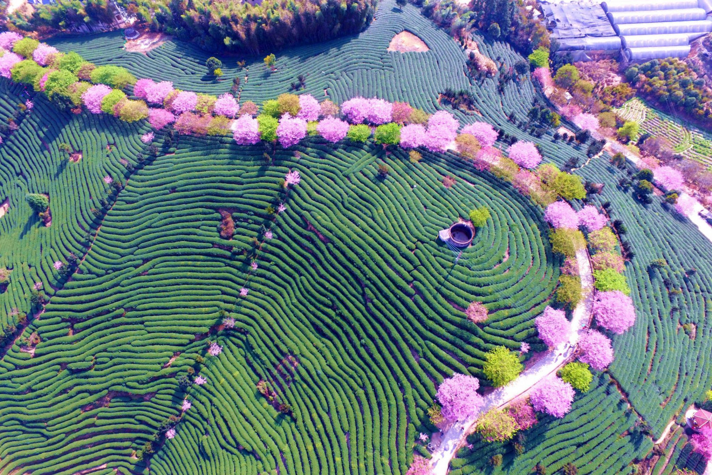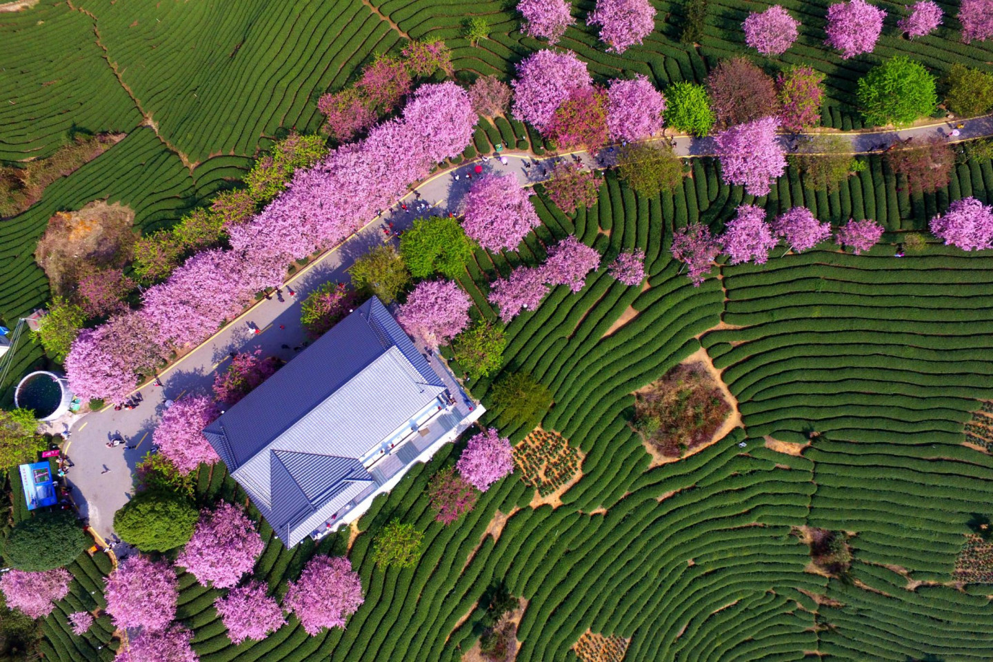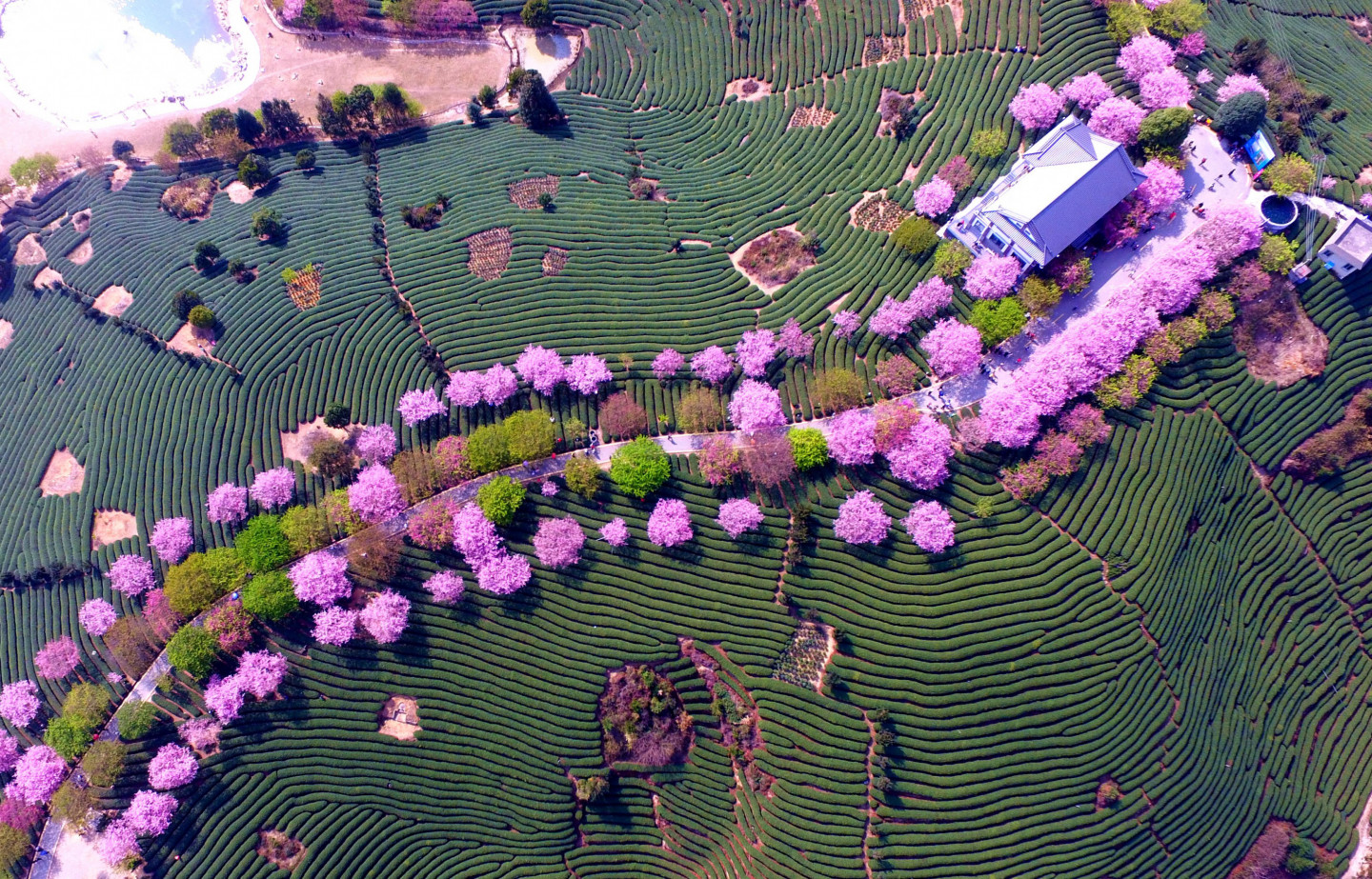 Pasakains skats! Ziedošie ķiršu koki Ķīnā no putna lidojuma