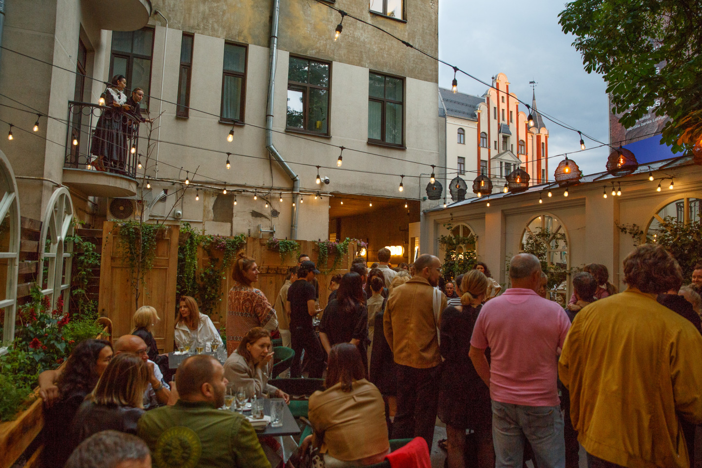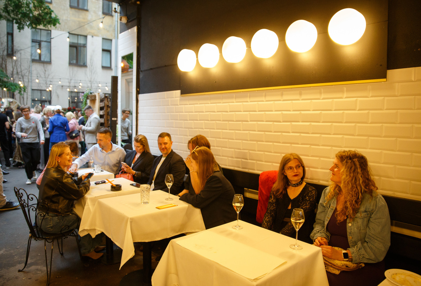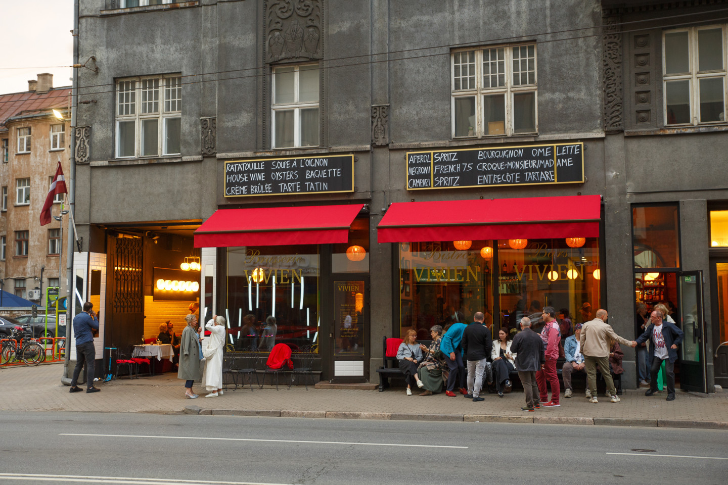 Ļaudis līksmo jaunā bāra "brasserie VIVIEN" atvēšanas svētkos