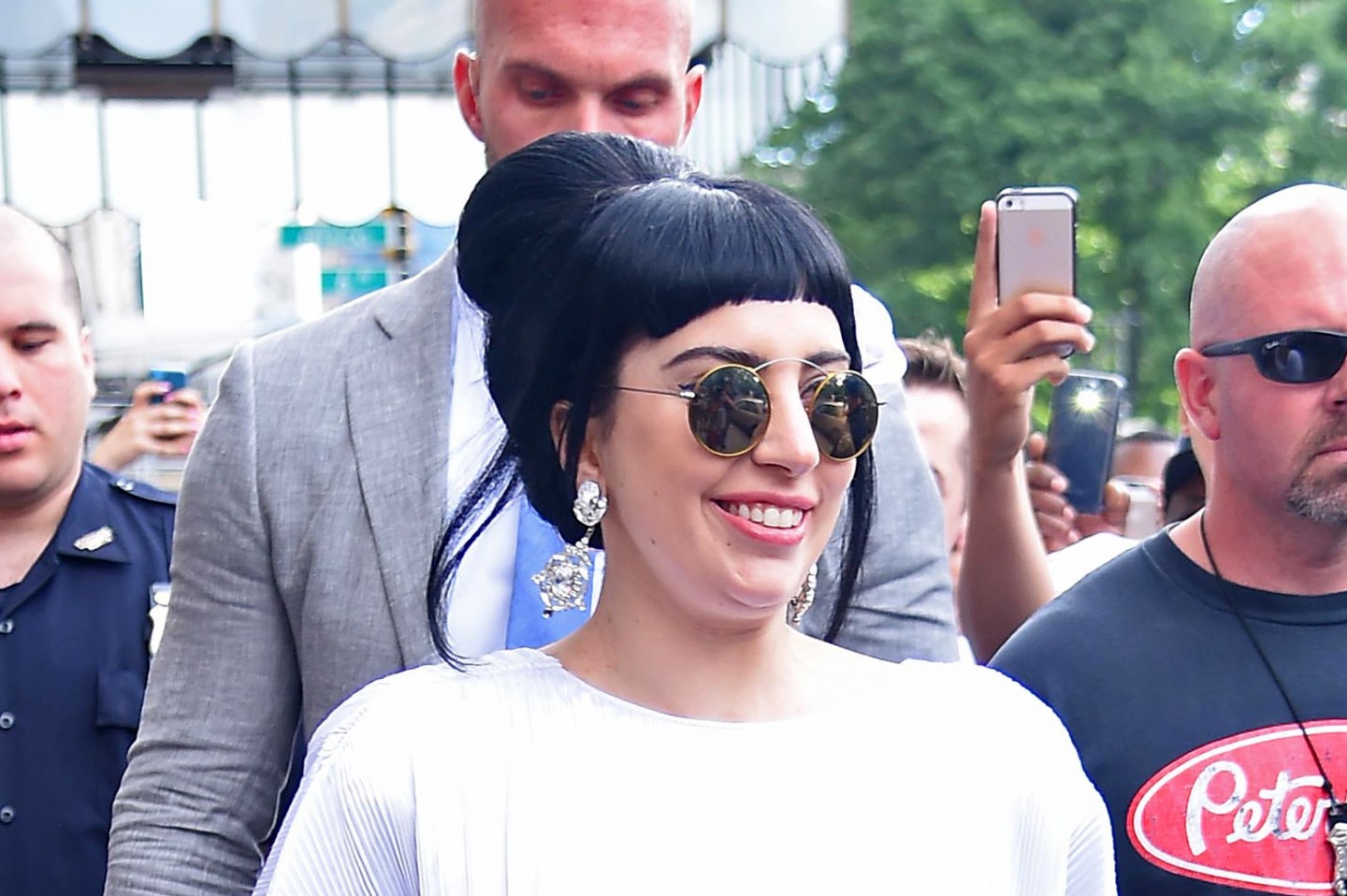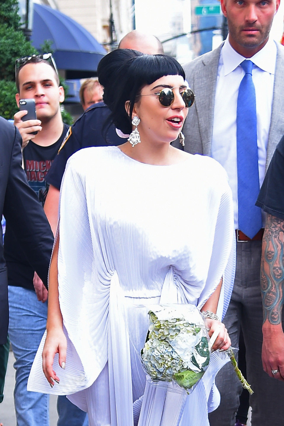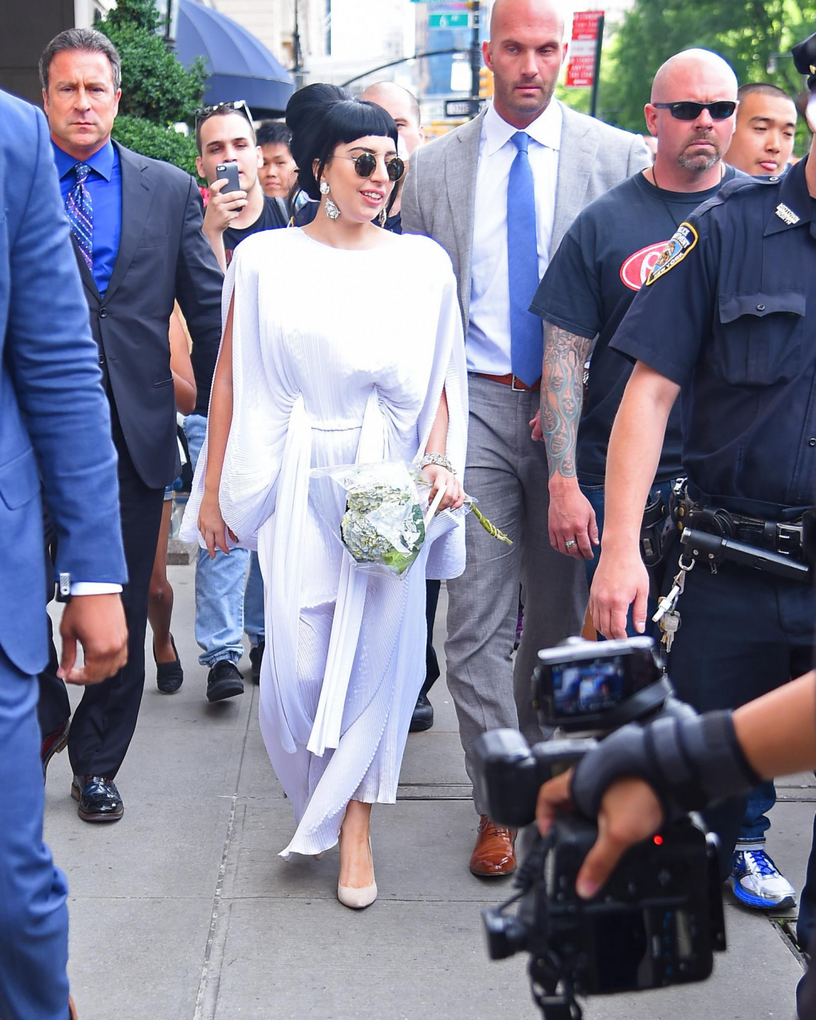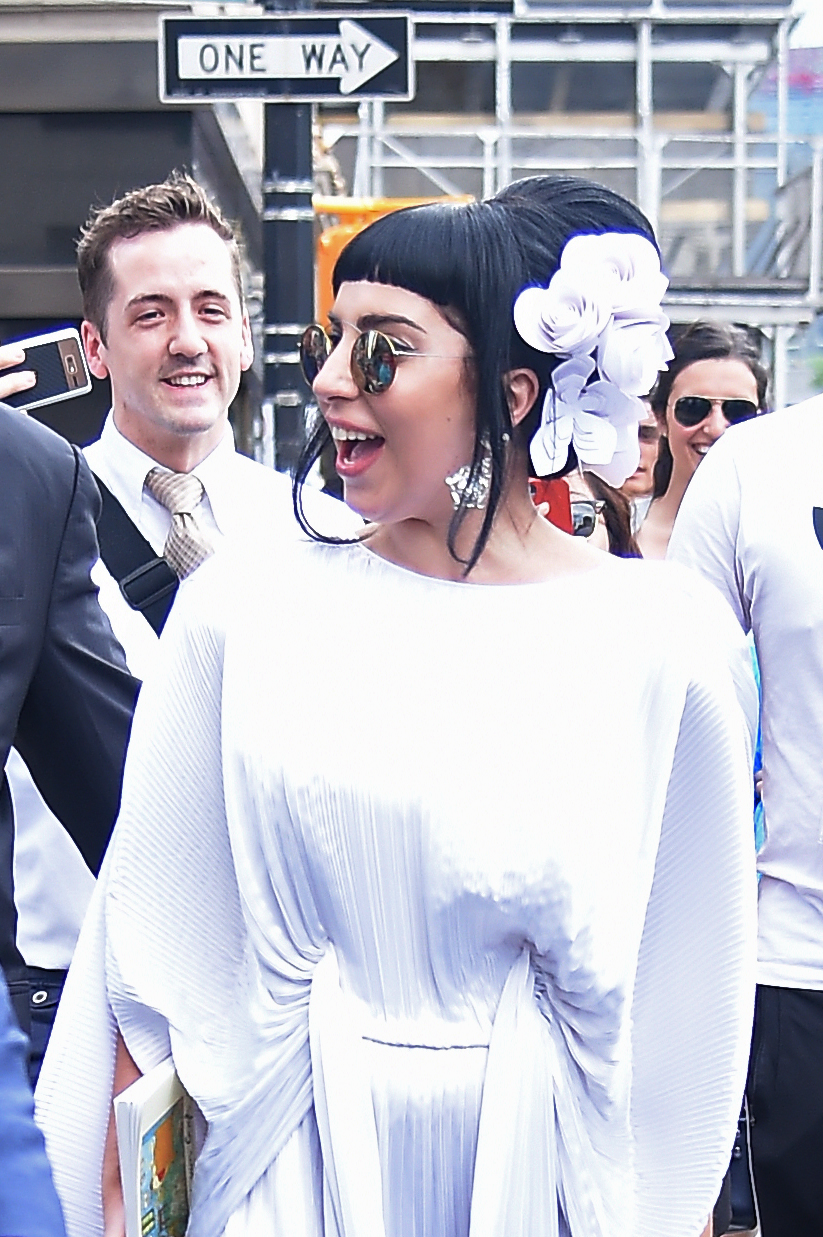 Ar neparasto ģērbšanās stilu slavenā Lēdija Gāga Ņujorkas ielās manīta pastaigājamies kāzu kleitai līdzīgā apģērbā- baltā kimono un ar pušķi rokās.