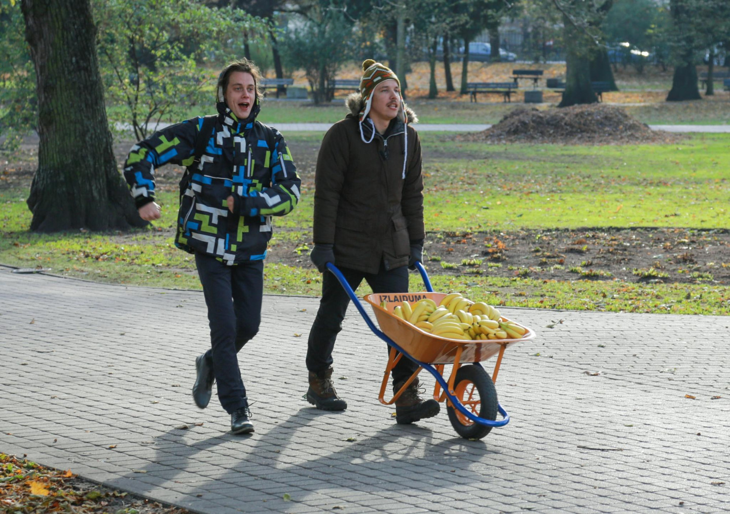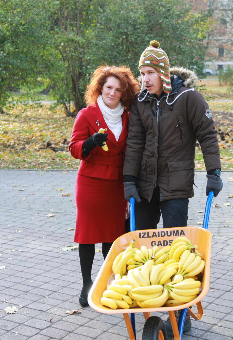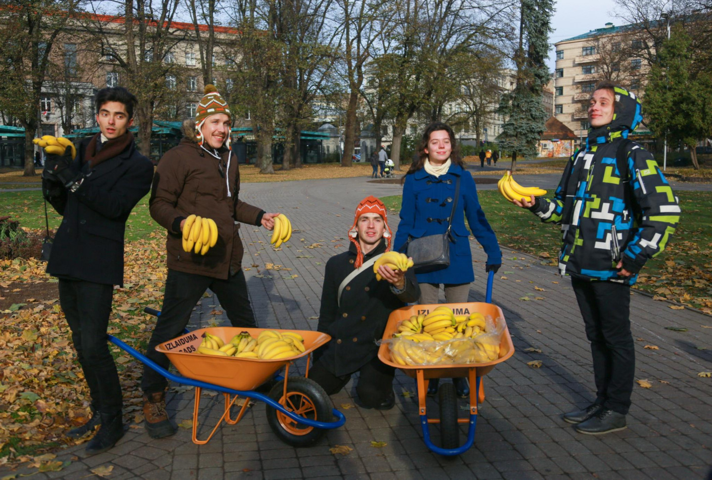 Ar mērķi popularizēt jauno latviešu mākslas filmu "Izlaiduma gads" tās radošā komanda sestdien Vērmanes dārzā piesaistīja interesentus dāvājot tiem bezmaksas banānus.