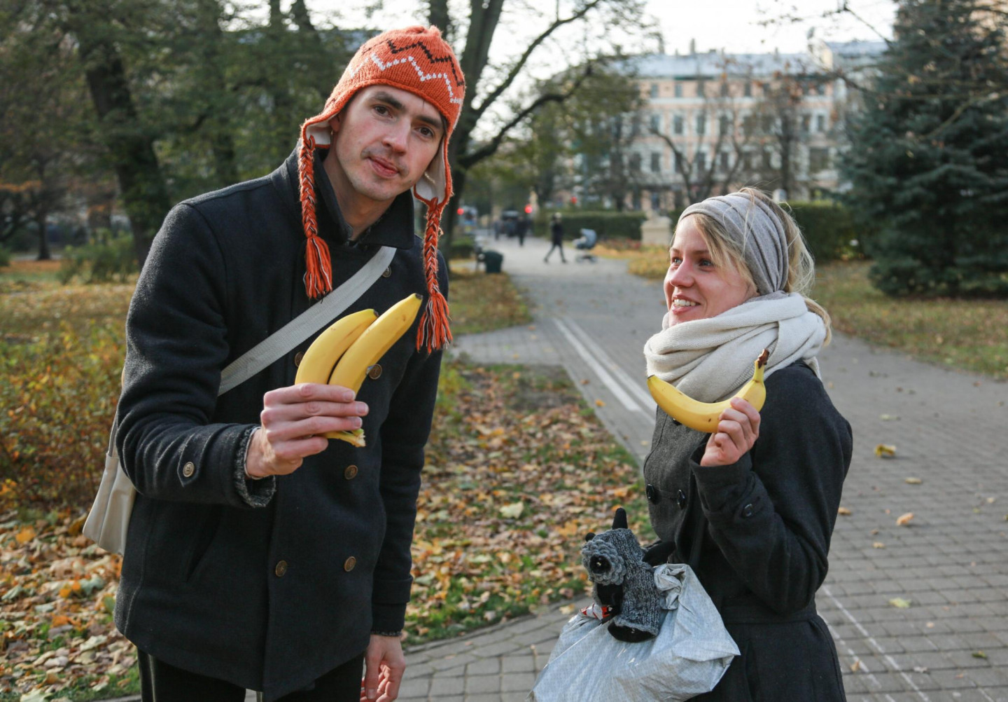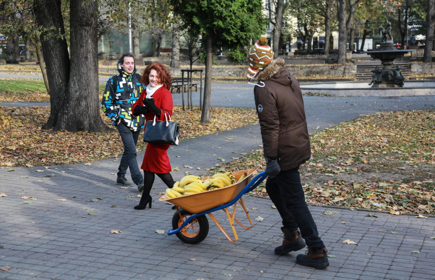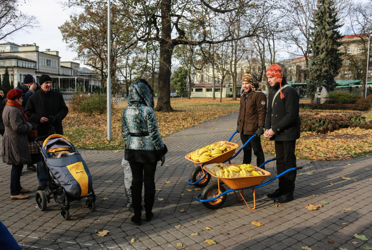 Ar mērķi popularizēt jauno latviešu mākslas filmu "Izlaiduma gads" tās radošā komanda sestdien Vērmanes dārzā piesaistīja interesentus dāvājot tiem bezmaksas banānus.