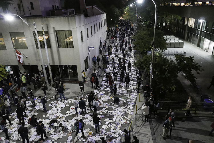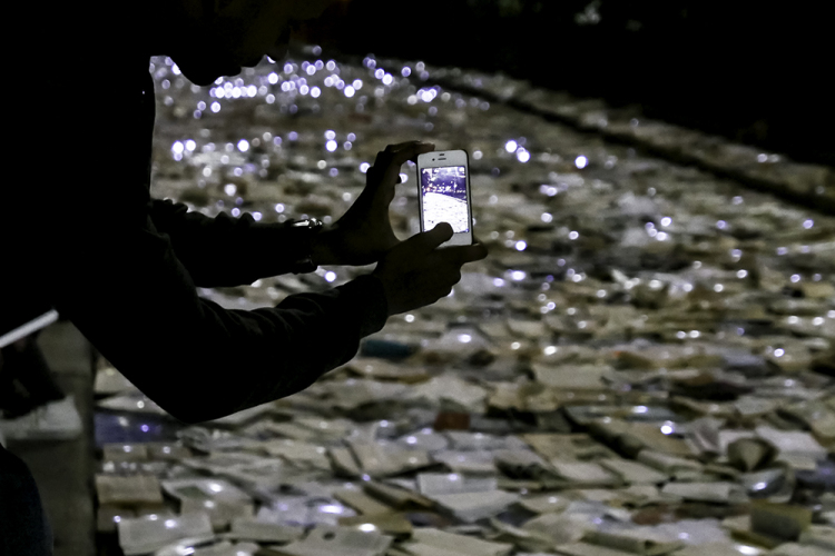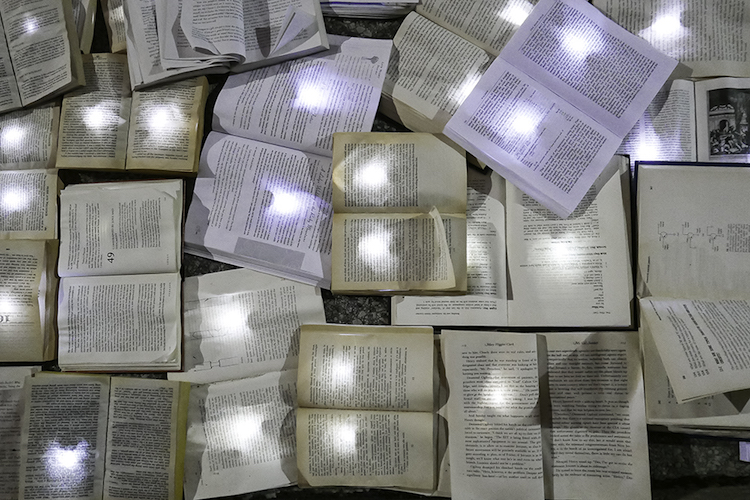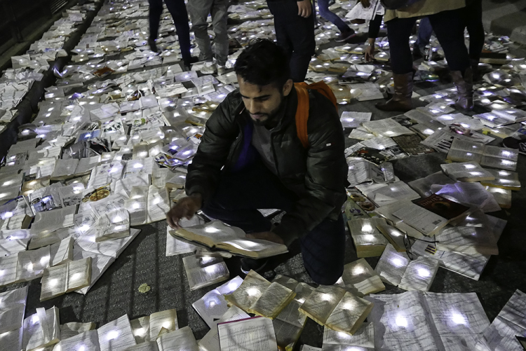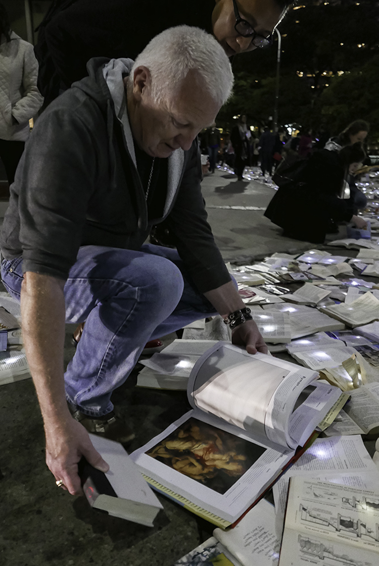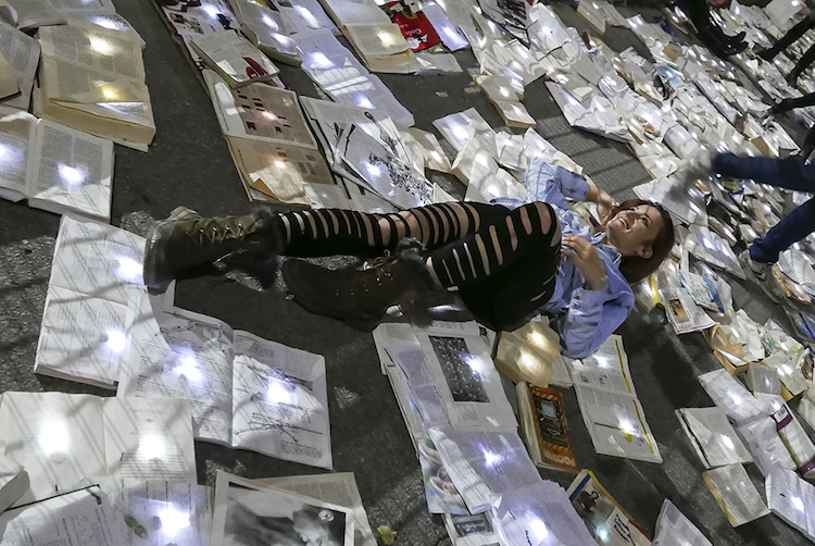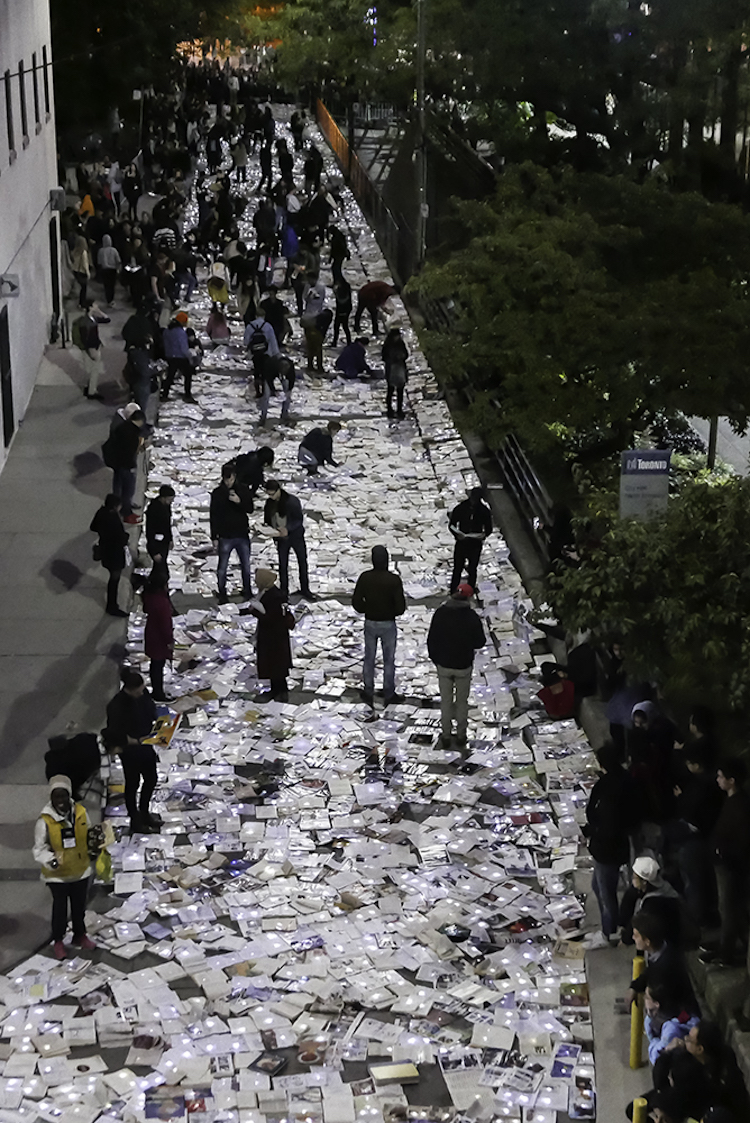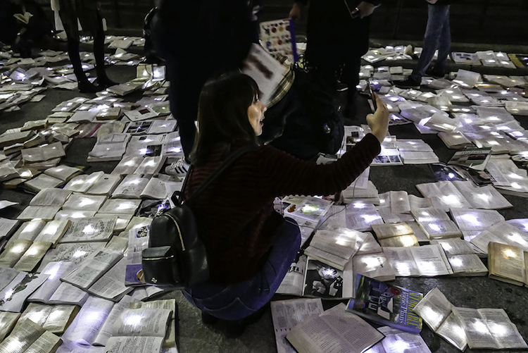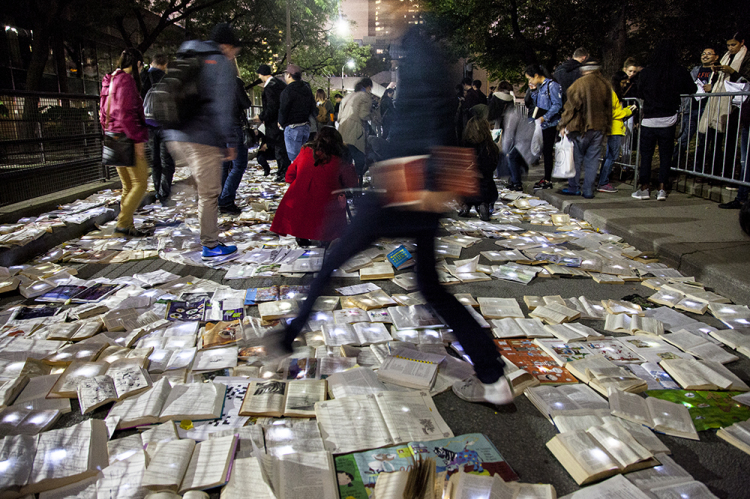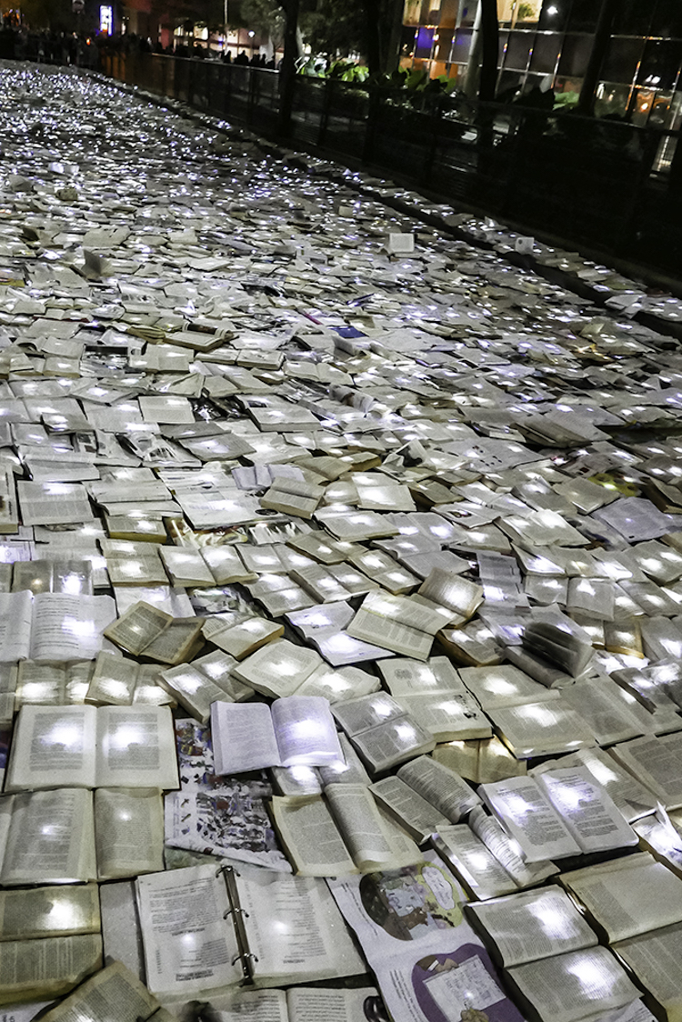 "Luzinterruptus" aktīvisti ASV pilsētā Toronto slēdza ielu, noklājot to ar 10 000 grāmatām. Akcijas mērķis ir skaļo un piesārņoto vietu vismaz uz vienu nakti pārvērst miermīlīgā pastaigā gar grāmatām.