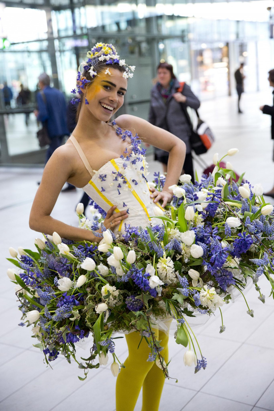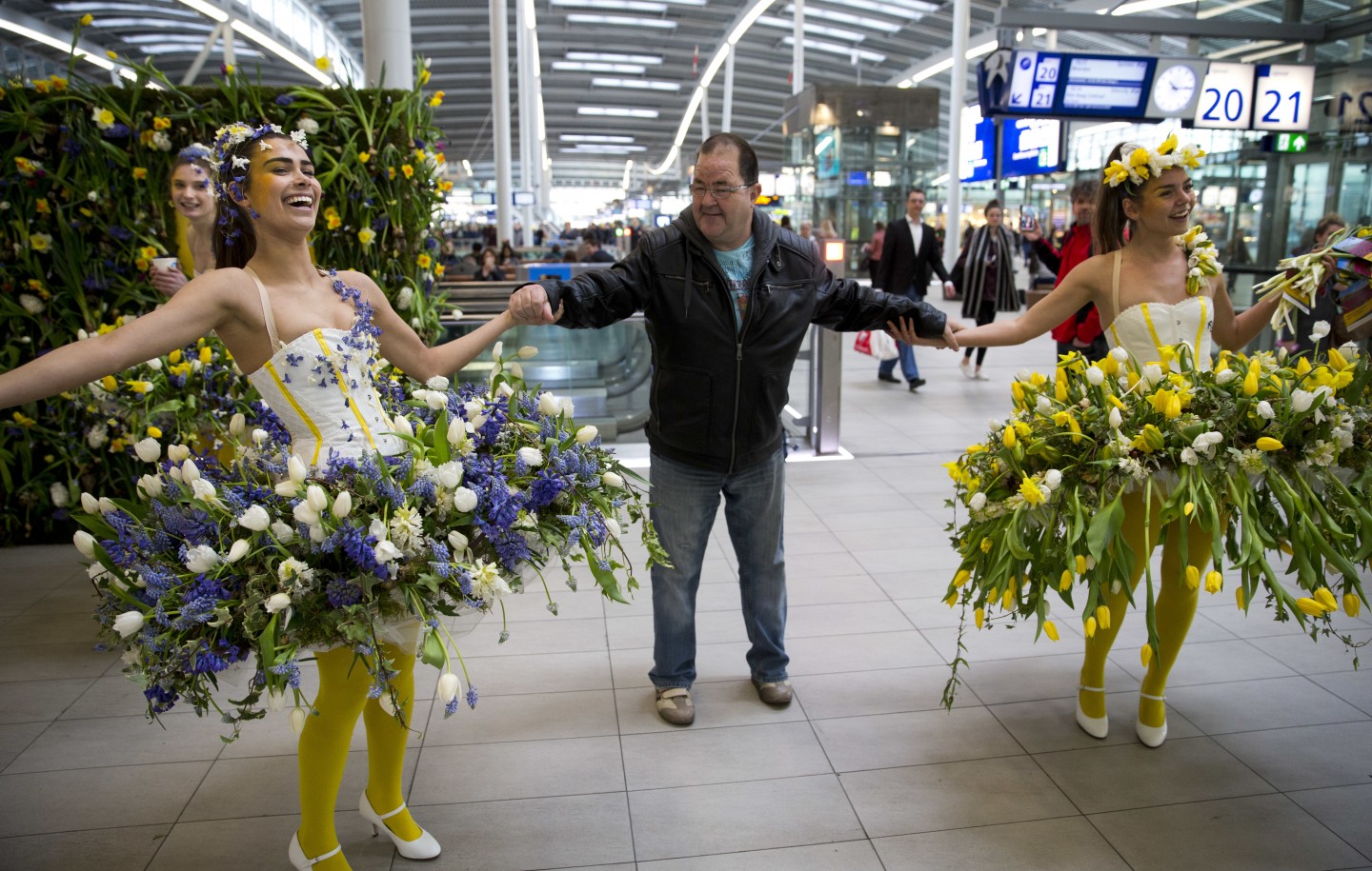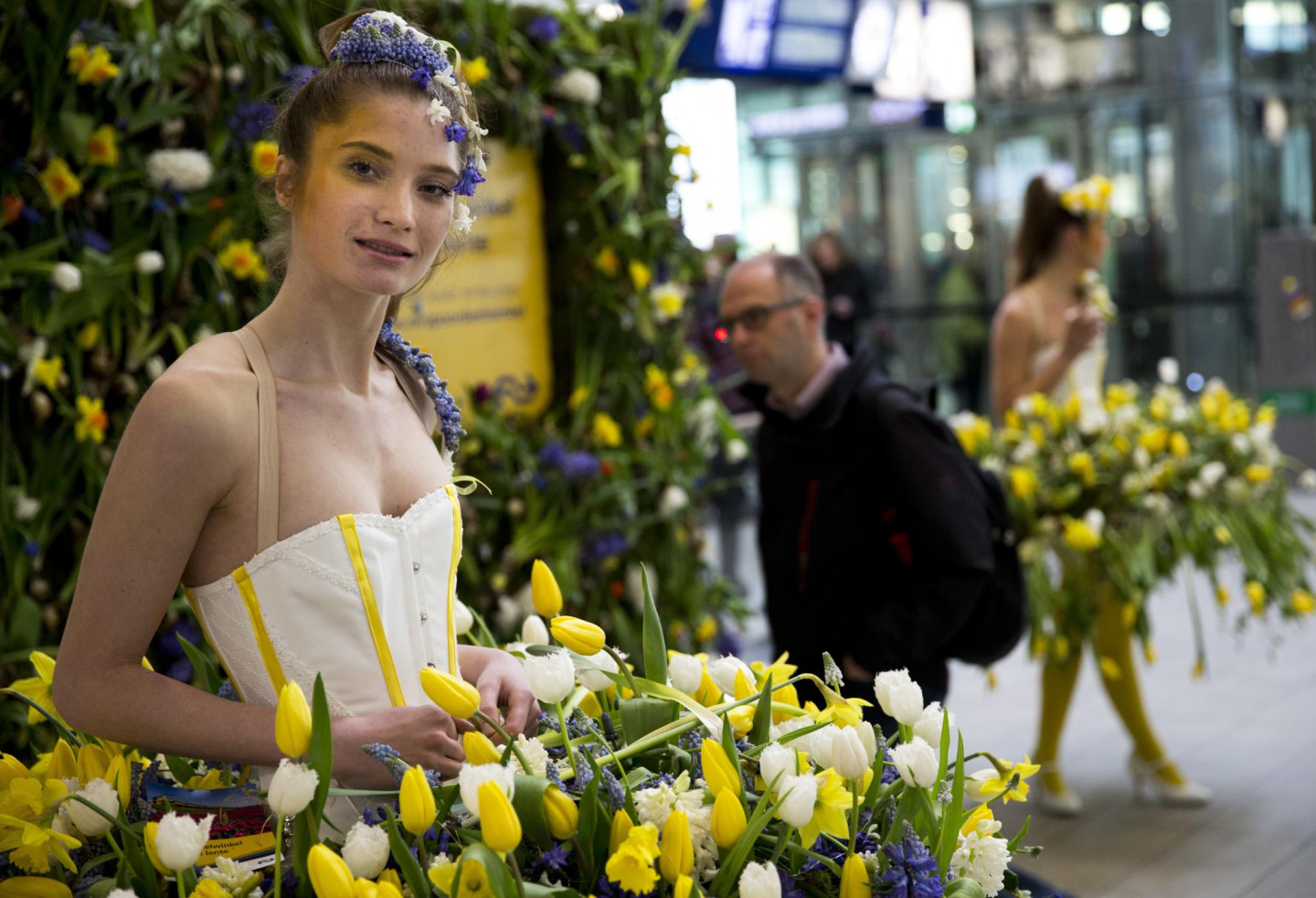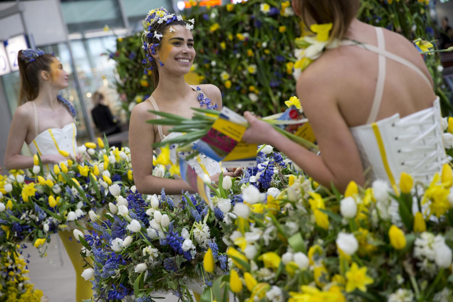 Ar ziediem rotātas sievietes Utrehtas dzelzceļa stacijā Nīderlandē pārsteidz tūristus. Akcija veikta, lai popularizētu Keukenhofu, kas ir Nīderlandes tulpju audzēšanas centrs.