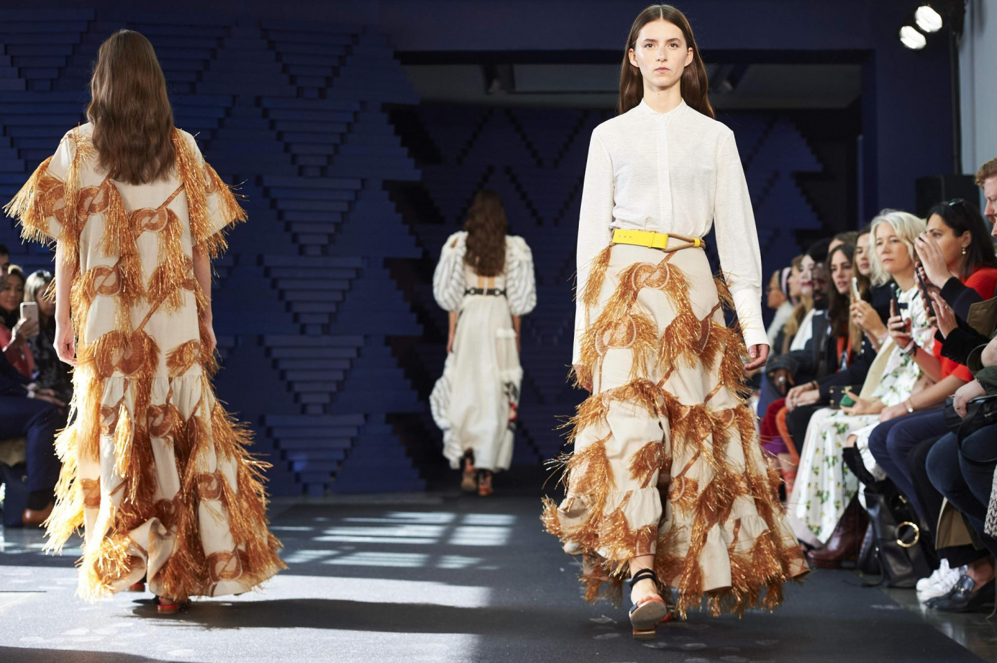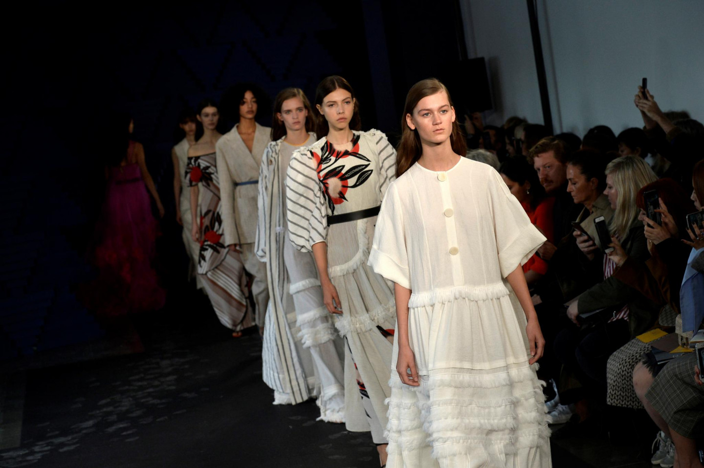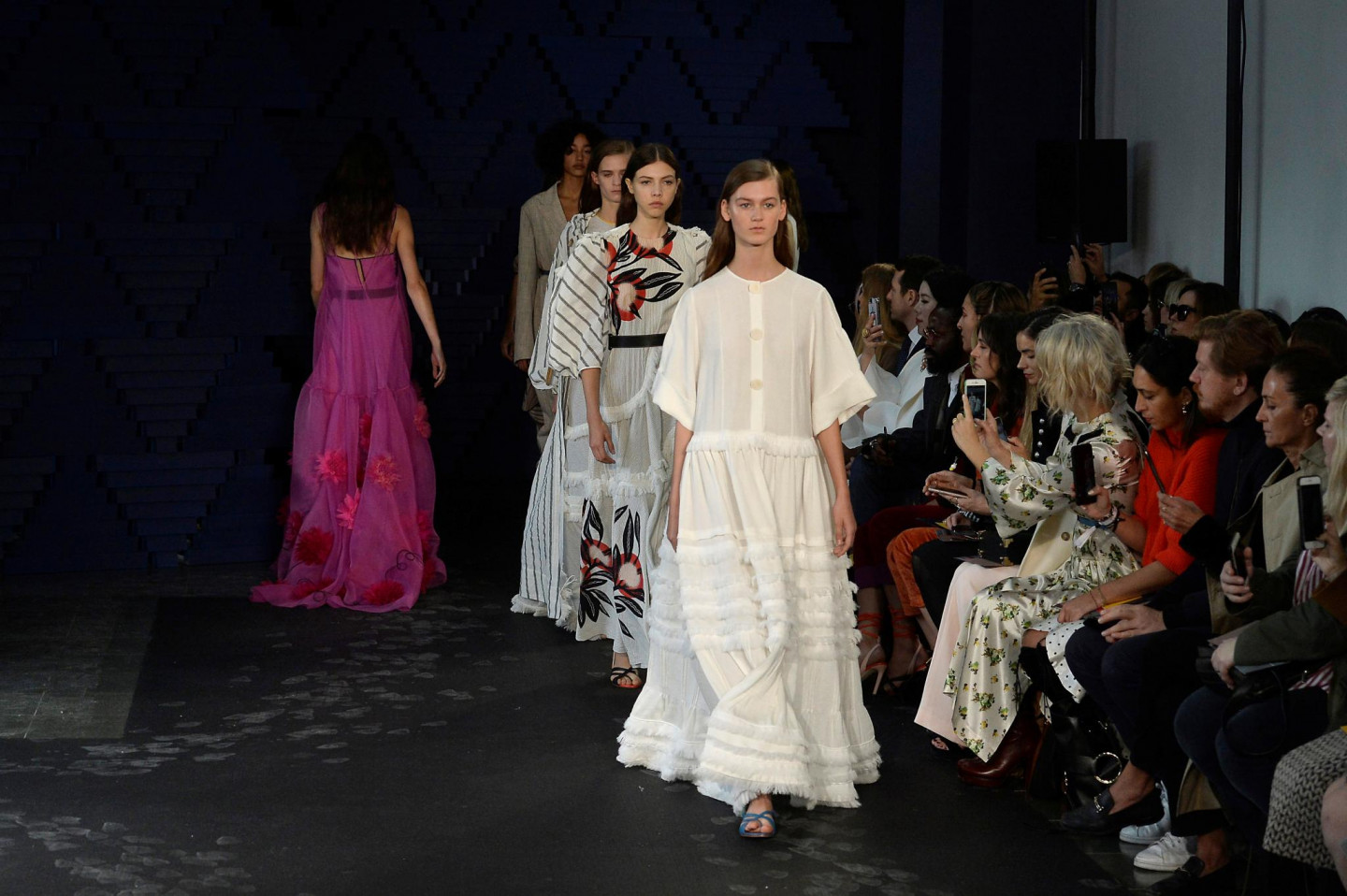 Londonas modes nedēļā demonstrēti tērpi, kas sagatavoti nākamās vasaras modes namu kolekcijām.