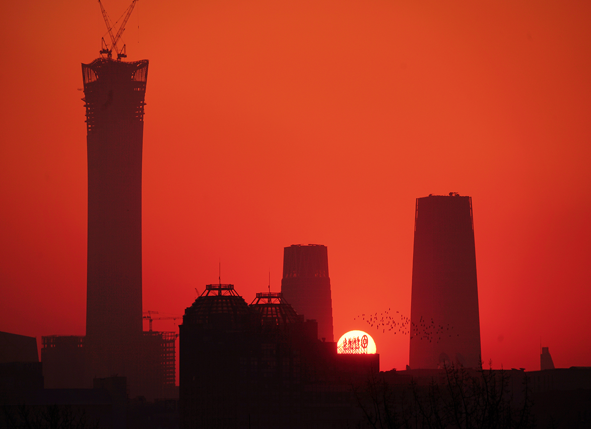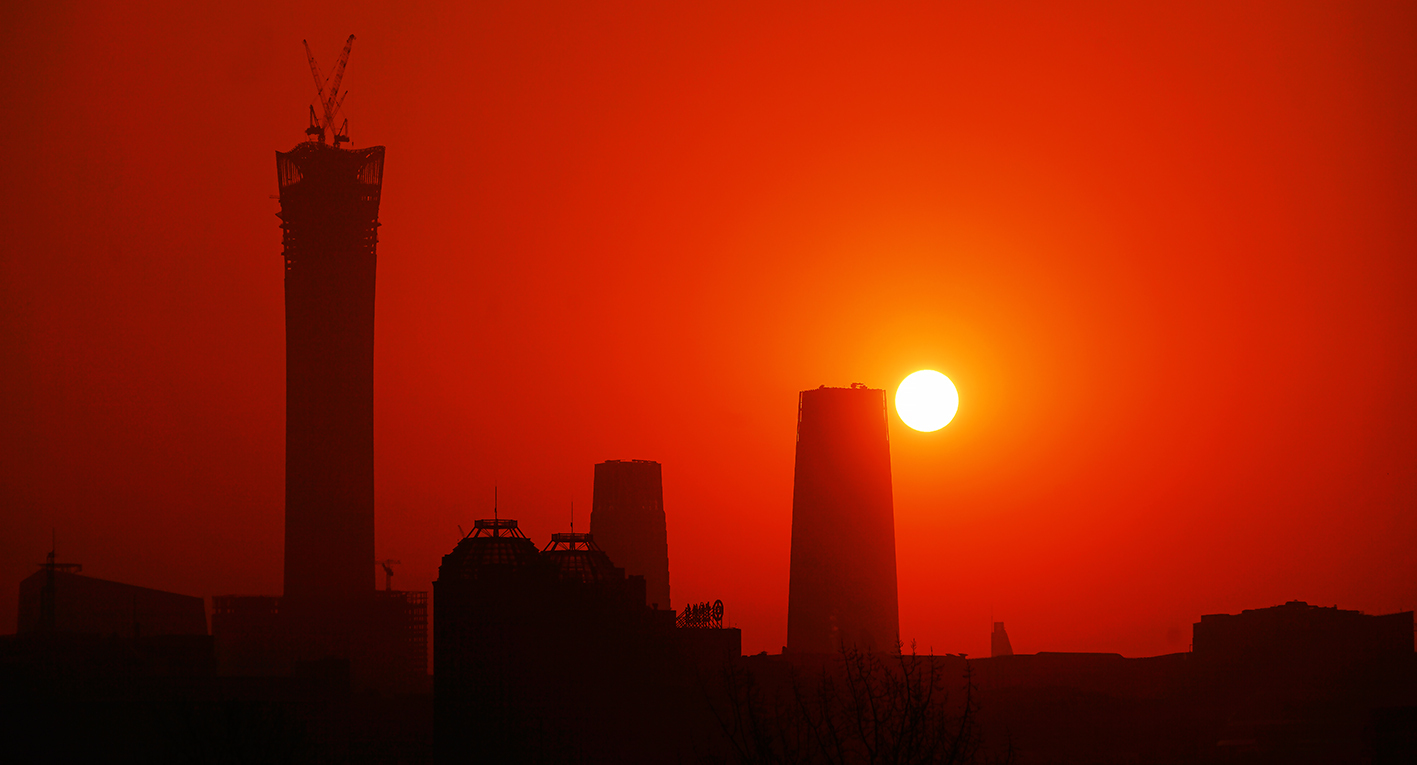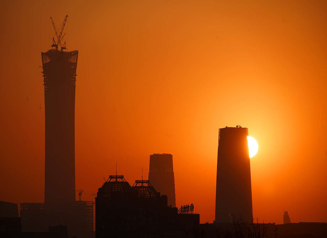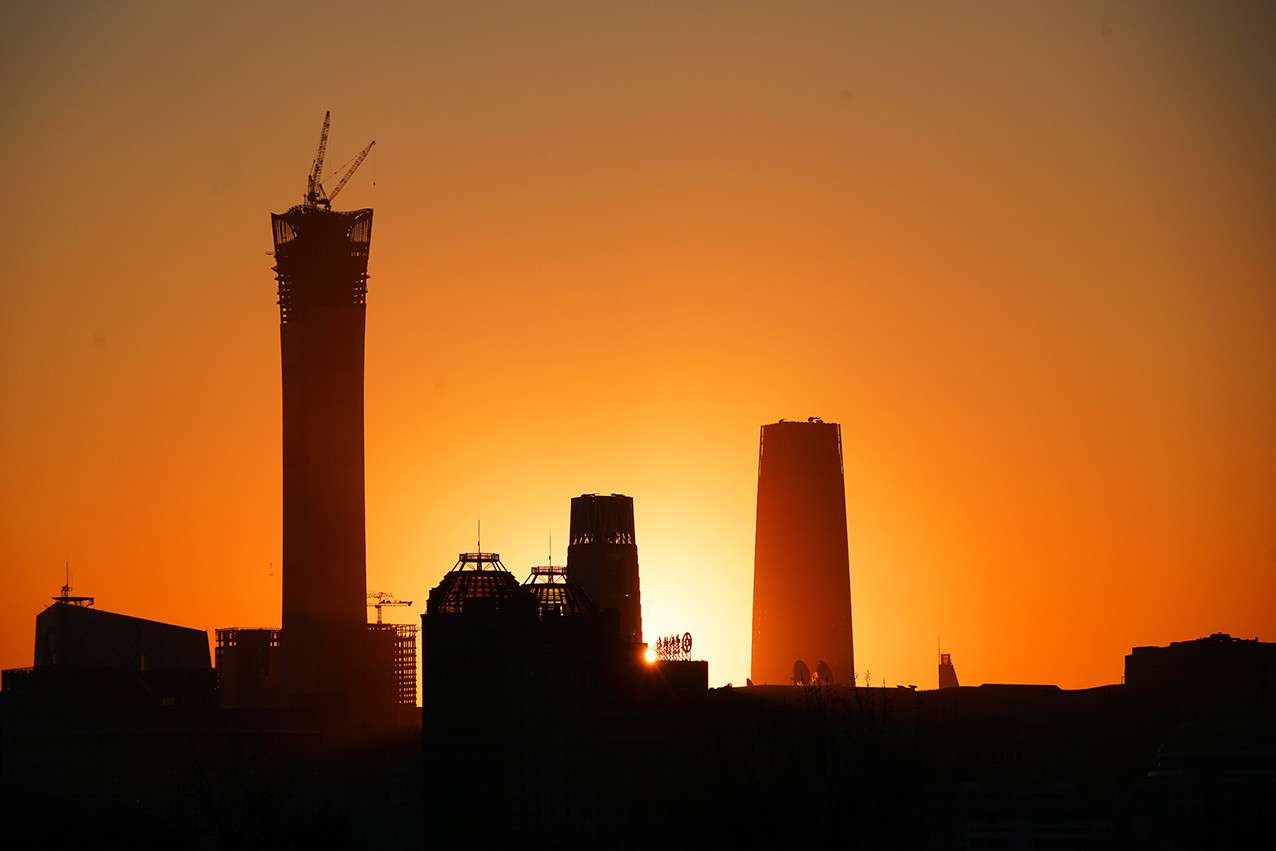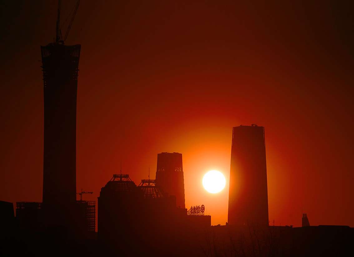 Pasakains saullēkts starp Pekinas augstceltnēm