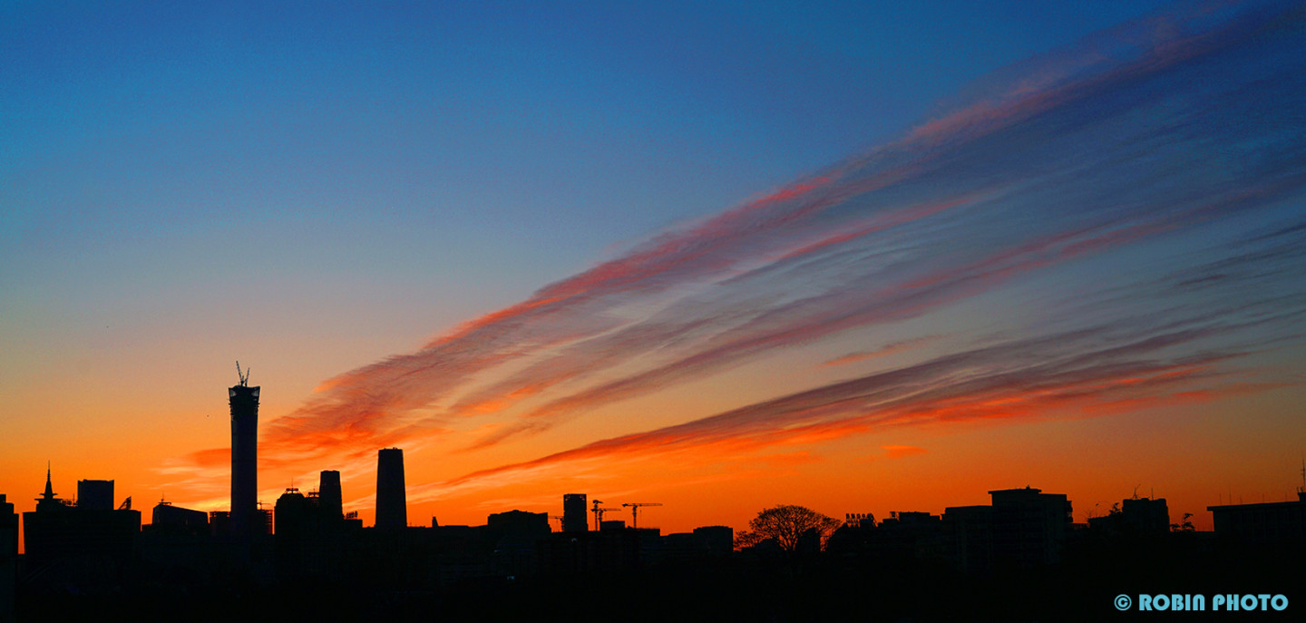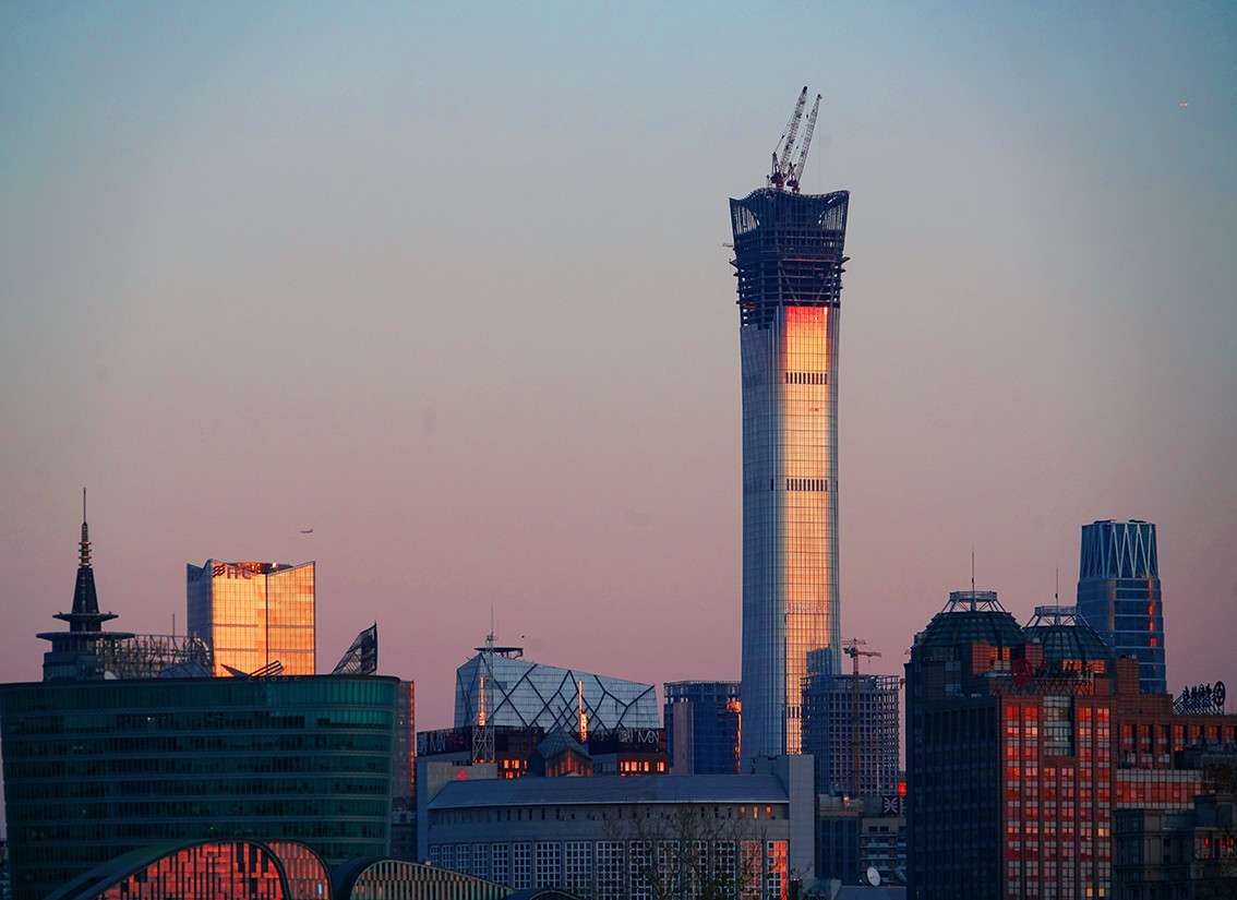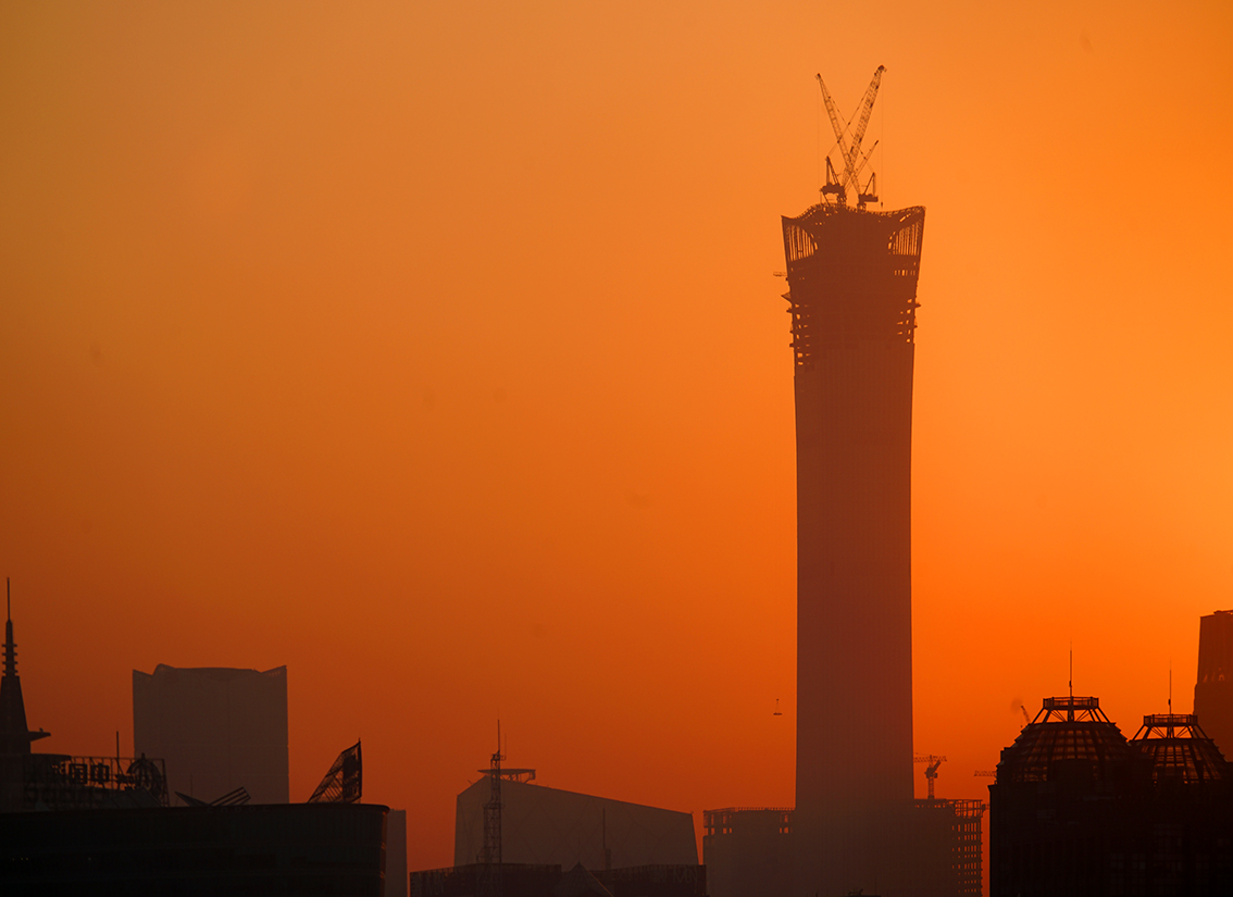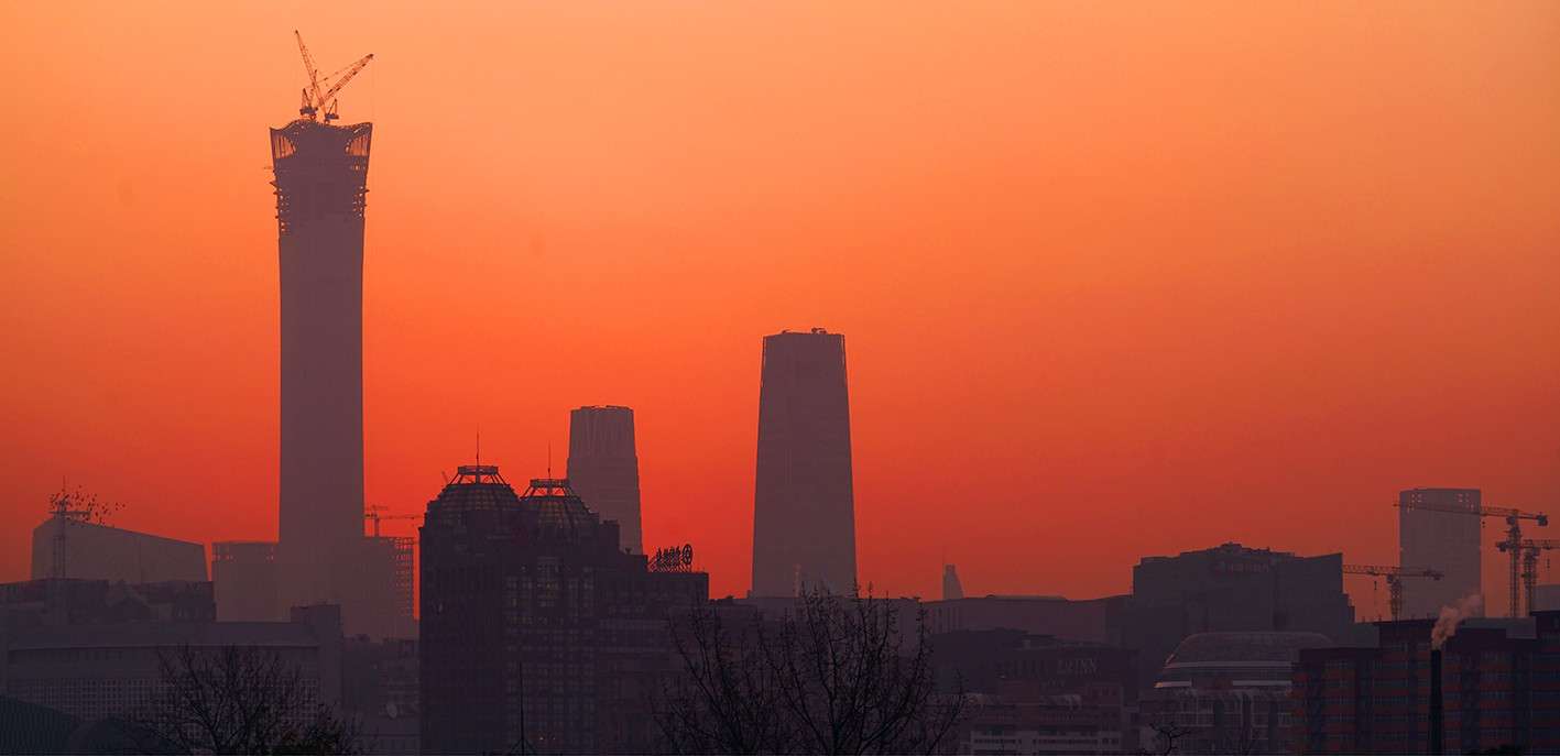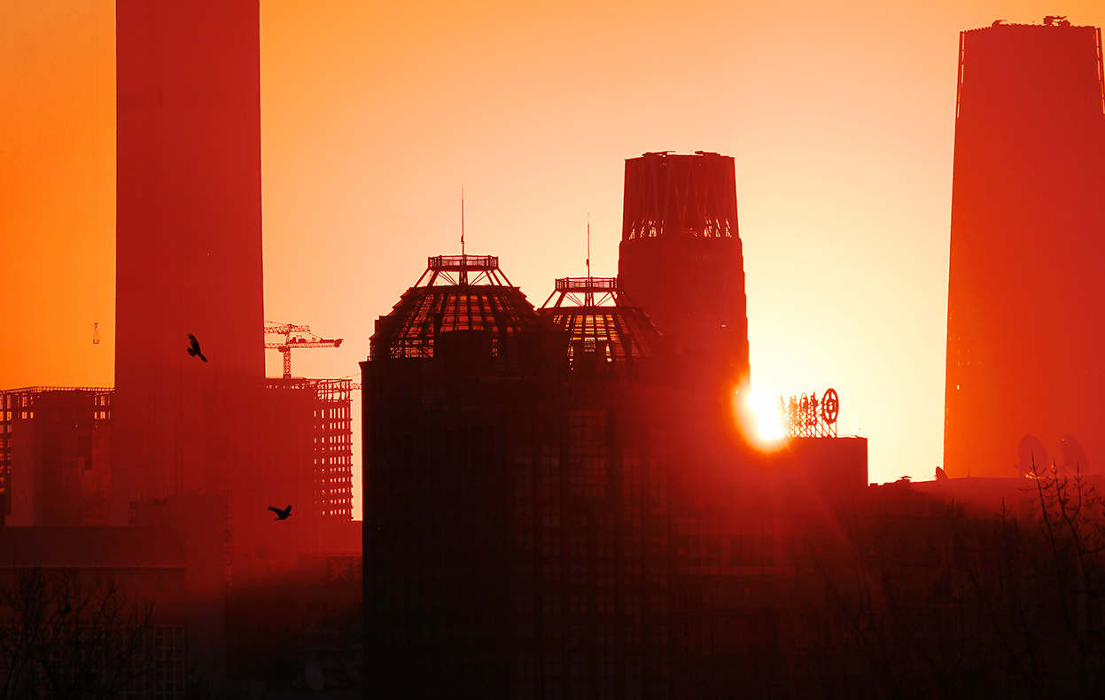 Pasakains saullēkts starp Pekinas augstceltnēm