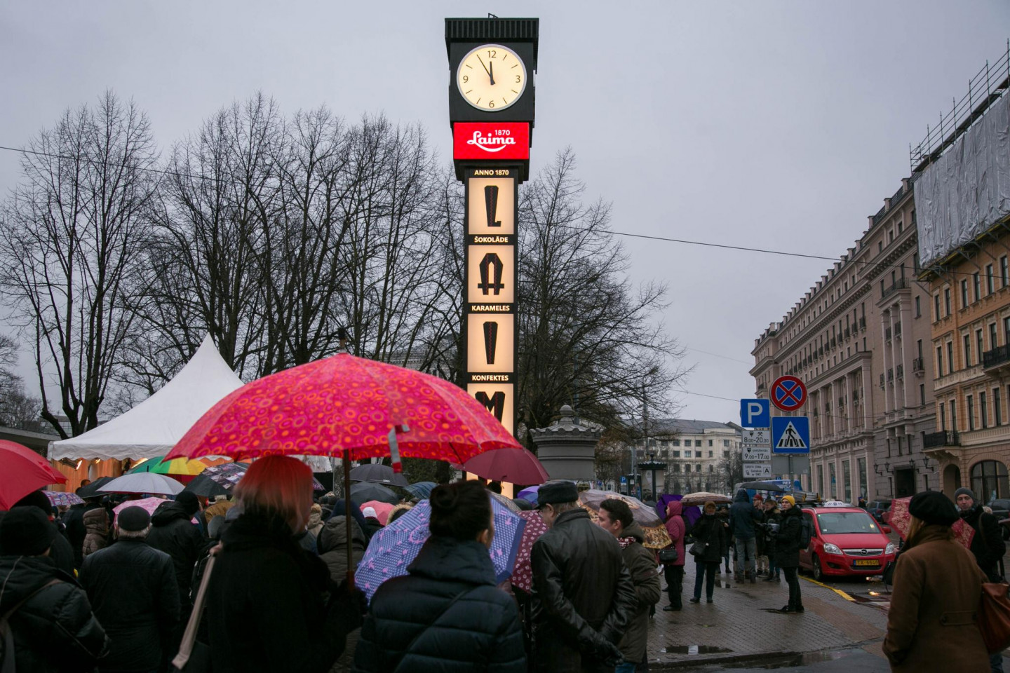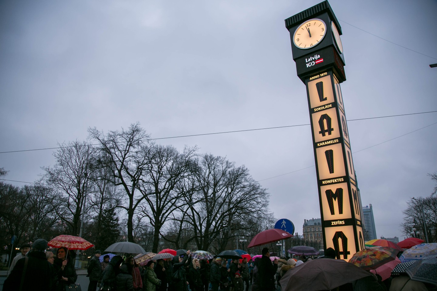 Pie Brīvības pieminekļa atklātā "Laima" pulksteņa rekonstrukcijas procesā vissarežģītāk bijis piemeklēt atbilstošu materiālu gaismas objektu aizsegšanai, aģentūrai LETA atzina pulksteņa dizaineris Arvis Sproģis. "Pati pulksteņa uzbūve ir sarežģīta, jo tas sastāv no vairākām daļām. Tam ir kristāla stikla korpuss, kurš izskatās gan matēts, gan daļēji laminēts un nepieciešams panākt, ka gaisma caur šo stiklu spīd tā, ka pats gaismas izstarotājs nav redzams. Ar šīs funkcijas realizēšanu mēs ļoti ilgi eksperimentējām, lai rezultāts būtu tieši tāds, kā esam iedomājušies," sacīja Sproģis. "Šāda apmēra rekonstrukcija normālos apstākļos būtu jāveic vismaz divus mēnešus. Mēs to izdarījām mēneša laikā," atzina dizaineris, norādot, ka, lai gan sadarbība ar uzņēmējiem sākta savlaicīgi, darba termiņš bijis vien mēnesis "apstākļu sakritības dēļ". Pulksteņa rekonstrukcijas procesā kopumā piedalījušies vismaz 30 cilvēki. Viena no pulksteņa jaunajām funkcijām ir laika atskaites veikšana līdz Latvijas simtgadei - 2018.gada 18.novembra plkst.17. Šāds laiks izvēlēts, jo tieši plkst.17, 1918.gada 18.novembrī, pašreizējā Latvijas Nacionālajā teātrī tika parakstīta deklarācija par Latvijas valsts dibināšanu. Tāpat turpmāk katrā apaļajā stundā pulkstenis atskaņos kādu no 24 Raimonda Paula melodijām, kuras maestro ierakstījis speciāli šim notikumam. Kā pirmā atklāšanas ceremonijā plkst.12 skanēja "Cielaviņa". Pulksteņa atklāšanas ceremonijā piedalījās kultūras ministre Dace Melbārde, "Orkla Confectionery & Snacks Latvija" valdes priekšsēdētājs Toms Didrihsons, pulksteņa jaunā veidola dizaineris Arvis Sproģis un maestro Pauls. Pēdējo reizi pulkstenim pilna rekonstrukcija veikta 1999.gadā, kam sekojušas vēl dažas kosmētiskās apkopes. Kopumā rekonstrukcijas procesā ieguldīti vairāk nekā 106 000 eiro.