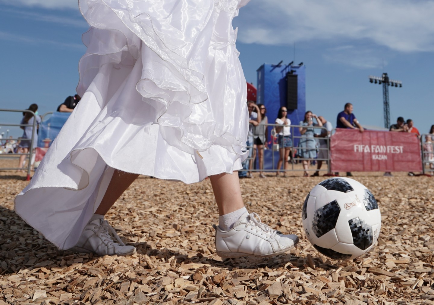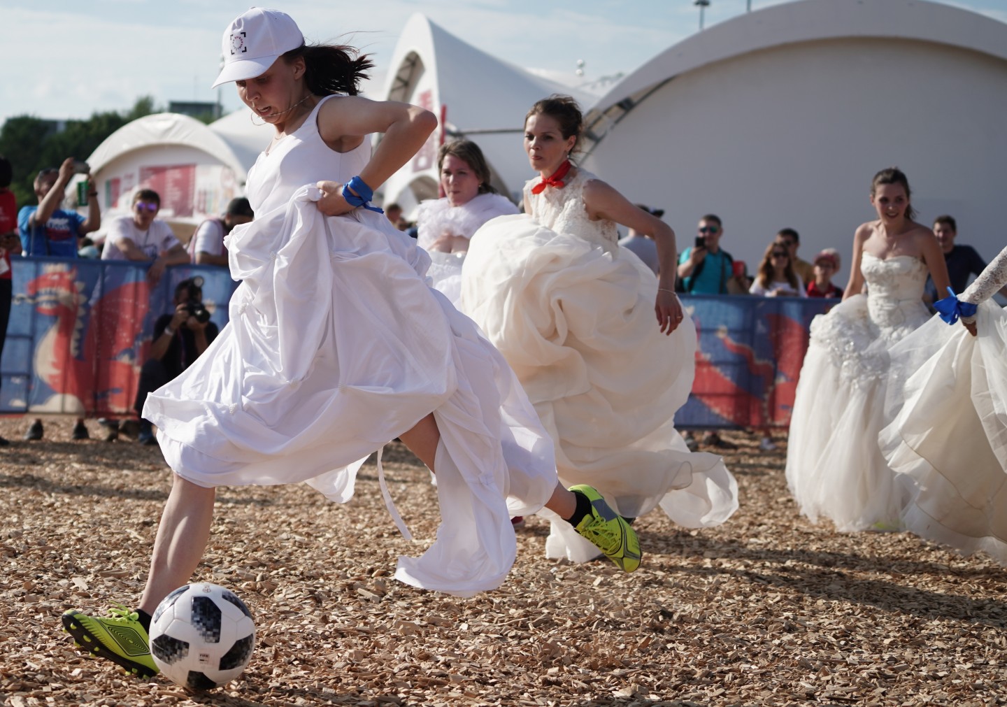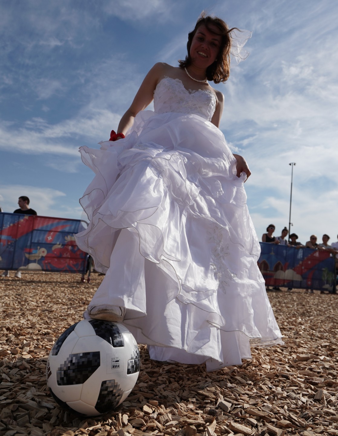 Laikā, kad pasaules kausā futbolā Maskavā cīnās labākās komandas, savu spēli pludmalē sarīkojušas arī līgavas kāzu kleitās.