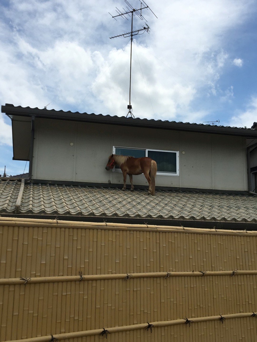 Pēc tam, kad plūdi pārņema Japānas pilsētas Kurašiki rajonu Mabičo, uz kādas ēkas jumta nonāca maza izmēra zirgs. Par laimi, to izdevās veiksmīgi izglābt.