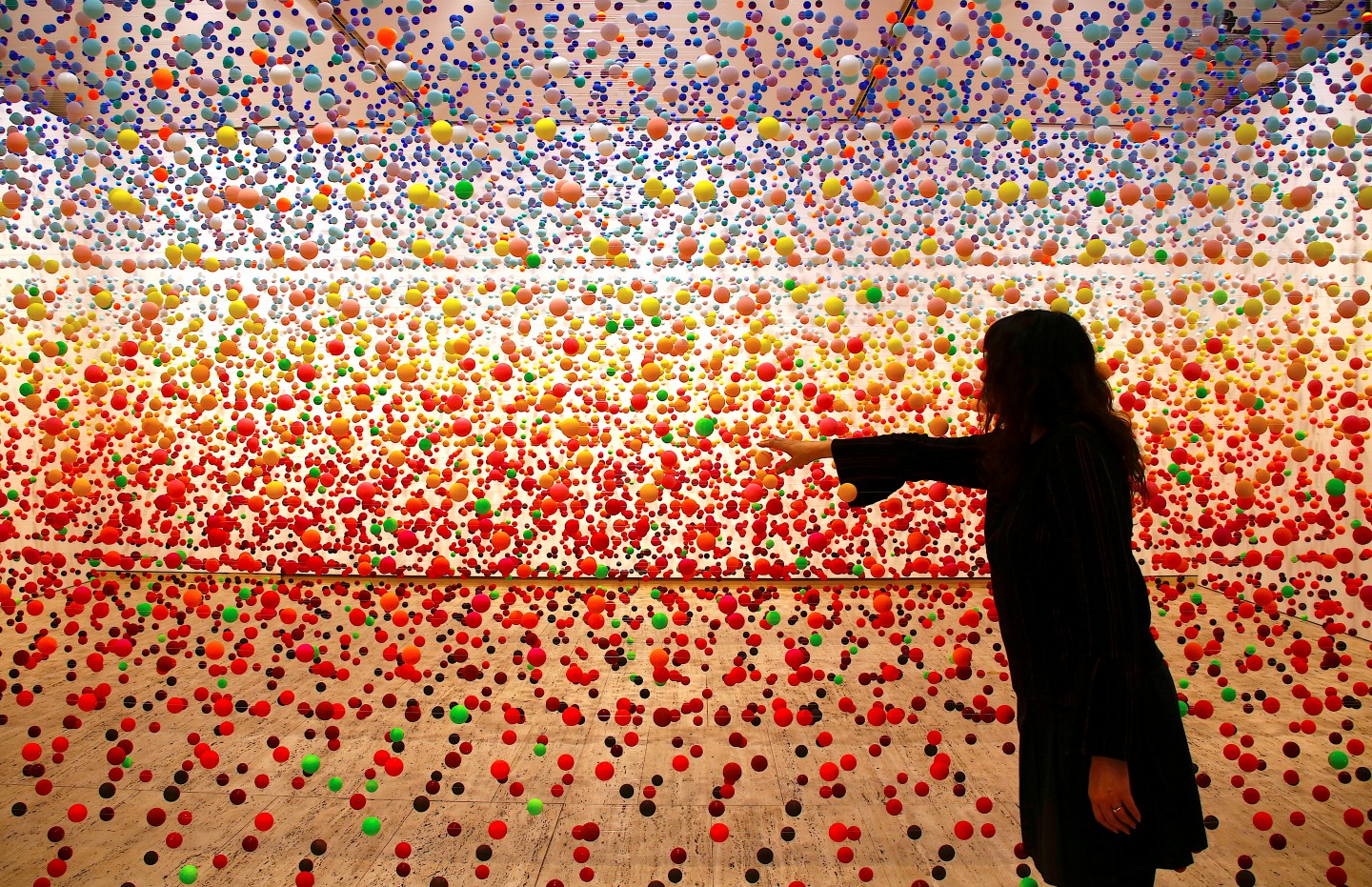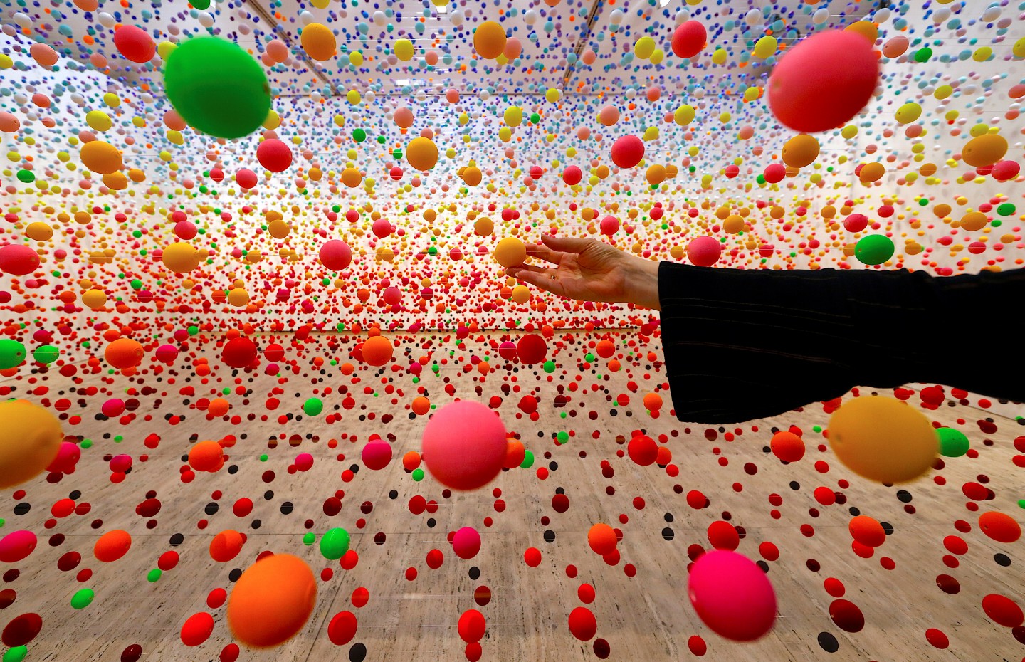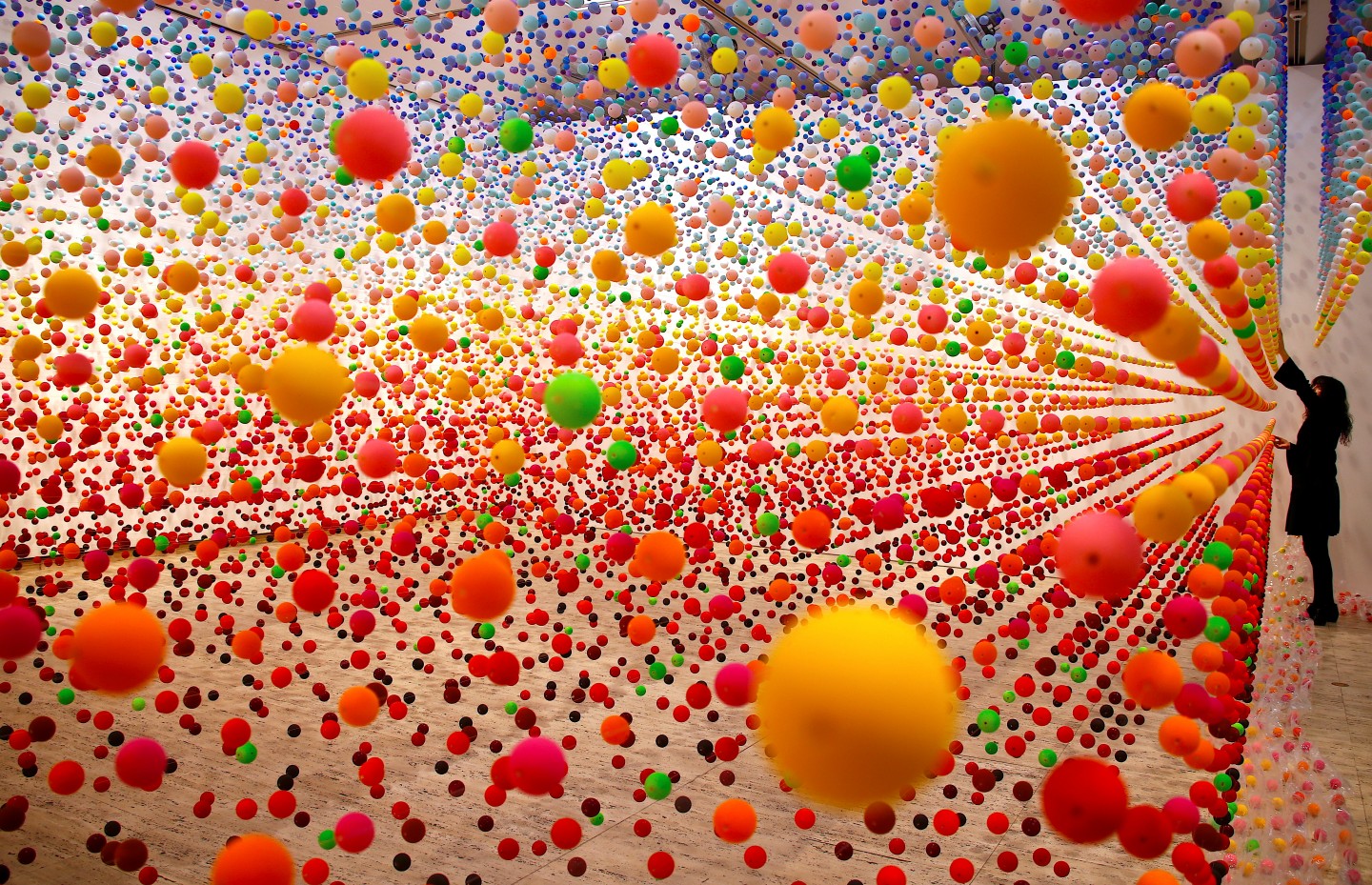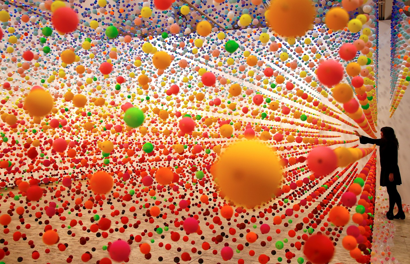 Mākslinieks Nike Savass no 50 000 polistirola bumbiņām radījis mākslas instalāciju ''Atomic: full of love full of wonder''. Tā apskatāma Sidnejas mākslas galerijā.