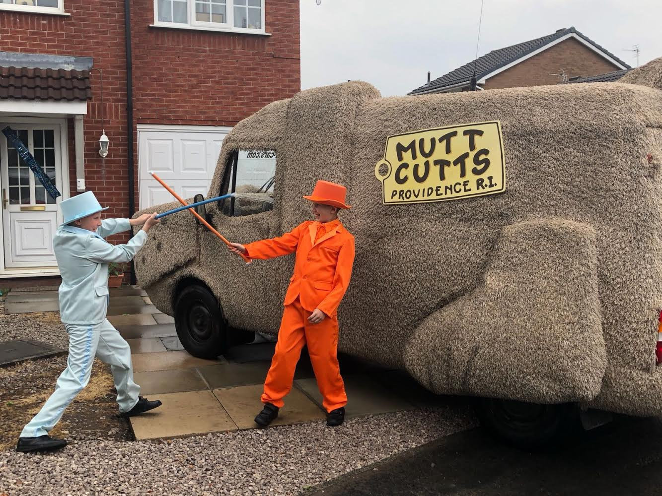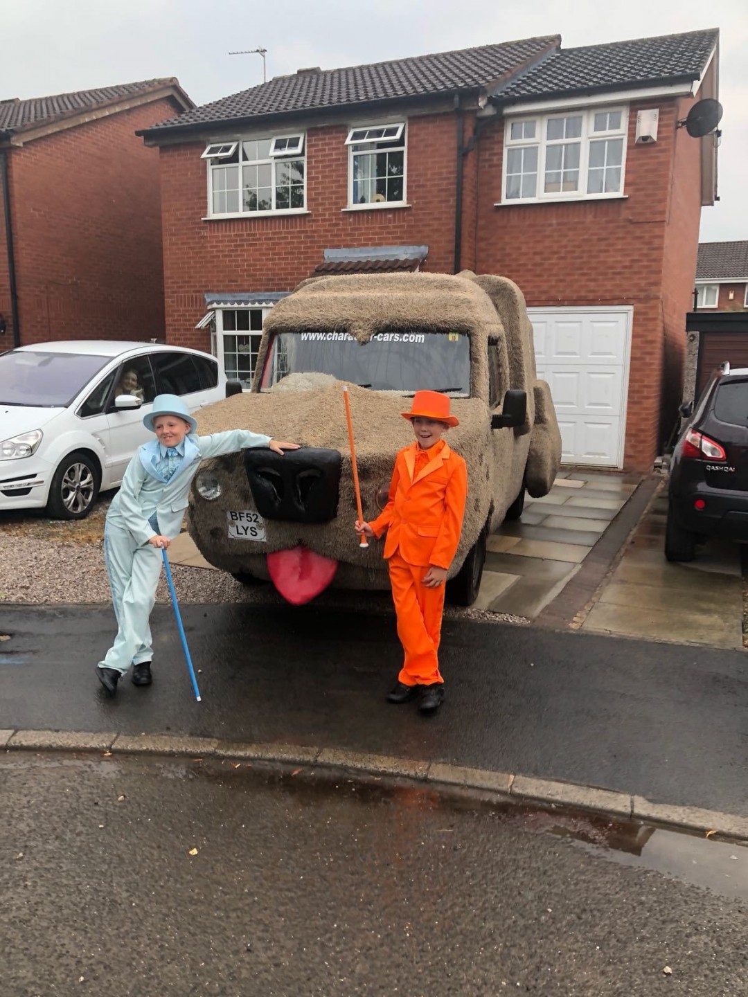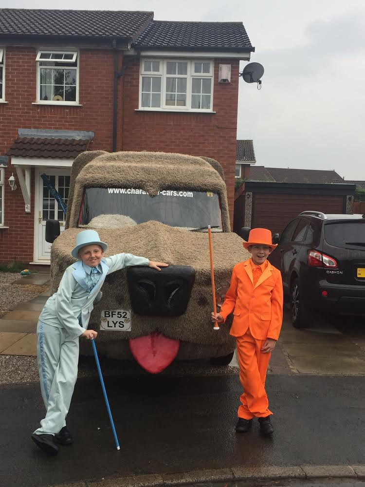 Divi jauni puikas Anglijā uz skolas pasākumu ieradās patiešām grandiozi- viņa atbrauca ar auto, kas veidots kā kopija filmā "Stulbs un vēl stulbāks" redzamajam spēkratam.