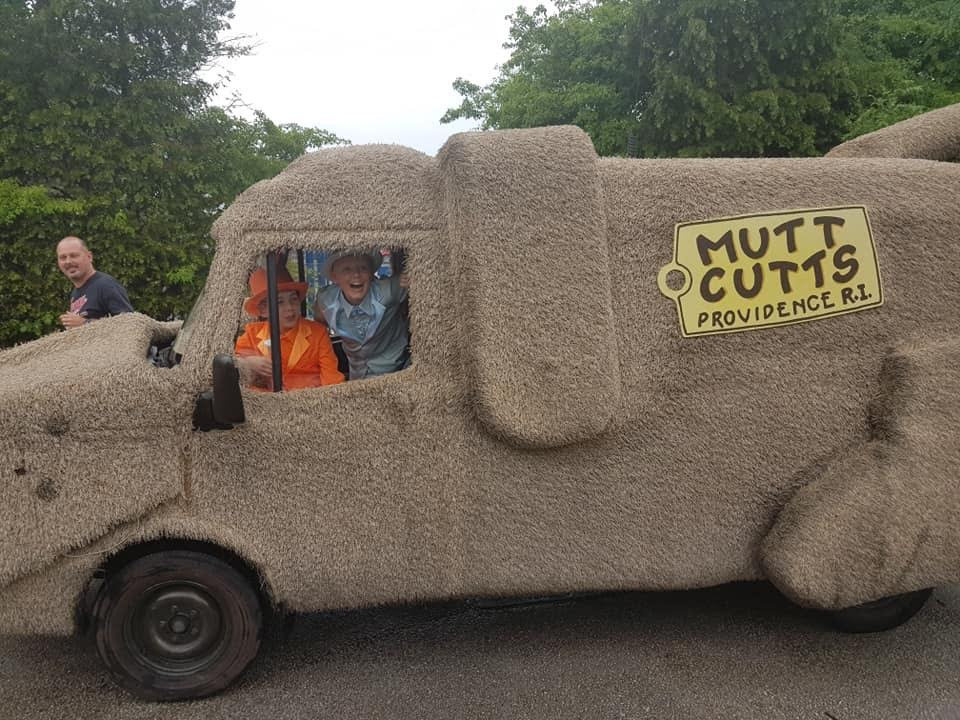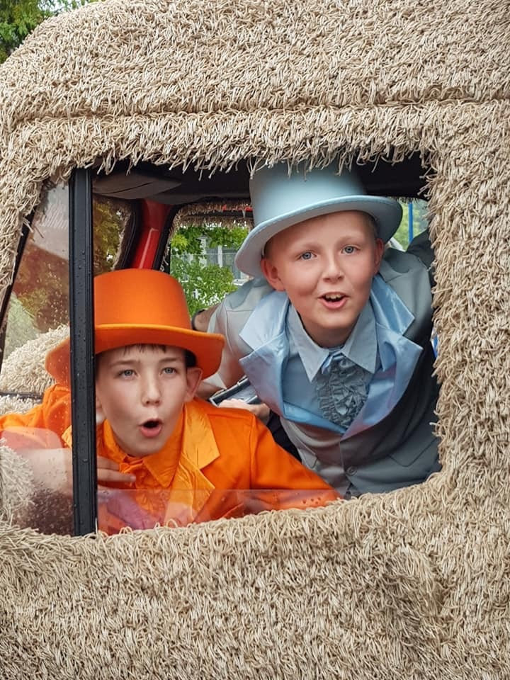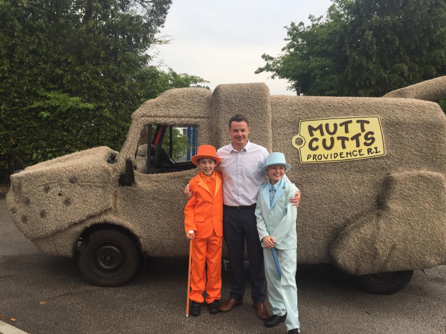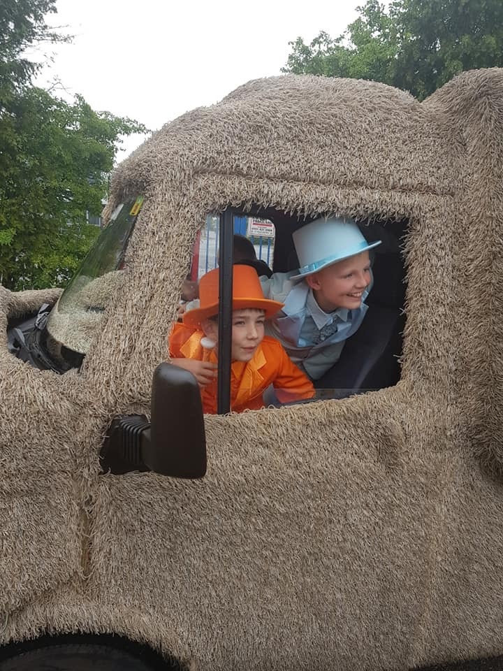 Divi jauni puikas Anglijā uz skolas pasākumu ieradās patiešām grandiozi- viņa atbrauca ar auto, kas veidots kā kopija filmā "Stulbs un vēl stulbāks" redzamajam spēkratam.