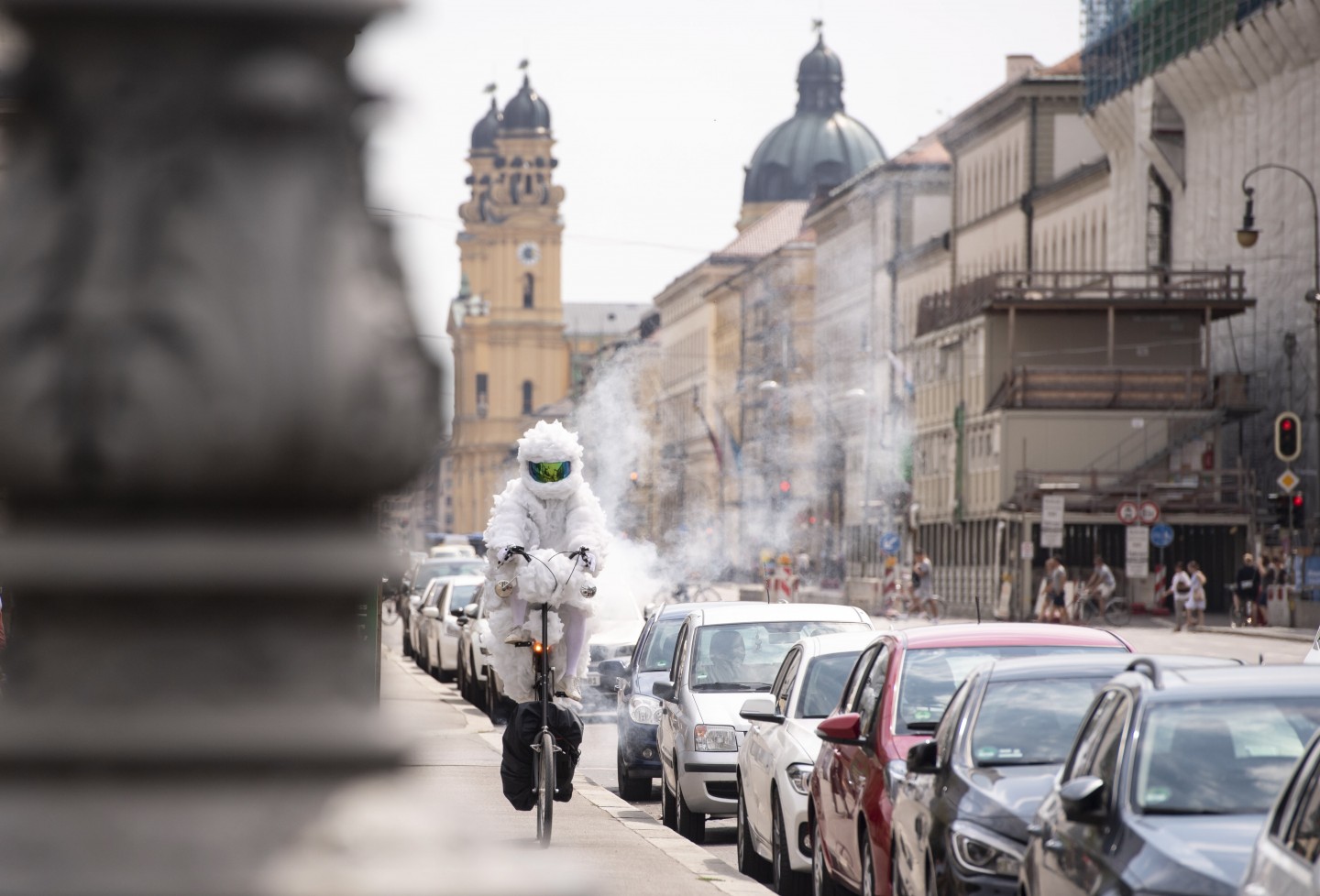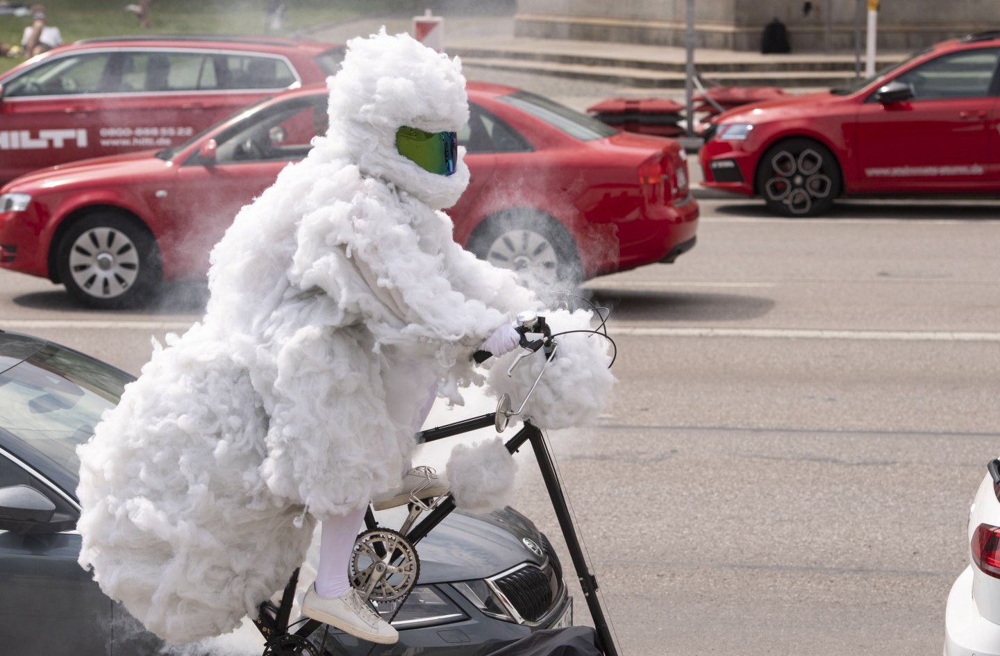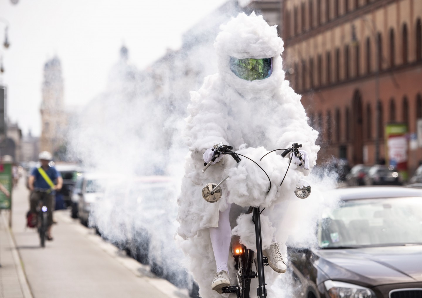 Vācijas pilsētā Minhenē ielās uz velosipēda devies mākslinieks Martins Nothelfers, kurš iejuties ''mākoņu riteņbraucēja'' lomā. Lai parādītu, kur pilsētā gaiss tīrs un kur nav, viņa velosipēds izpūta ziepju burbuļus, kad tas nav piesārņots, vai arī dūmus, kad ir.