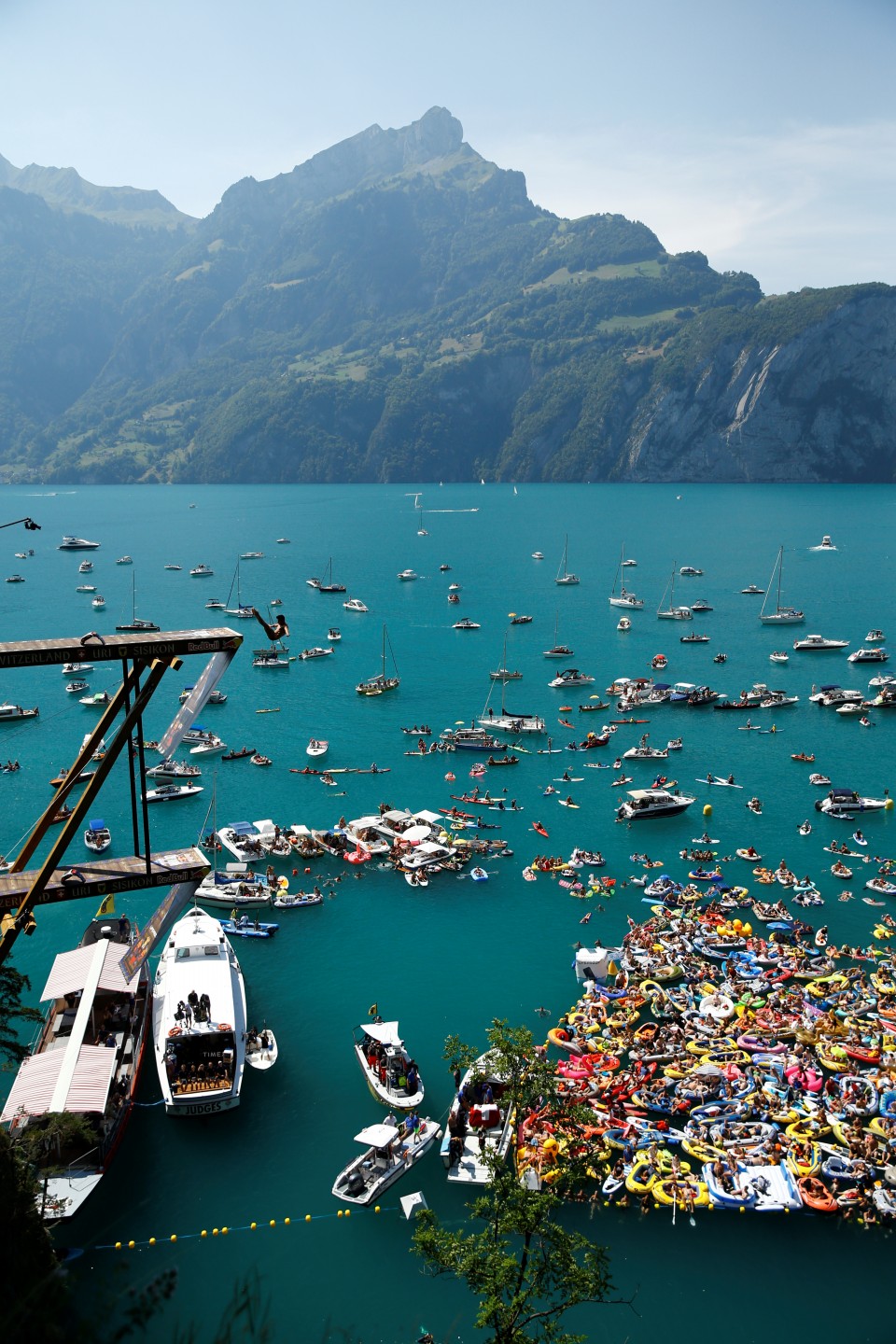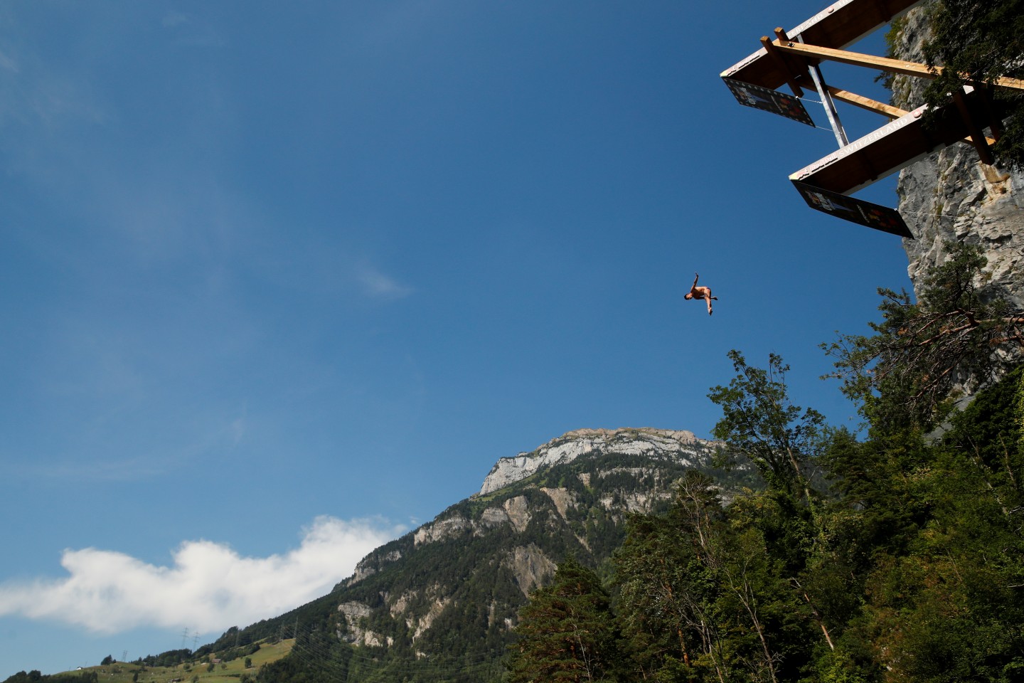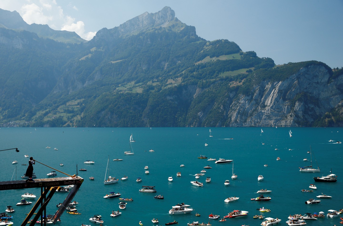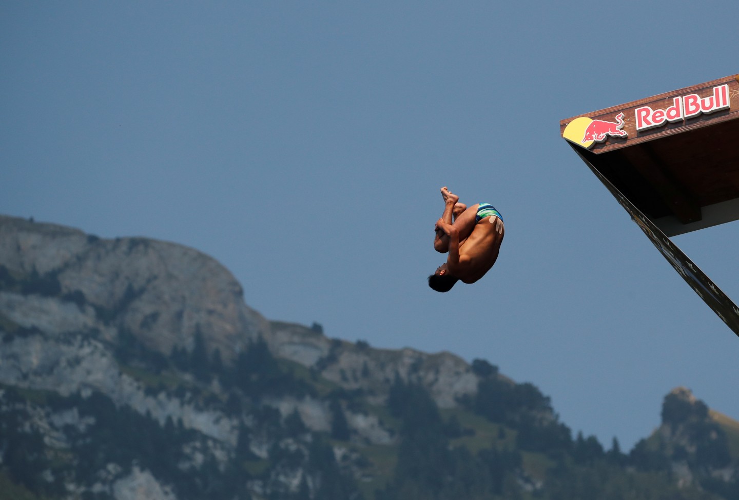 Red Bull Cliff Diving sacensību posmā Šveicē notikuši lēcieni no 27 metrus augstas platformas iekšā Lucernas ezerā.