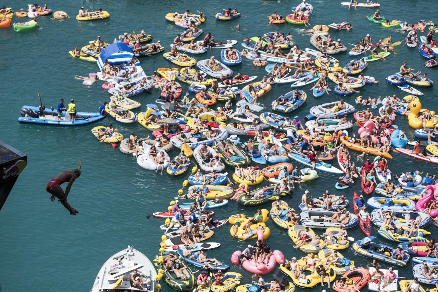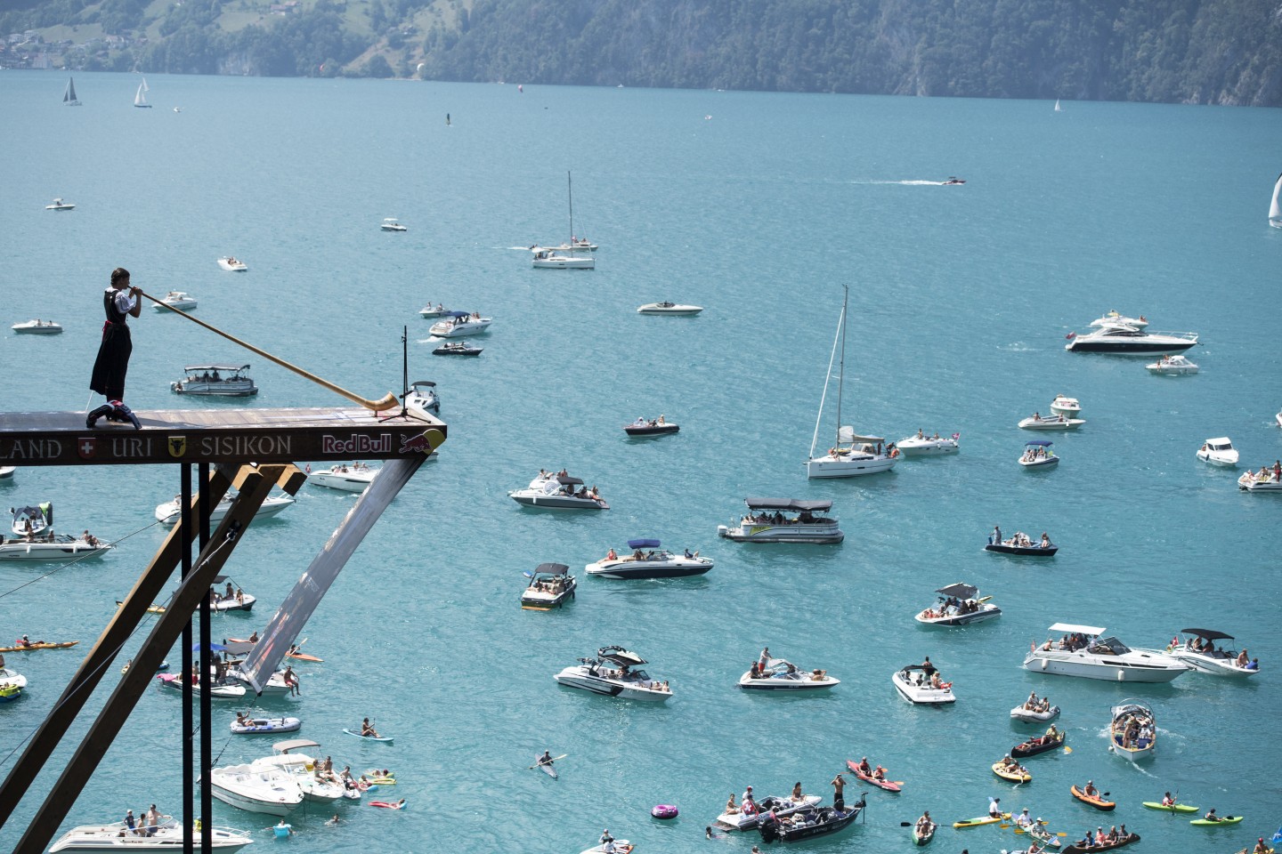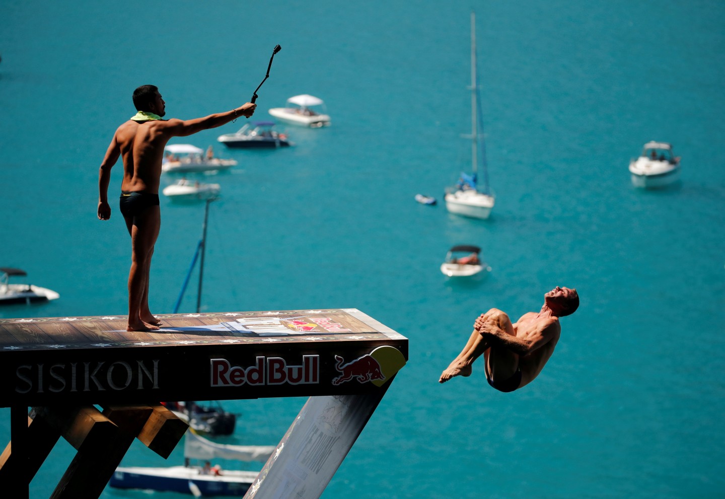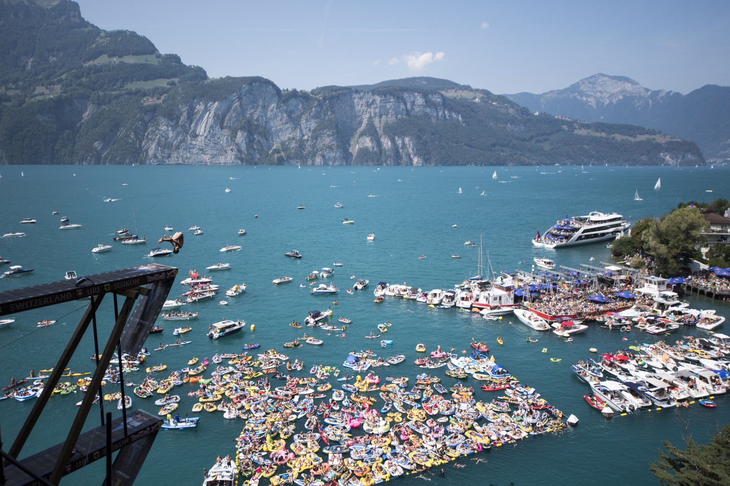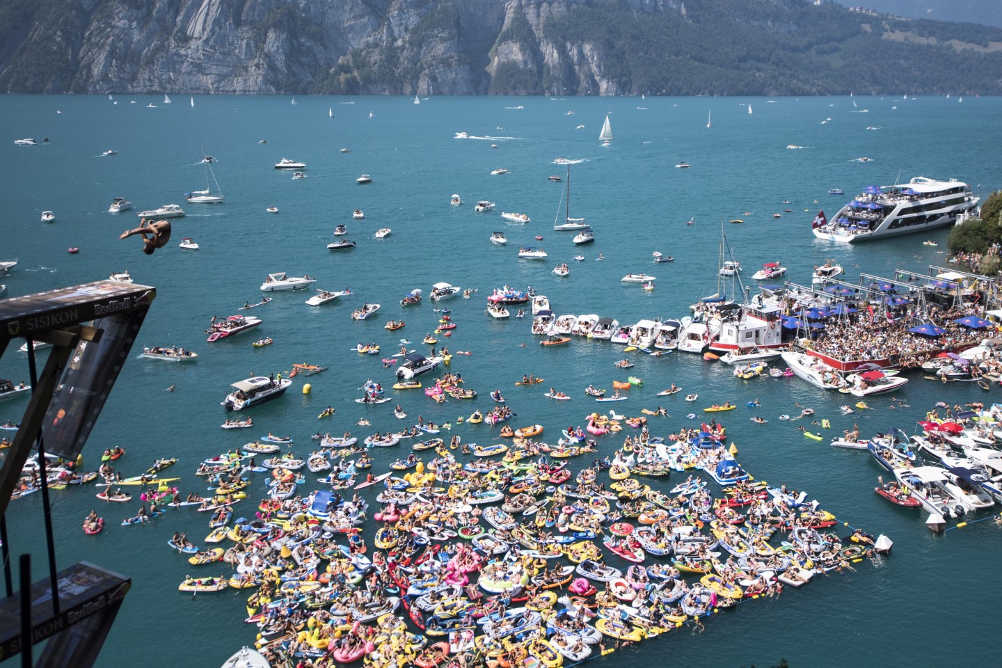 Red Bull Cliff Diving sacensību posmā Šveicē notikuši lēcieni no 27 metrus augstas platformas iekšā Lucernas ezerā.