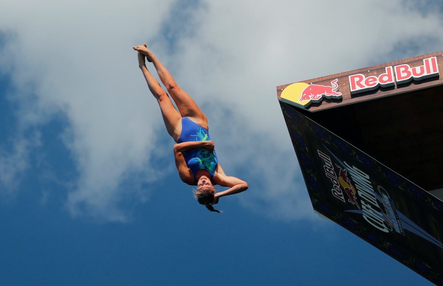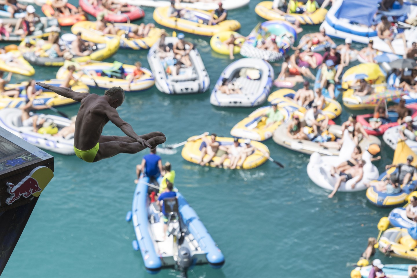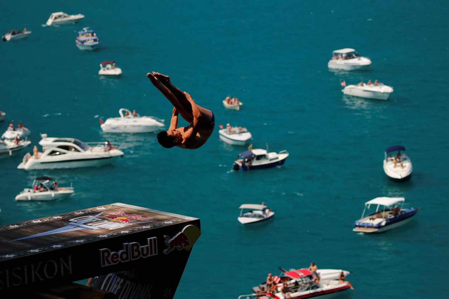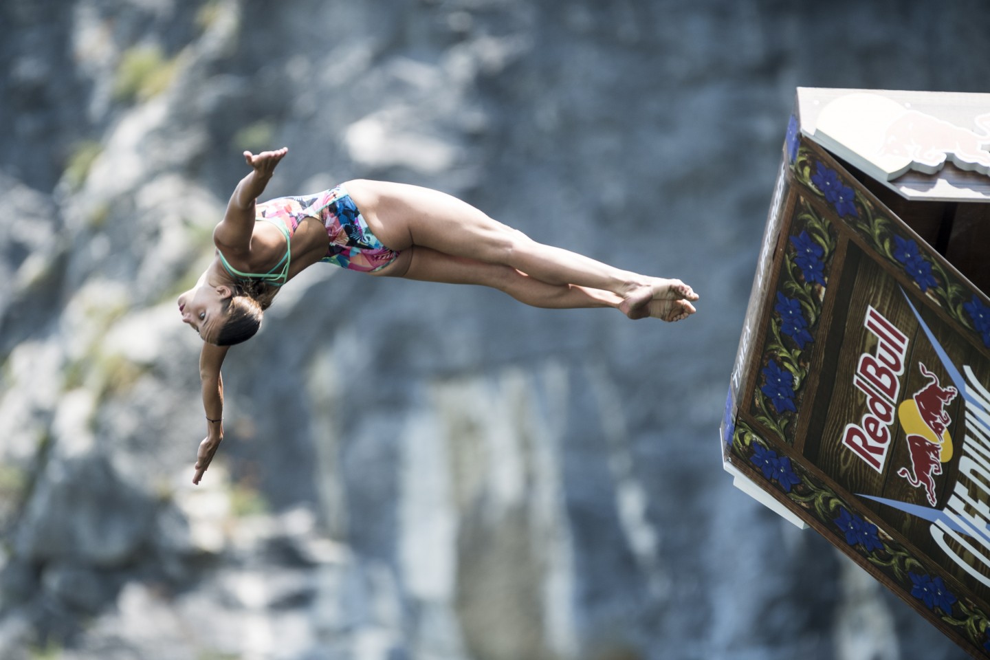 Red Bull Cliff Diving sacensību posmā Šveicē notikuši lēcieni no 27 metrus augstas platformas iekšā Lucernas ezerā.