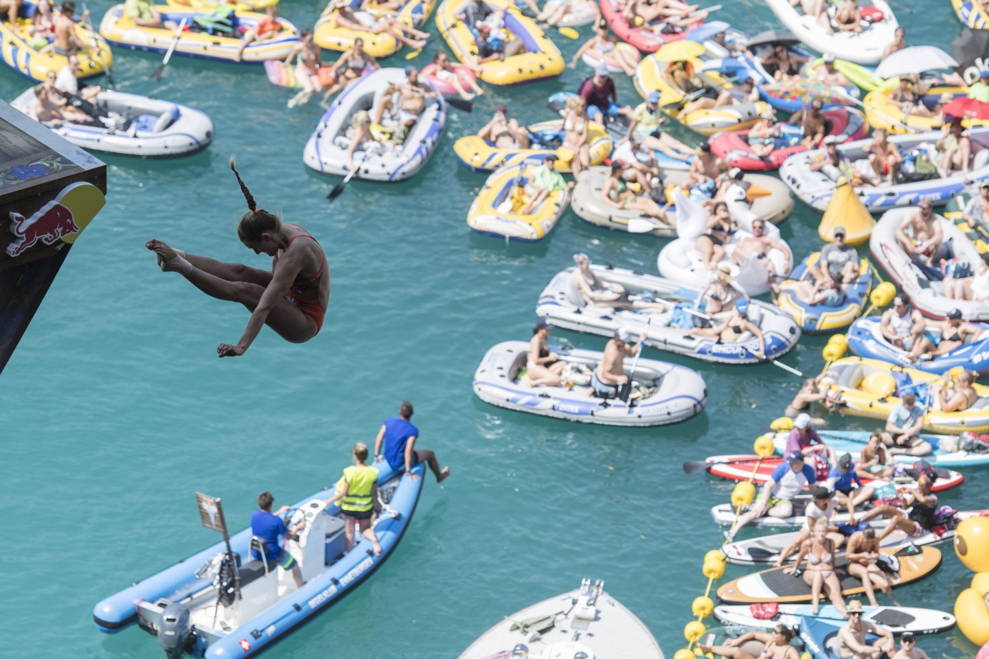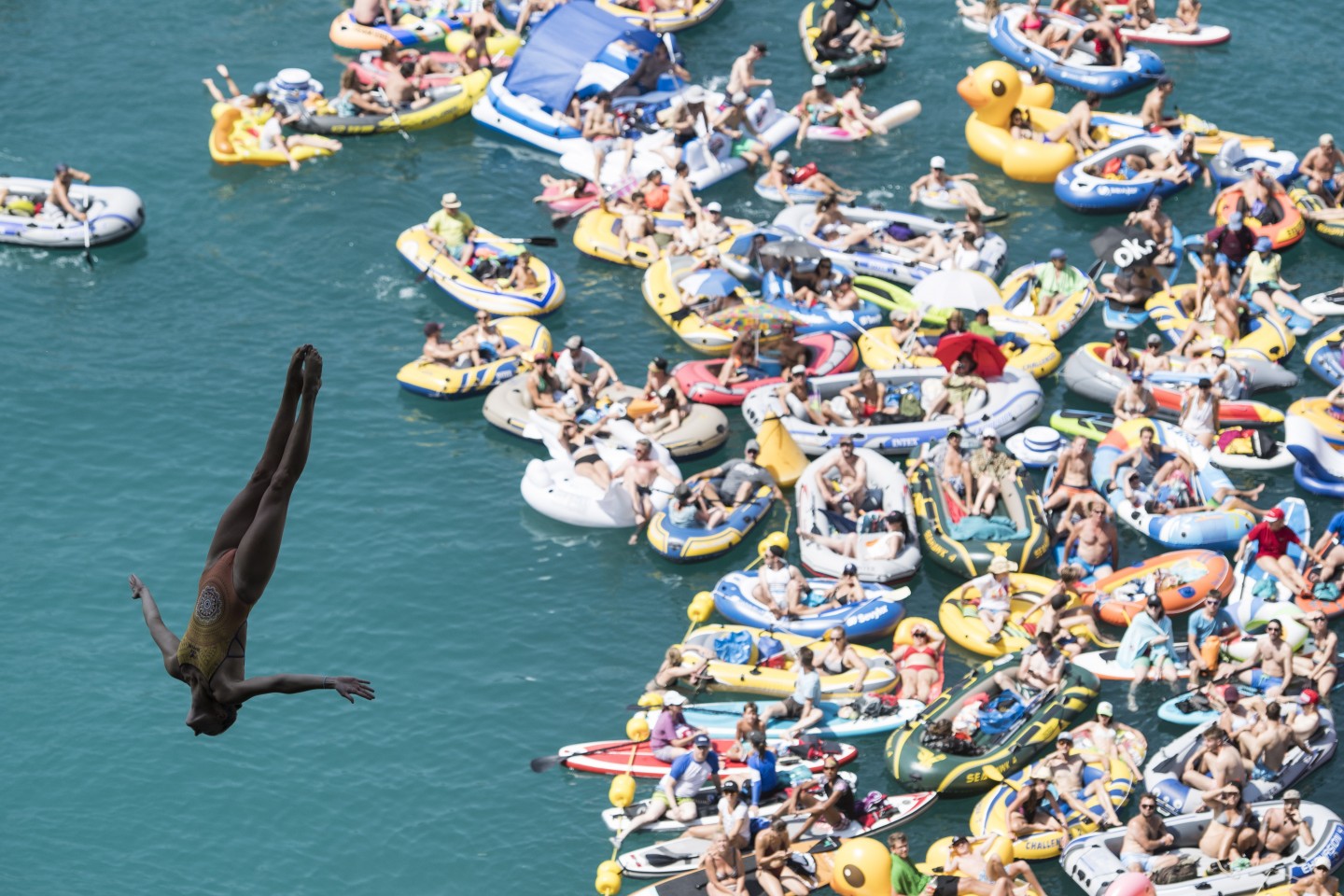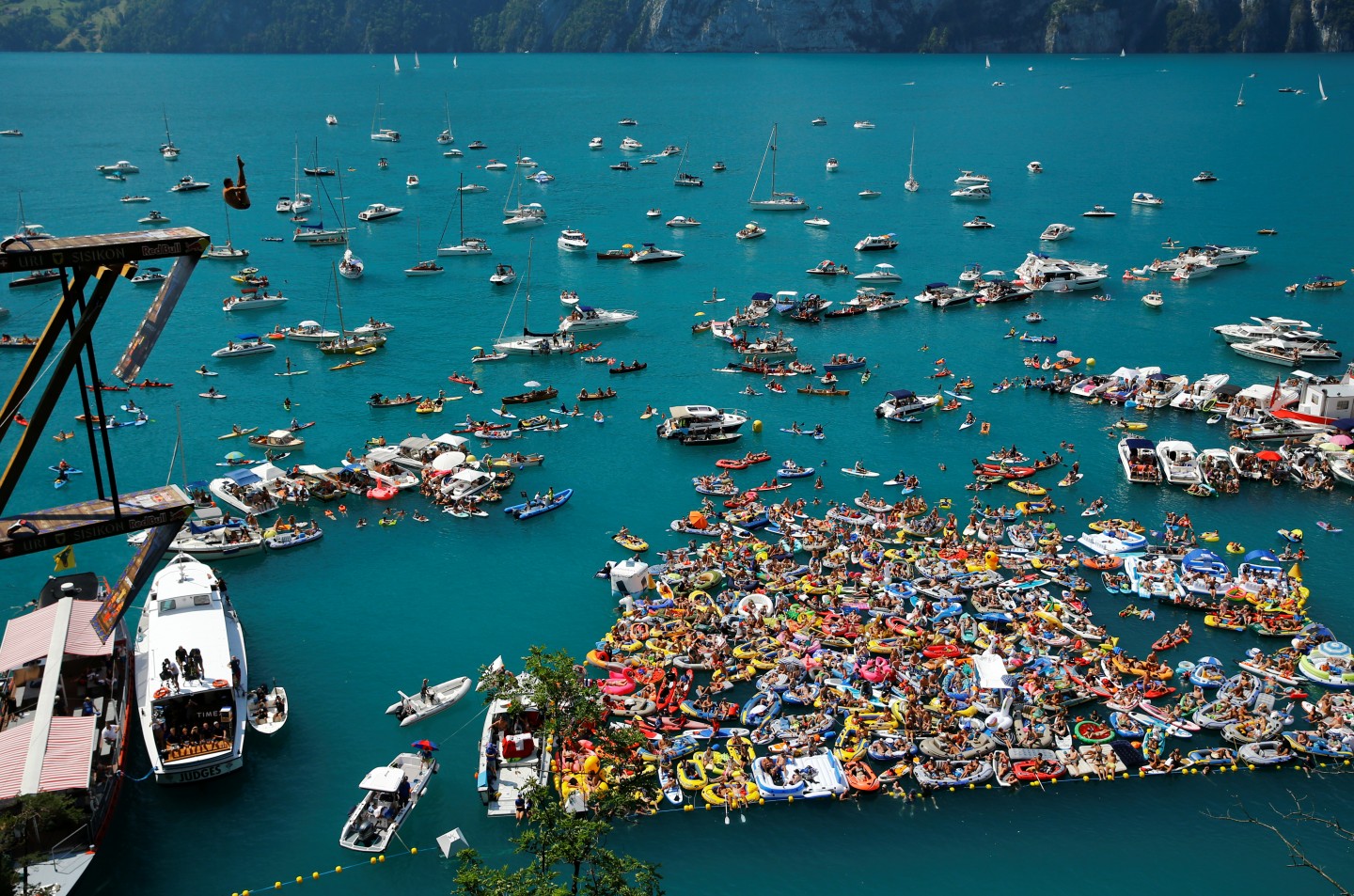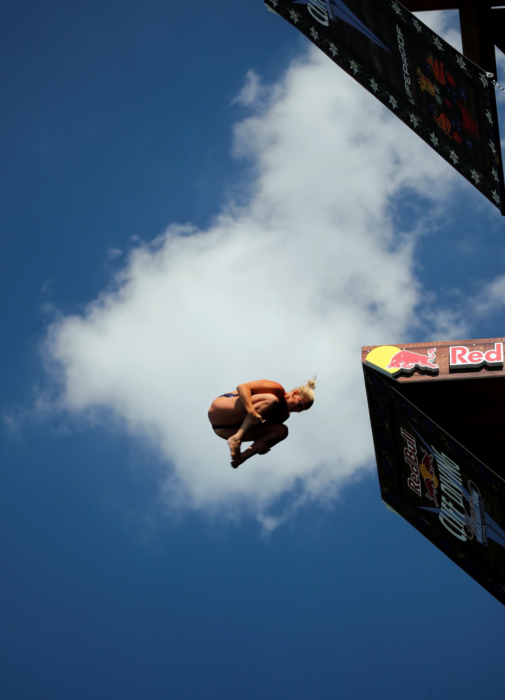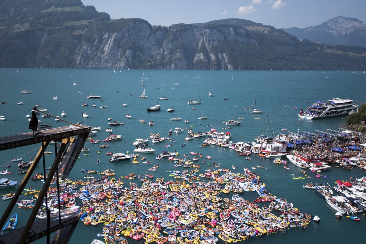 Red Bull Cliff Diving sacensību posmā Šveicē notikuši lēcieni no 27 metrus augstas platformas iekšā Lucernas ezerā.