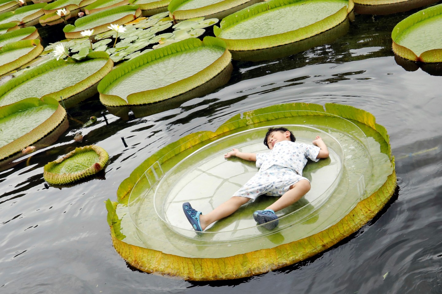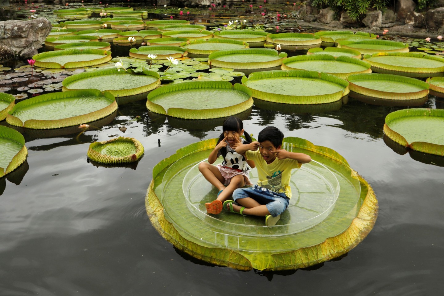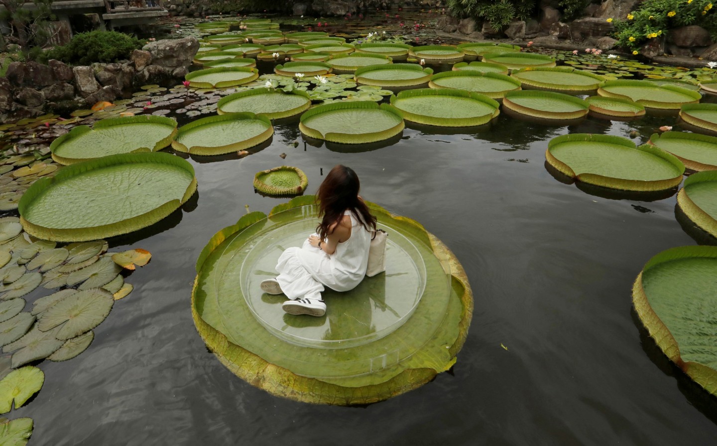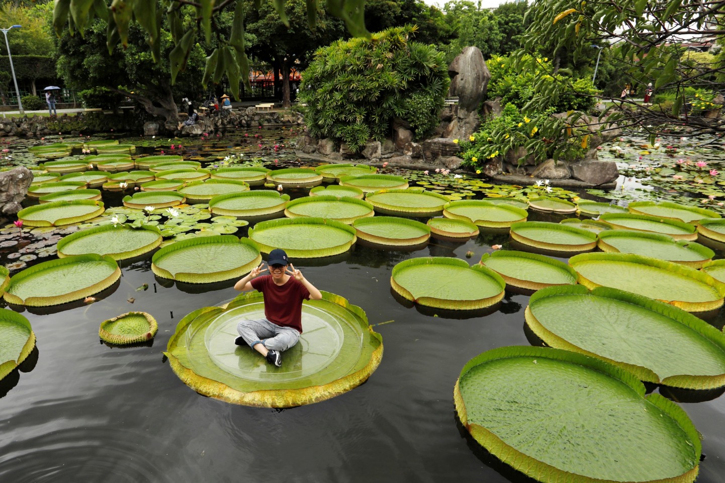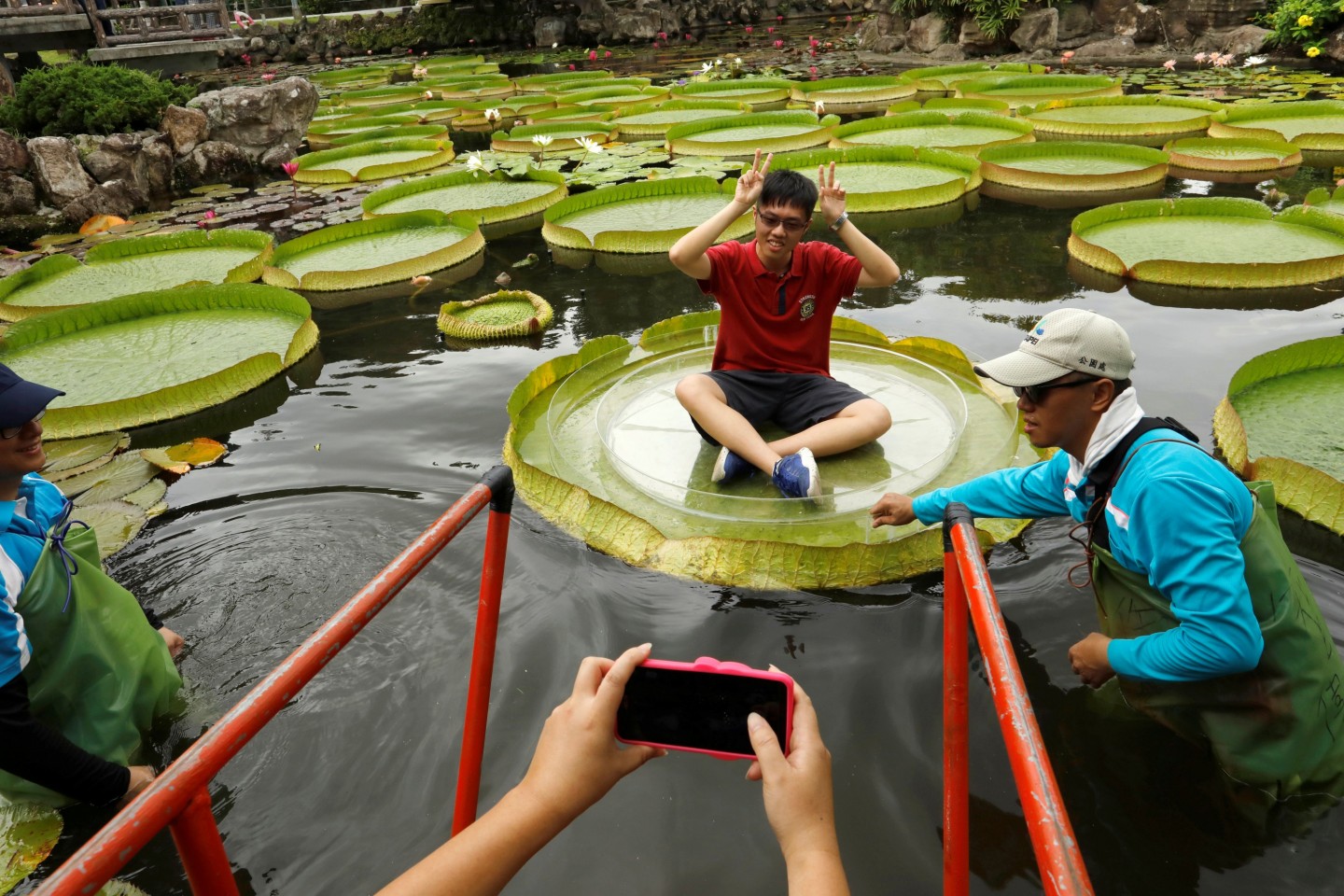 Ikgadējās ūdenslilliju izstādes Taivānā ietvaros cilvēki pozē uz to milzīgajām lapām.