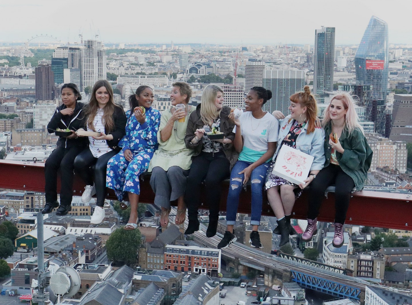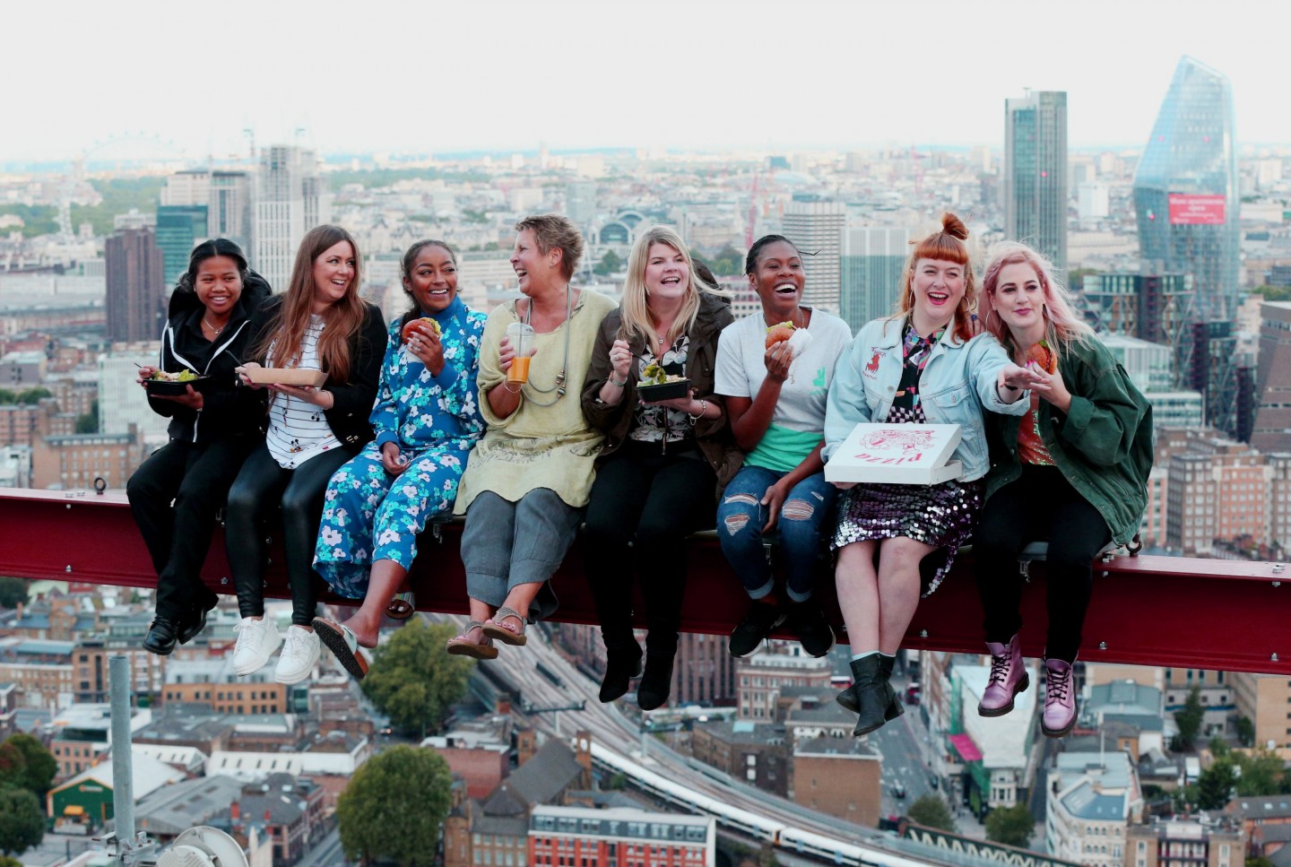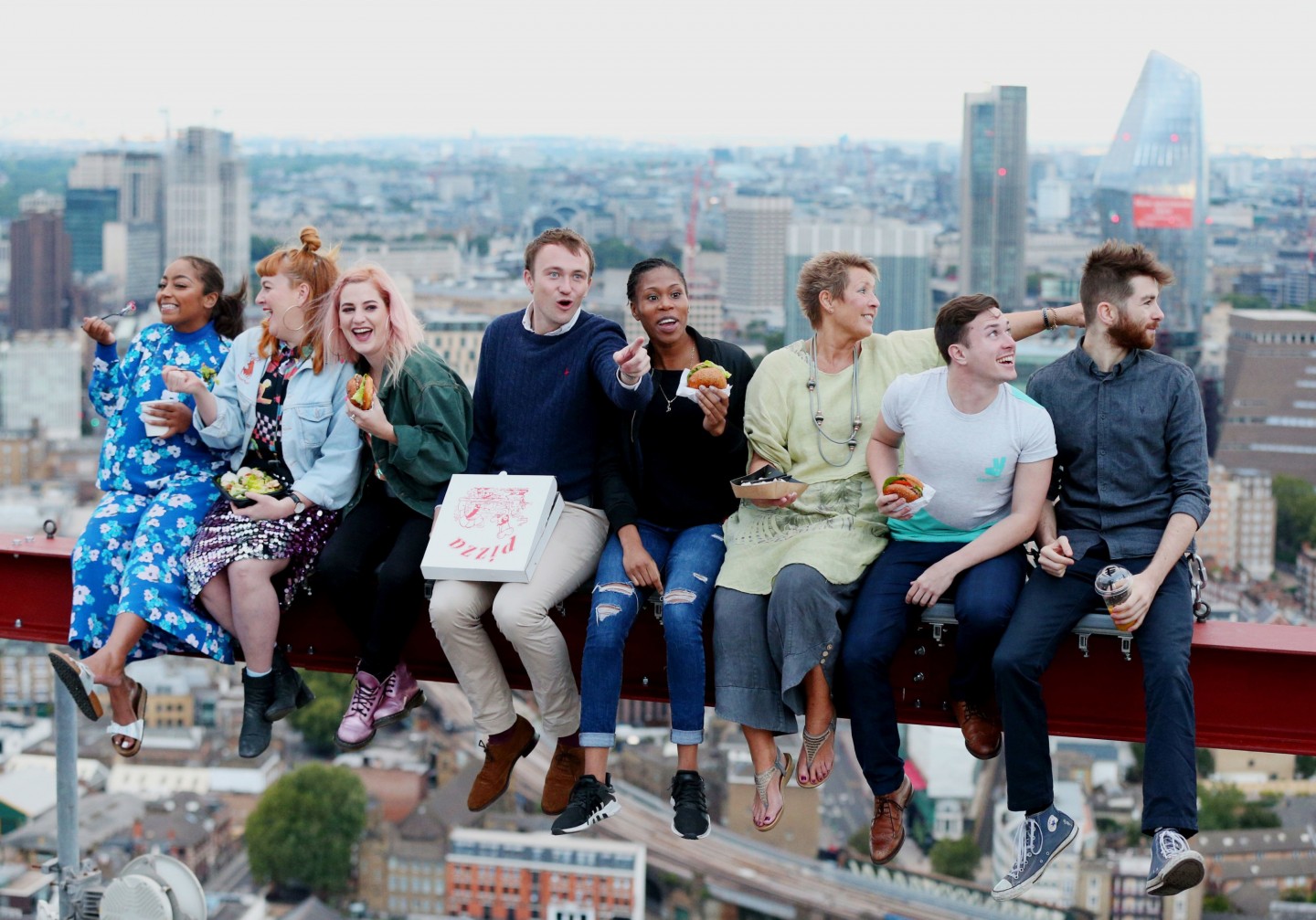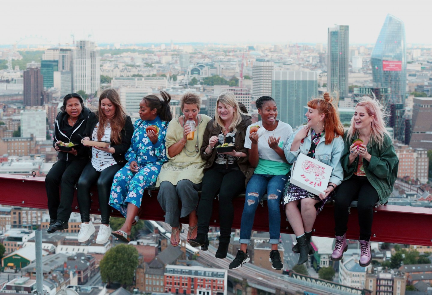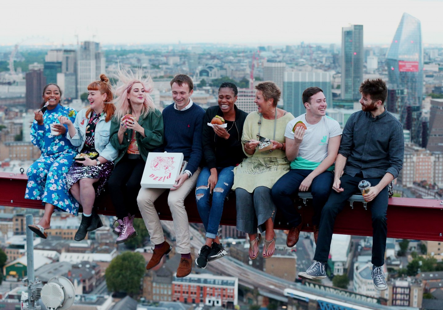Konkursa uzvarētāji bauda maltīti 140 metru augstumā, ar mērķi atdarināt 1932.gadā tapušo ikonisko fotogrāfiju no Rokfellera centra būvniecības.