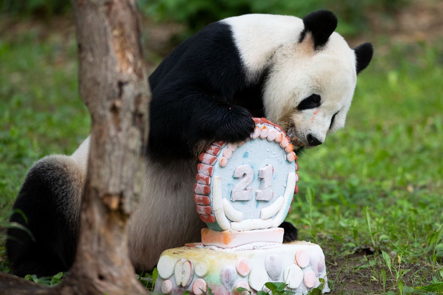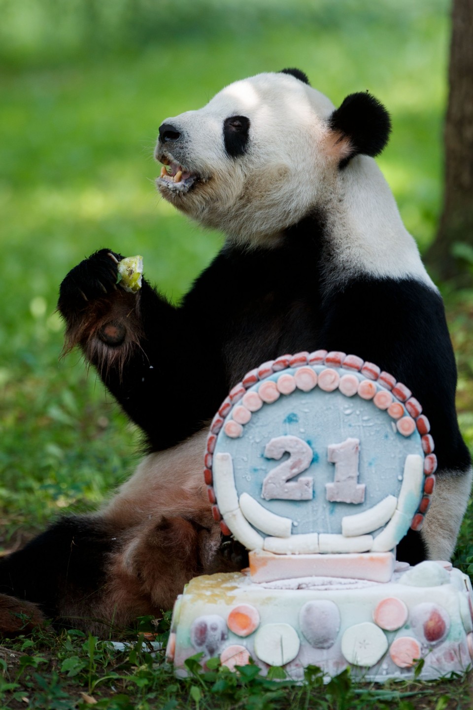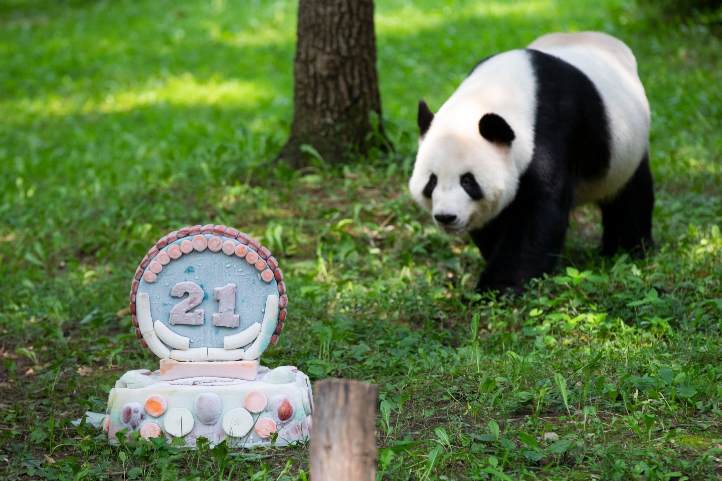 Zooloģiskajā dārzā Vašingtonā nosvinēta gigantiskās pandas dzimšanas diena. Par kodu zīmīgajai dienai sagatavota arī svētku kūka.