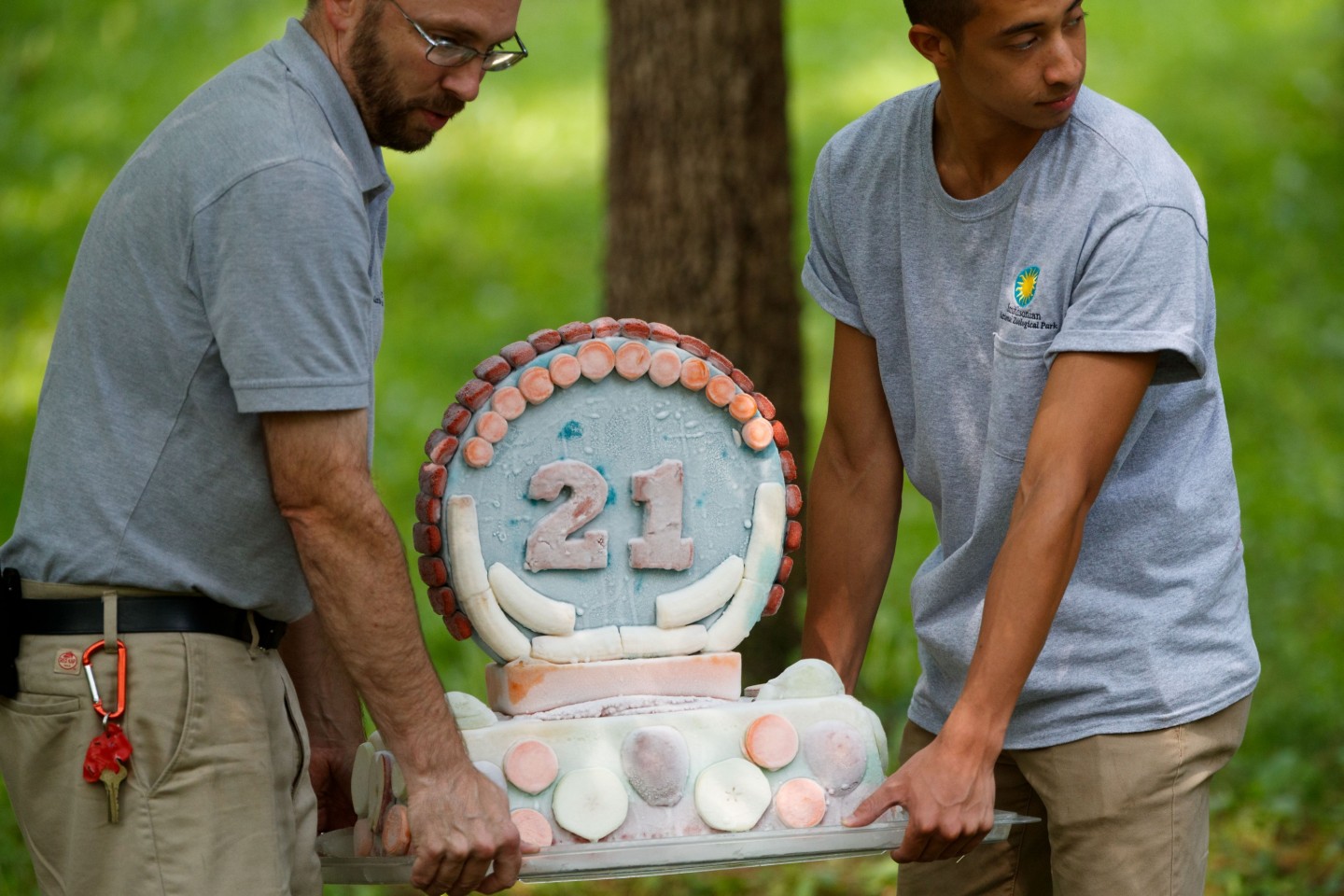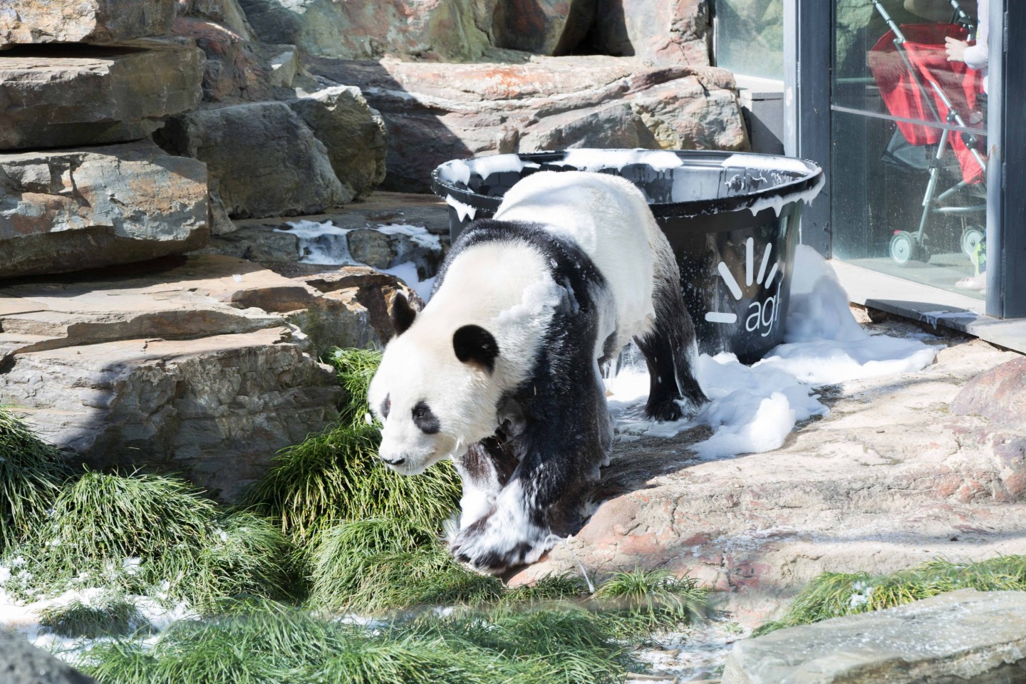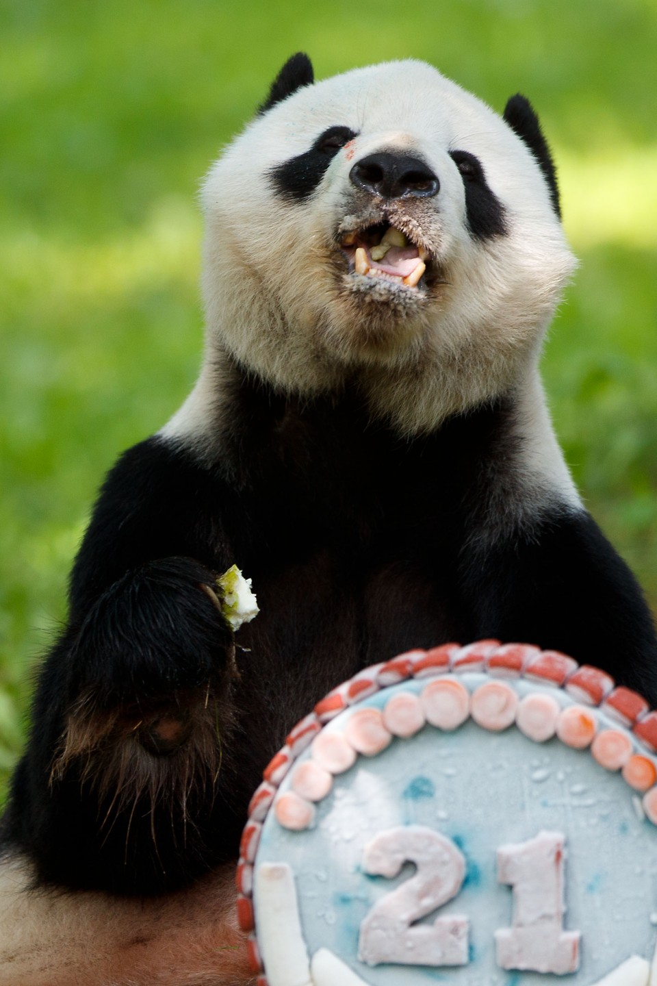 Zooloģiskajā dārzā Vašingtonā nosvinēta gigantiskās pandas dzimšanas diena. Par kodu zīmīgajai dienai sagatavota arī svētku kūka.
