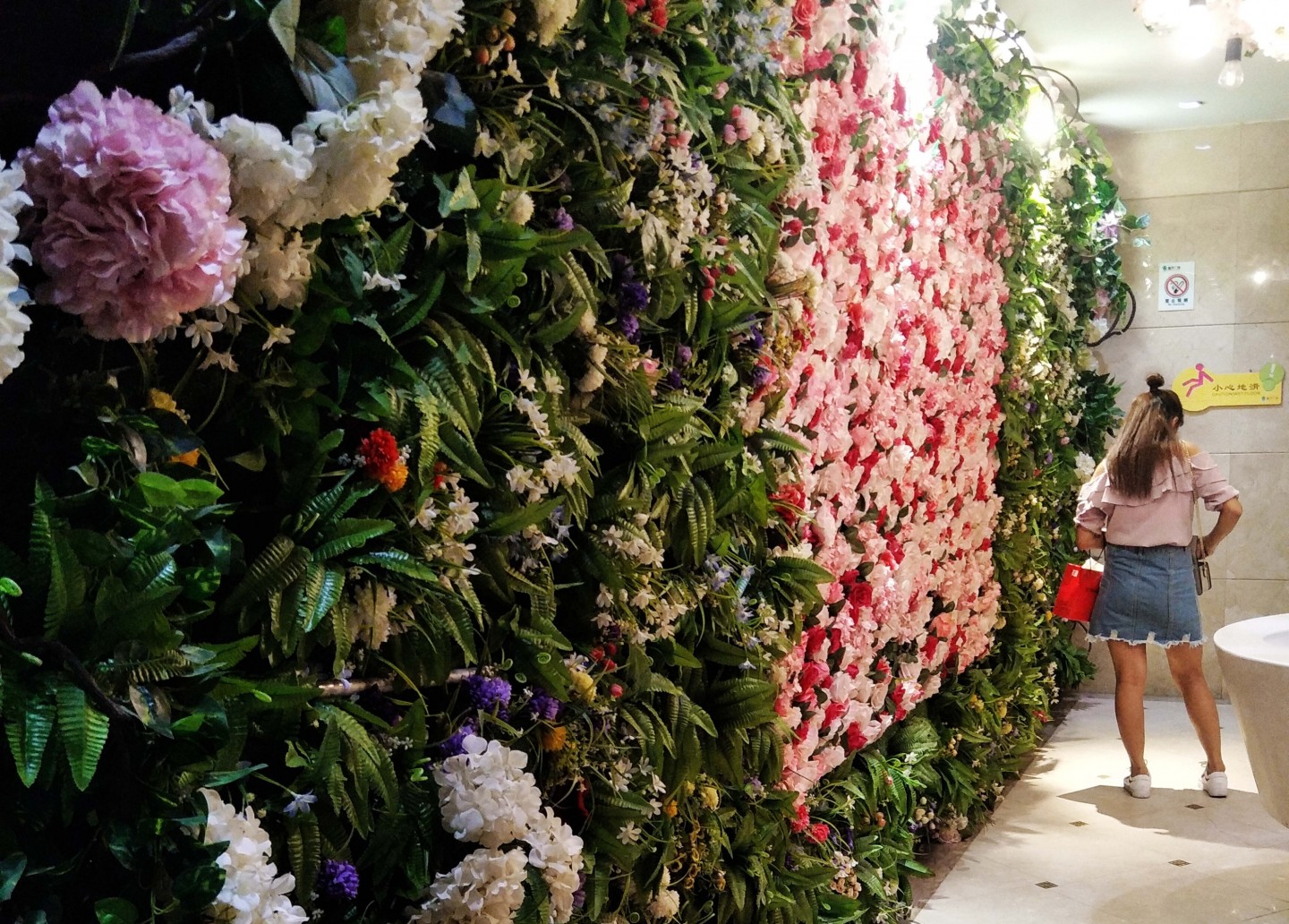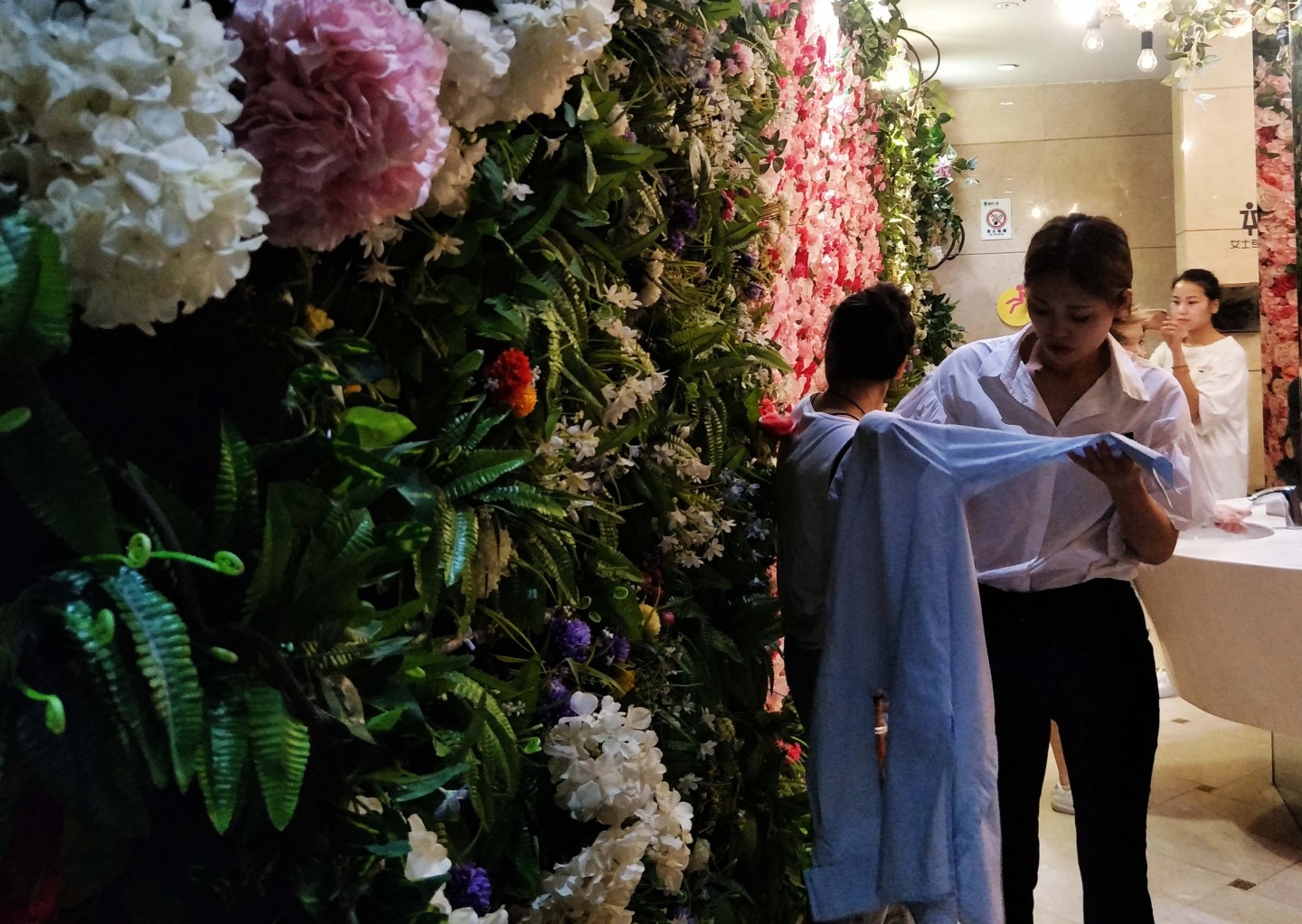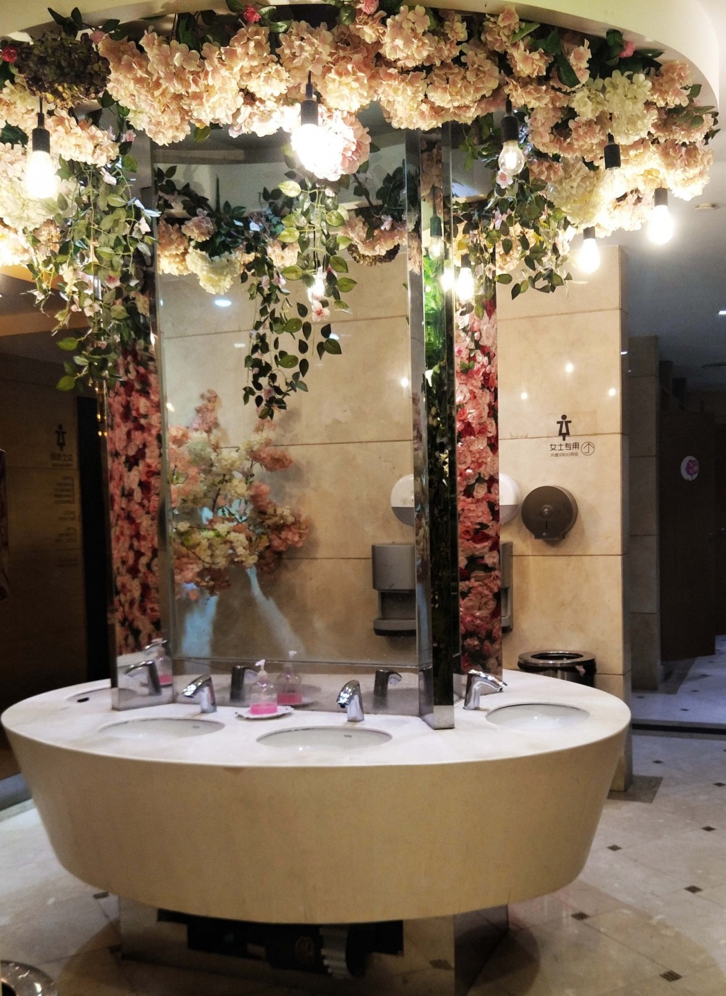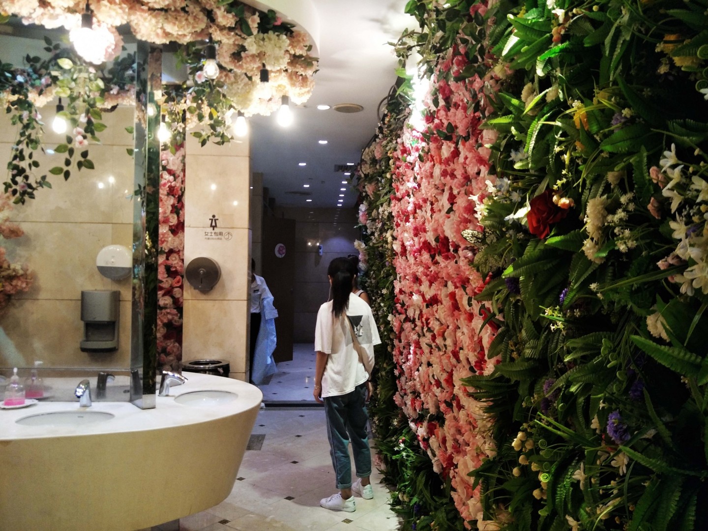 Kādā Ķīnas pilsētā sieviešu sabiedriskā tualete izrotāta ar krāšņiem ziediem.