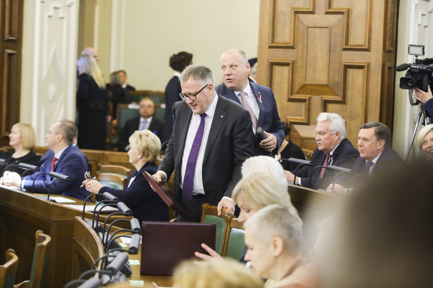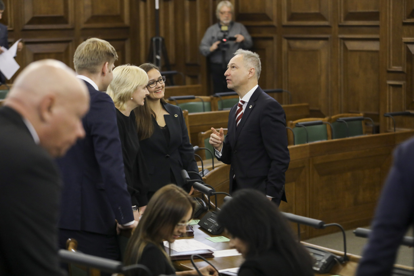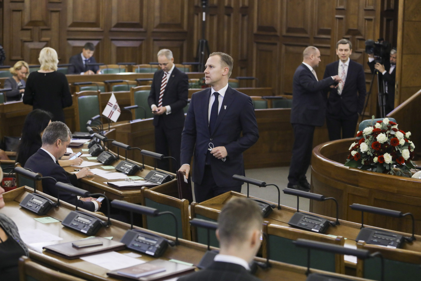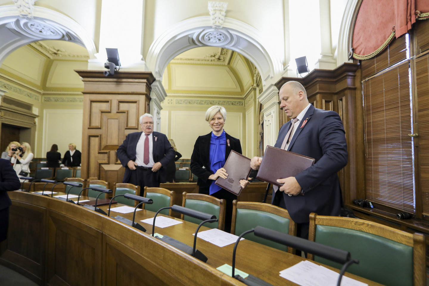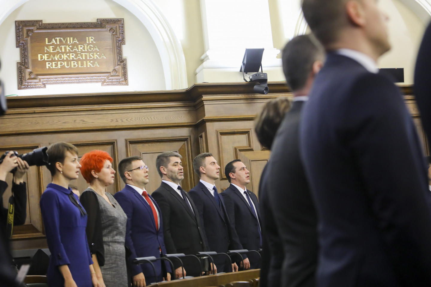 Uz pirmo 13.Saeimas sēdi ieradušies visi 100 deputāti, sacīja sēdes vadītāja Ināra Mūrniece (VL-TB/LNNK). Saskaņā ar Satversmē noteikto, jaunievēlētās Saeimas pirmo sēdi atklāja un līdz jaunā priekšsēdētāja ievēlēšanai vadīs 12.Saeimas priekšsēdētāja Ināra Mūrniece (VL-TB/LNNK). Sēdes sākumā jaunievēlēto parlamentu uzrunā Valsts prezidents Raimonds Vējonis. Jaunievēlētā Saeima pirmajā sēdē ievēlē balsu skaitītājus, kā arī pagaidu Mandātu, ētikas un iesniegumu komisiju. Tās locekļi komisijas sēdē pārbauda vēlēšanu materiālus un sūdzības par vēlēšanām, ja tādas iesniegtas Centrālajā vēlēšanu komisijā. Komisija sagatavo ziņojumu Saeimai par deputātu pilnvaru apstiprināšanu. Tad deputāta amata kandidāti, kas ievēlēti 13.Saeimā, dod svinīgu solījumu un apliecina to ar savu parakstu. Pēc svinīgā solījuma došanas deputāti balso par lēmuma projektu par 13.Saeimas deputātu pilnvaru apstiprināšanu. Jaunievēlētā Saeima pirmajā sēdē atklātā procedūrā ar vēlēšanu zīmēm ievēlē Prezidiju - parlamenta priekšsēdētāju, divus viņa biedrus, sekretāru un viņa biedru. Saskaņā ar Ministru kabineta iekārtas likumu līdz ar jaunievēlētās Saeimas sanākšanu uzskatāms, ka Ministru kabinets ir atkāpies, tādēļ sēdi noslēdz ar valdības paziņojumu par savu pilnvaru nolikšanu. Līdzšinējā valdība turpinās pildīt savus pienākumus līdz brīdim, kad deputāti apstiprinās jaunu valdību. No 12.Saeimas deputātiem jaunajā sasaukumā pārvēlēti 34 deputāti, tātad 66 parlamentārieši būs jauni. Kopumā parlamentā darbosies septiņas frakcijas - "Saskaņas", Jaunās konservatīvās partijas, "KPV LV", "Attīstībai/Par!" (AP), nacionālās apvienības "Visu Latvijai!"-"Tēvzemei un brīvībai"/LNNK (VL-TB/LNNK), Zaļo un zemnieku savienības (ZZS), kā ar "Jaunās Vienotības" (JV). Vislielākā frakcija - 23 deputāti - būs "Saskaņai", JKP un "KPV LV" pārstāvēs pa 16 deputātiem, AP un VL-TB/LNNK - pa 13, ZZS - 11, bet JV - astoņi. Kā ziņots, arī balsojuma priekšvakarā politiķi vēl nebija vienojušies par Saeimas Prezidija sastāvu. Partijas nav vienojušās arī par koalīcijas sastāvu un valdību. Uz spīkera amatu plāno kandidēt Dagmāra Beitnere-Le Galla (JKP) un 12.Saeimas priekšsēdētāja Ināra Mūrniece (VL-TB/LNNK). Citiem amatiem Prezidijā "Attīstībai/Par!" varētu virzīt Mariju Golubevu, "Saskaņa" - Andreju Klementjevu, "KPV LV" - Artusu Kaimiņu, bet Zaļo un zemnieku savienība - Gundaru Daudzi.