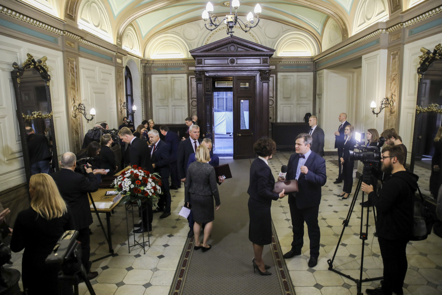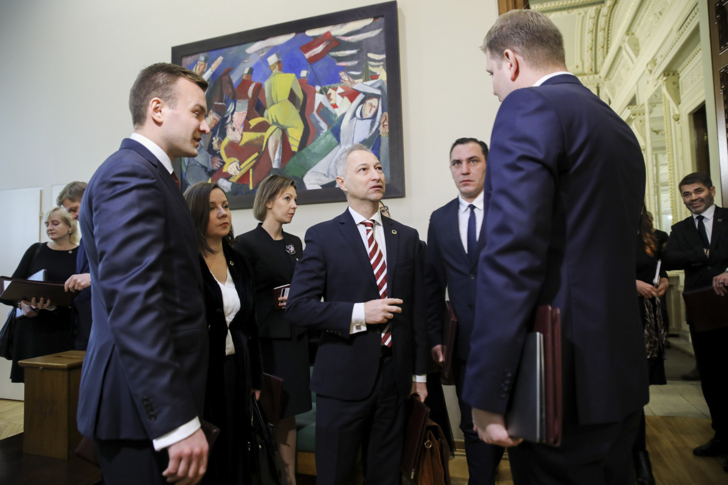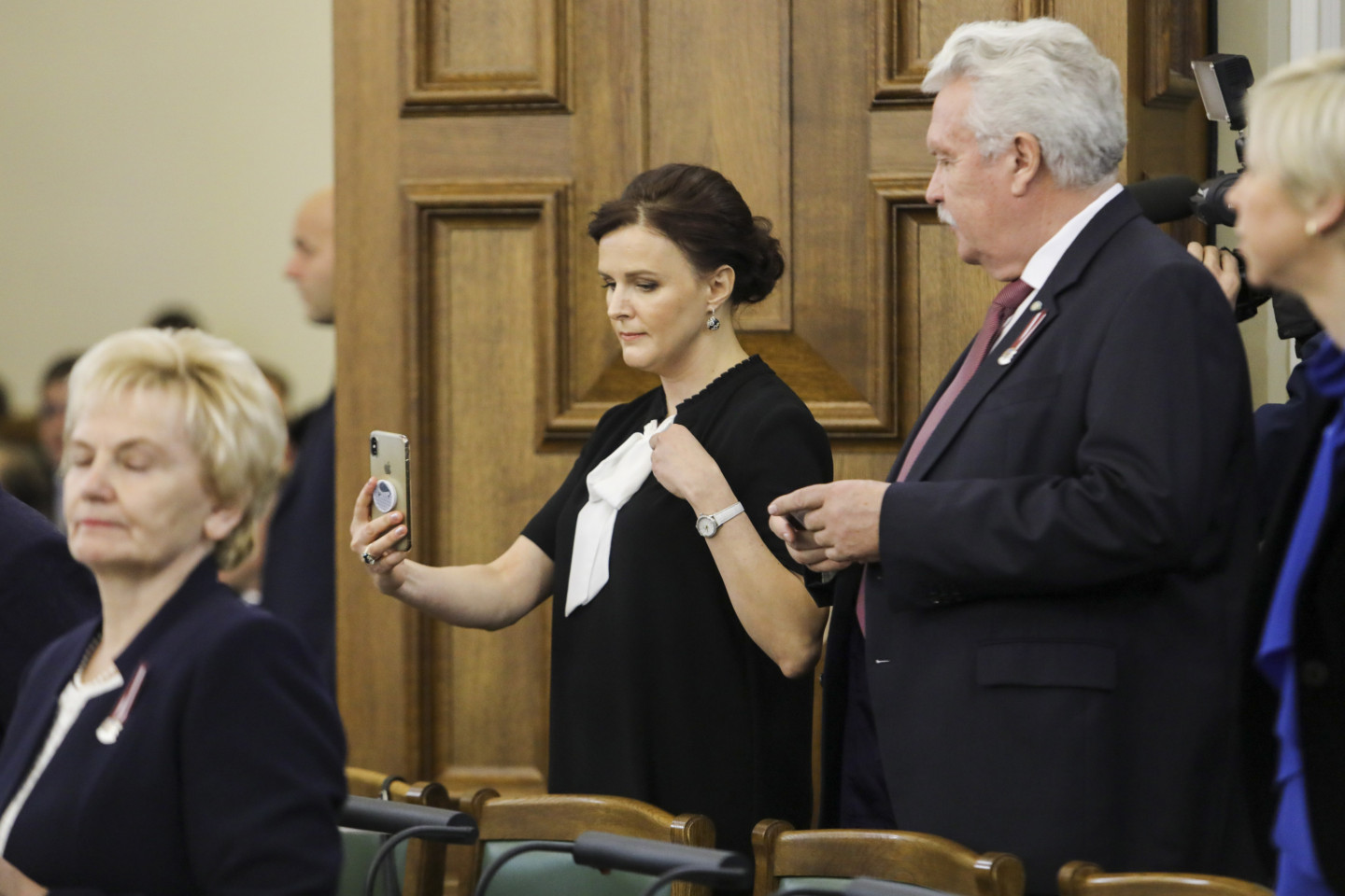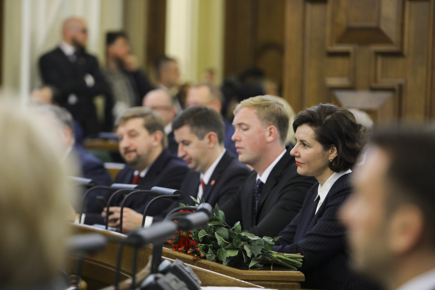 Uz pirmo 13.Saeimas sēdi ieradušies visi 100 deputāti, sacīja sēdes vadītāja Ināra Mūrniece (VL-TB/LNNK). Saskaņā ar Satversmē noteikto, jaunievēlētās Saeimas pirmo sēdi atklāja un līdz jaunā priekšsēdētāja ievēlēšanai vadīs 12.Saeimas priekšsēdētāja Ināra Mūrniece (VL-TB/LNNK). Sēdes sākumā jaunievēlēto parlamentu uzrunā Valsts prezidents Raimonds Vējonis. Jaunievēlētā Saeima pirmajā sēdē ievēlē balsu skaitītājus, kā arī pagaidu Mandātu, ētikas un iesniegumu komisiju. Tās locekļi komisijas sēdē pārbauda vēlēšanu materiālus un sūdzības par vēlēšanām, ja tādas iesniegtas Centrālajā vēlēšanu komisijā. Komisija sagatavo ziņojumu Saeimai par deputātu pilnvaru apstiprināšanu. Tad deputāta amata kandidāti, kas ievēlēti 13.Saeimā, dod svinīgu solījumu un apliecina to ar savu parakstu. Pēc svinīgā solījuma došanas deputāti balso par lēmuma projektu par 13.Saeimas deputātu pilnvaru apstiprināšanu. Jaunievēlētā Saeima pirmajā sēdē atklātā procedūrā ar vēlēšanu zīmēm ievēlē Prezidiju - parlamenta priekšsēdētāju, divus viņa biedrus, sekretāru un viņa biedru. Saskaņā ar Ministru kabineta iekārtas likumu līdz ar jaunievēlētās Saeimas sanākšanu uzskatāms, ka Ministru kabinets ir atkāpies, tādēļ sēdi noslēdz ar valdības paziņojumu par savu pilnvaru nolikšanu. Līdzšinējā valdība turpinās pildīt savus pienākumus līdz brīdim, kad deputāti apstiprinās jaunu valdību. No 12.Saeimas deputātiem jaunajā sasaukumā pārvēlēti 34 deputāti, tātad 66 parlamentārieši būs jauni. Kopumā parlamentā darbosies septiņas frakcijas - "Saskaņas", Jaunās konservatīvās partijas, "KPV LV", "Attīstībai/Par!" (AP), nacionālās apvienības "Visu Latvijai!"-"Tēvzemei un brīvībai"/LNNK (VL-TB/LNNK), Zaļo un zemnieku savienības (ZZS), kā ar "Jaunās Vienotības" (JV). Vislielākā frakcija - 23 deputāti - būs "Saskaņai", JKP un "KPV LV" pārstāvēs pa 16 deputātiem, AP un VL-TB/LNNK - pa 13, ZZS - 11, bet JV - astoņi. Kā ziņots, arī balsojuma priekšvakarā politiķi vēl nebija vienojušies par Saeimas Prezidija sastāvu. Partijas nav vienojušās arī par koalīcijas sastāvu un valdību. Uz spīkera amatu plāno kandidēt Dagmāra Beitnere-Le Galla (JKP) un 12.Saeimas priekšsēdētāja Ināra Mūrniece (VL-TB/LNNK). Citiem amatiem Prezidijā "Attīstībai/Par!" varētu virzīt Mariju Golubevu, "Saskaņa" - Andreju Klementjevu, "KPV LV" - Artusu Kaimiņu, bet Zaļo un zemnieku savienība - Gundaru Daudzi.