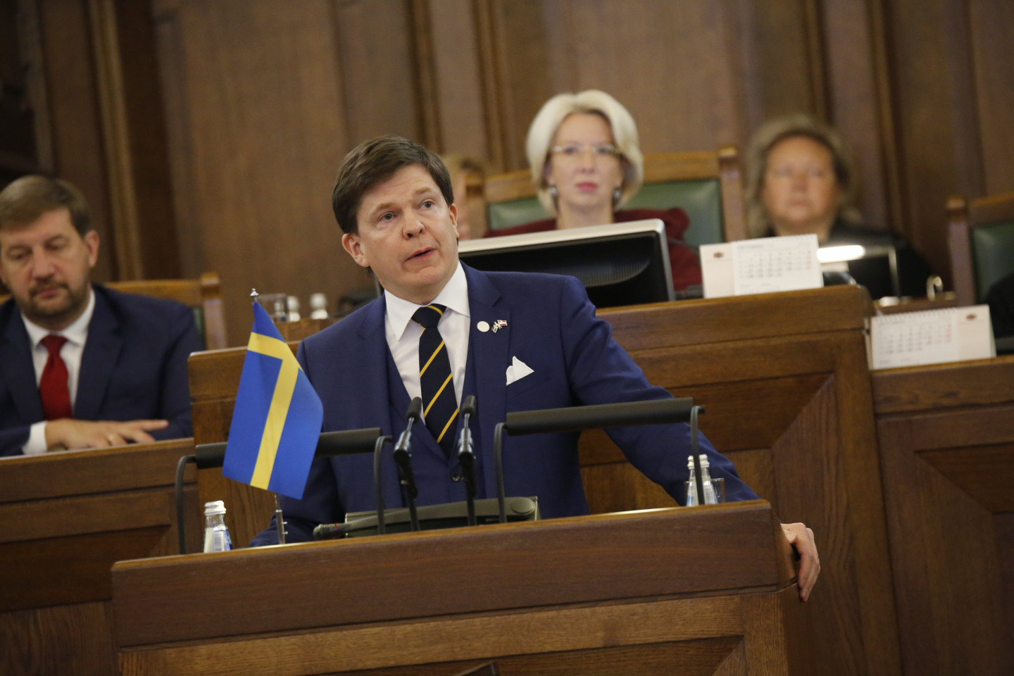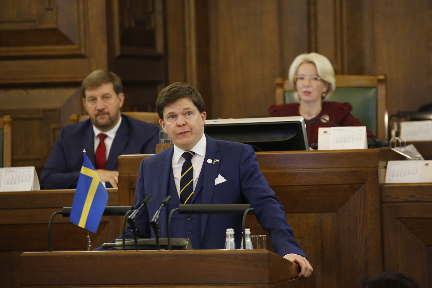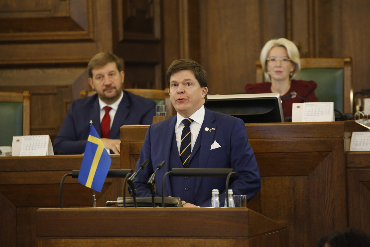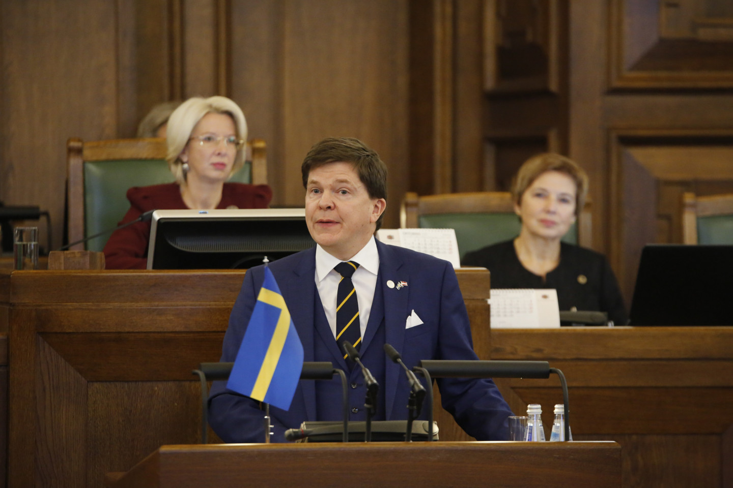 Ar uzrunu Saeimā uzstājas Zviedrijas parlamenta priekšsēdētājs