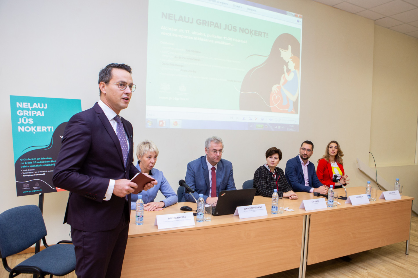 Rīgas Dzemdību namā šodien atklāja sabiedrības informēšanas kampaņu "Neļauj gripai jūs noķert!". Pasākumā piedalījās veselības ministre Ilze Viņķele (AP), SPKC Infekcijas slimību riska analīzes un profilakses departamenta direktors Jurijs Perevoščikovs, VM galvenā speciāliste ginekoloģijā un dzemdniecībā Dace Rezeberga, ģimenes ārsts Ainis Dzalbs, kā arī TV sejas Lelde un Aivis Ceriņi