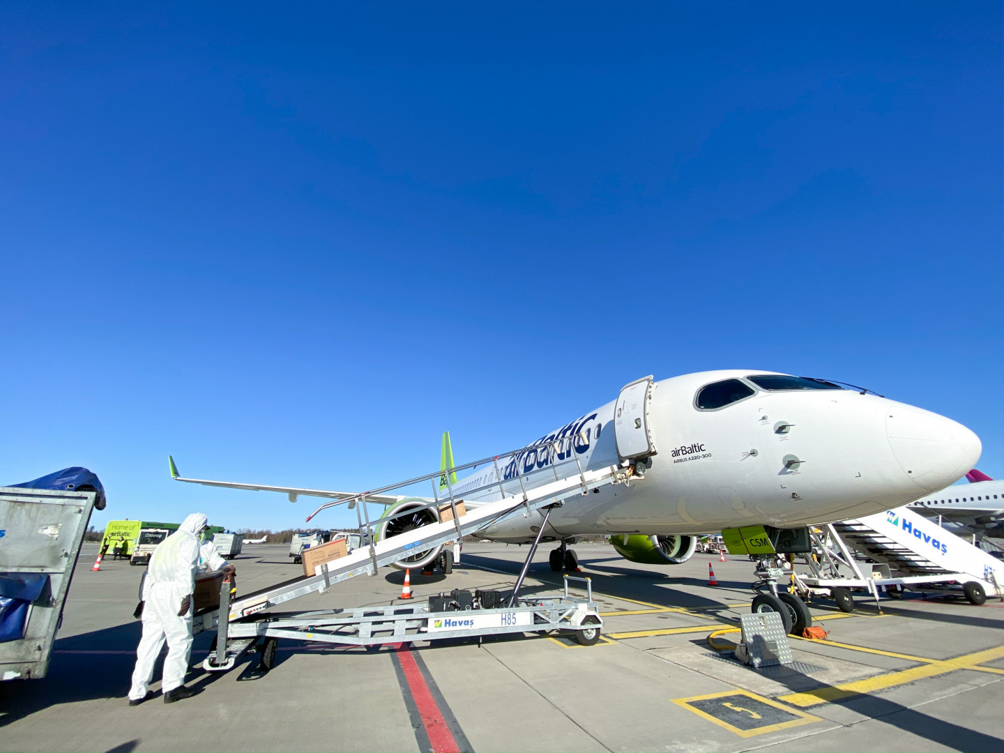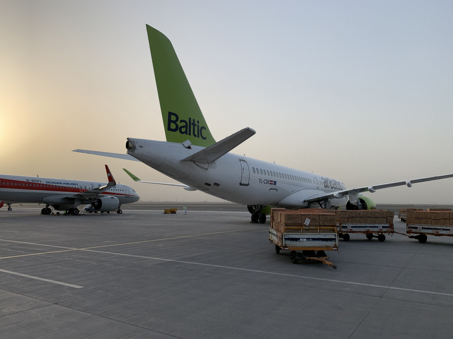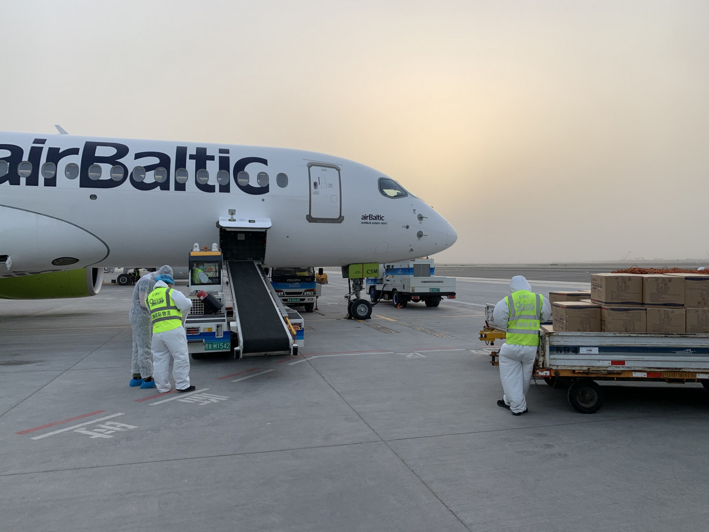 Latvijas lidsabiedrība airBaltic šajā nedēļā veica otro īpašo kravas lidojumu uz un no Urumči starptautiskās lidostas Ķīnā, uz Latviju atgādājot vienu miljonu sejas masku, kas izgatavotas Džedzjanas un Dzjansu reģionos. Kopējais lidojuma laiks uz Urumči starptautisko lidostu Ķīnā bija sešas stundas, bet lidojums atpakaļ 10. aprīlī ilga sešas stundas un 50 minūtes. airBaltic ar Airbus A220-300 lidmašīnu vienā virzienā starp starptautisko lidostu Rīga un Urumči starptautisko lidostu veica 4 815 km garu lidojumu bez apstājas.