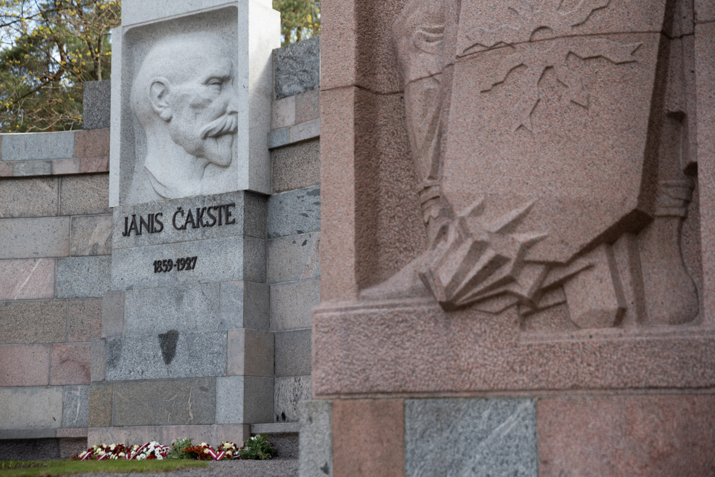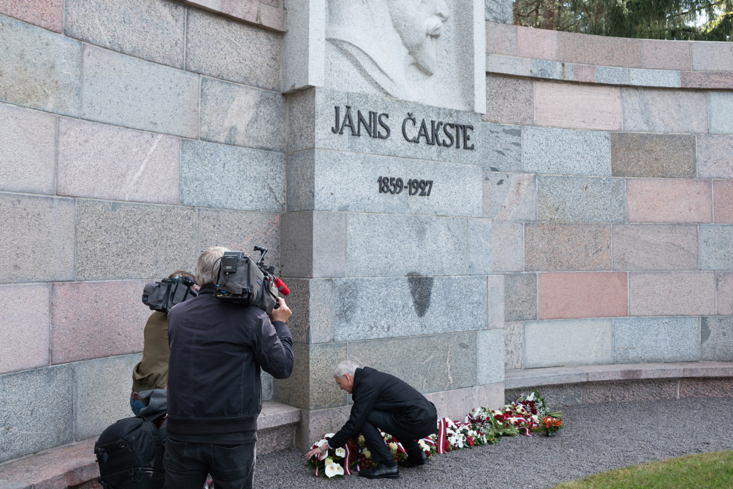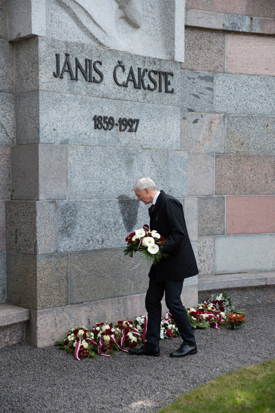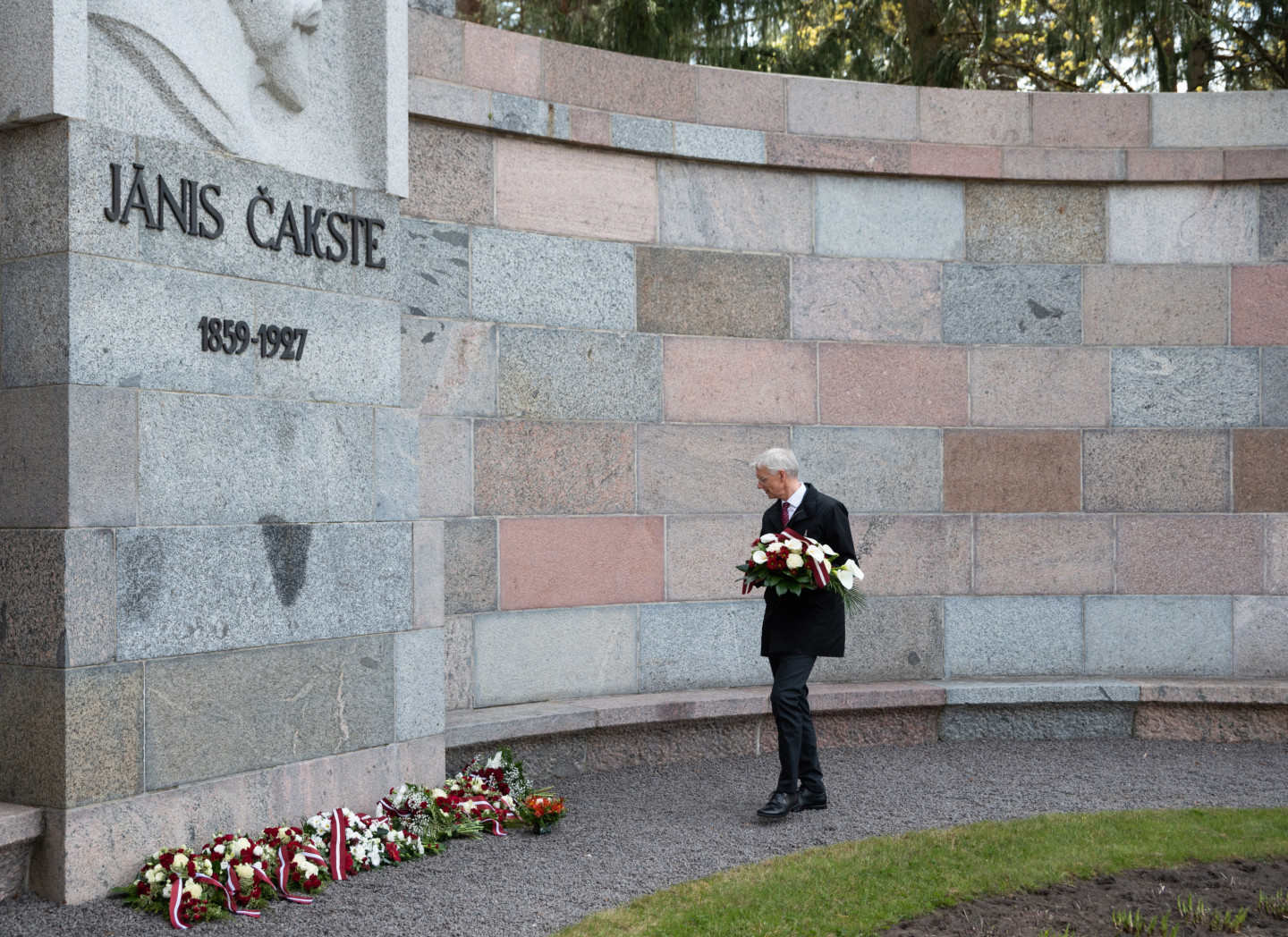 Ministru prezidents Krišjānis Kariņš noliek ziedus pie J. Čakstes pieminekļa Meža kapos par godu Latvijas Republikas Satversmes sapulces sasaukšanas dienai Darba svētki