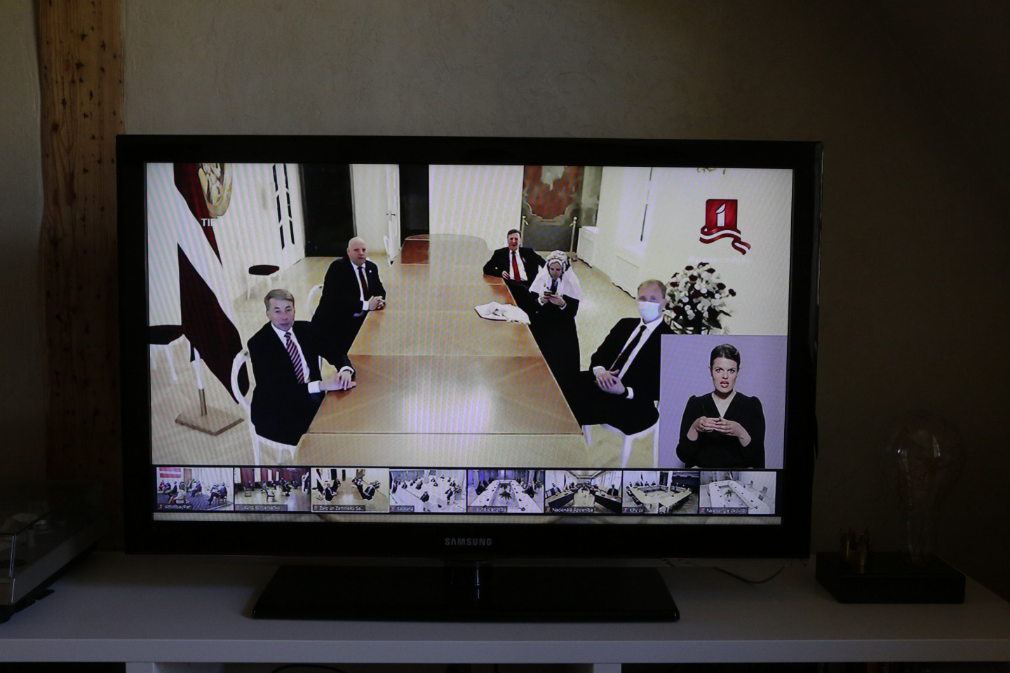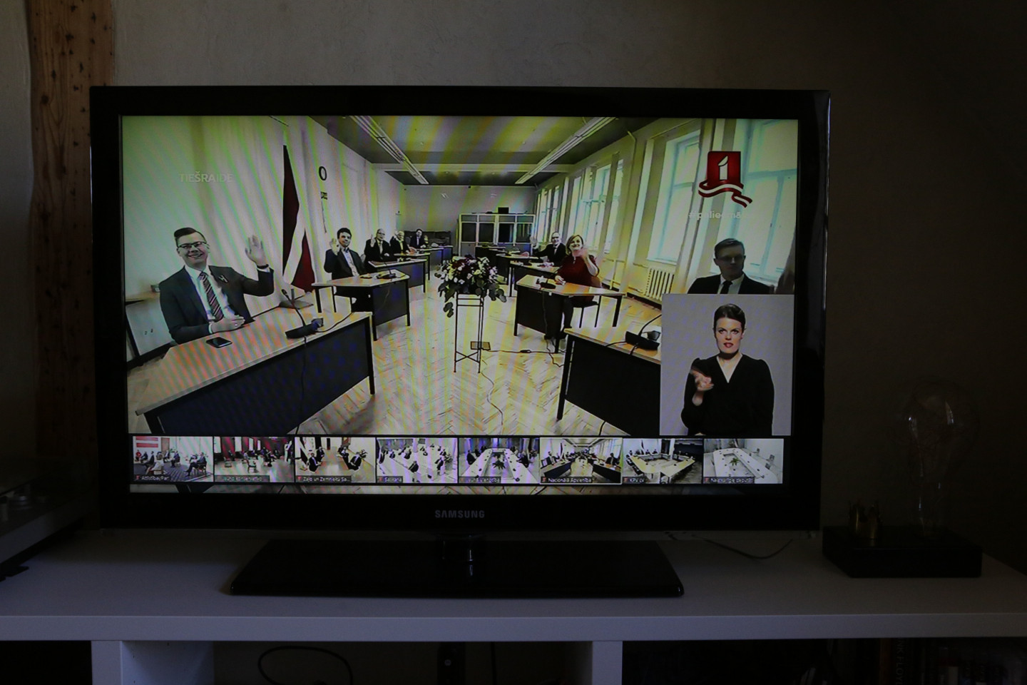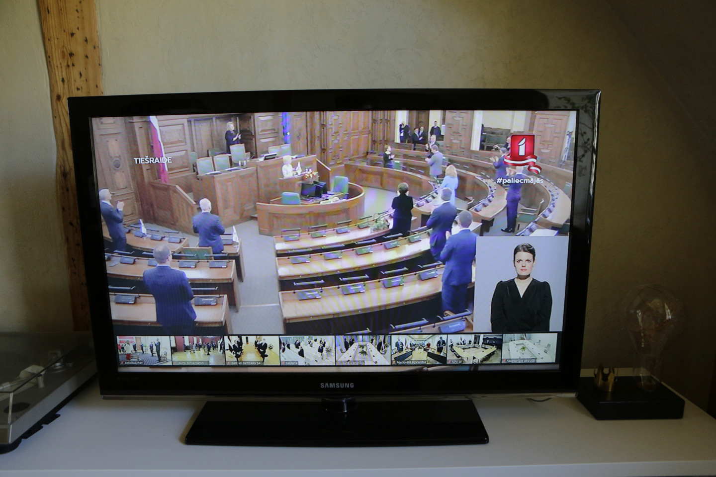 Jau ziņots, ka Latvijas Republikas Neatkarības atjaunošanas dienā, Saeima attālināti sanāca uz svinīgo sēdi. Ievērojot nepieciešamību ievērot fizisko distanci, 4.maija svinīgā Saeimas sēde norisinājās videokonferences formātā, deputātiem uzturoties vairākās atsevišķās parlamenta telpās.
