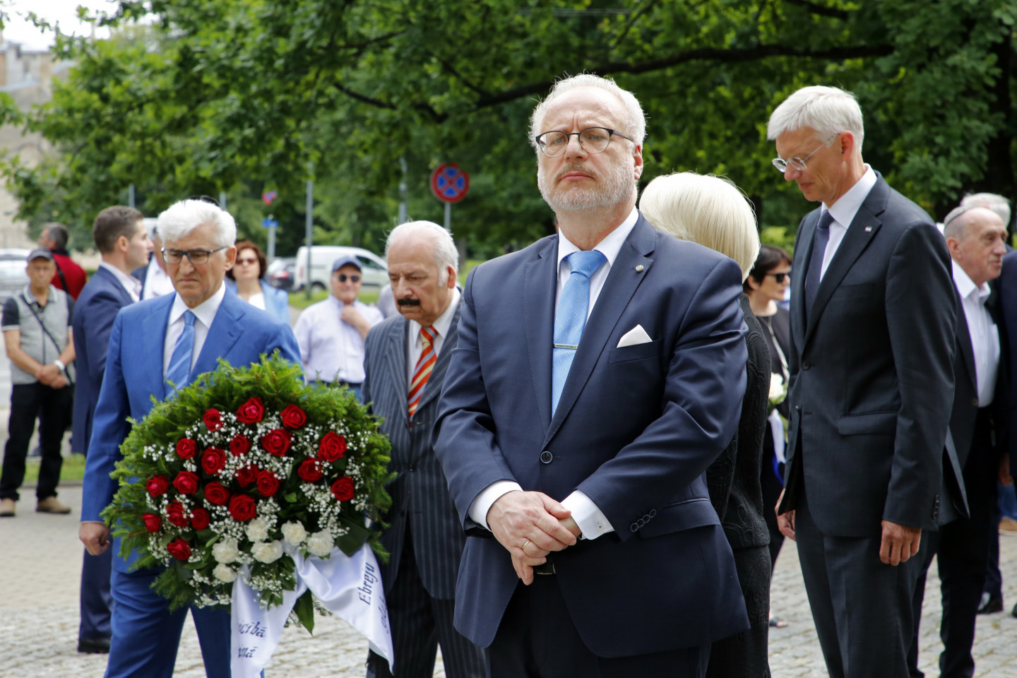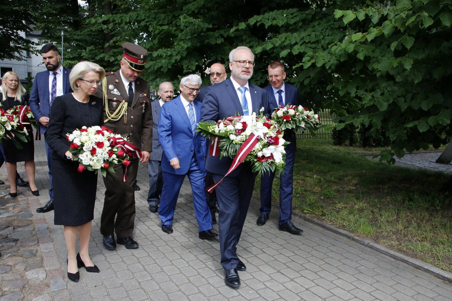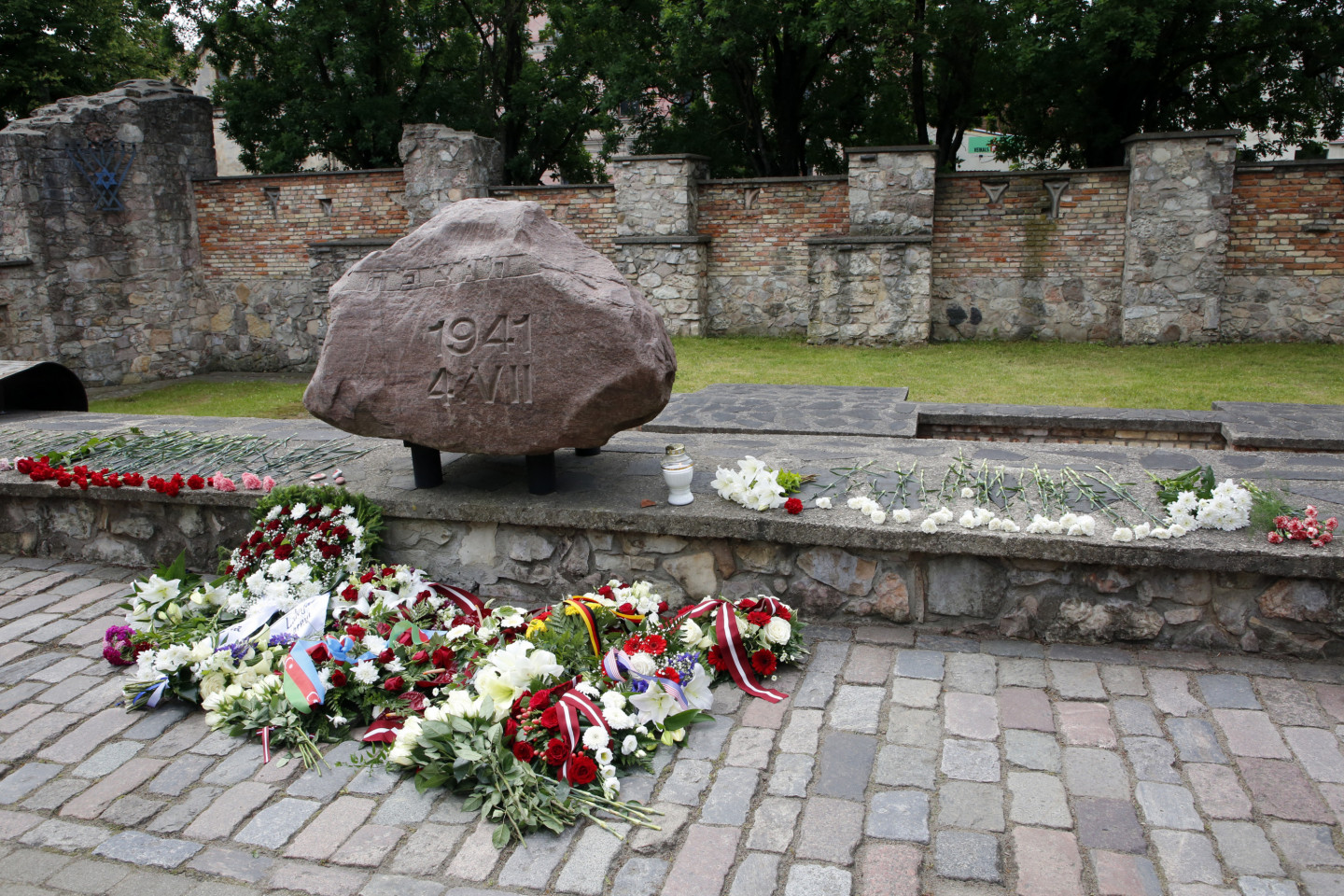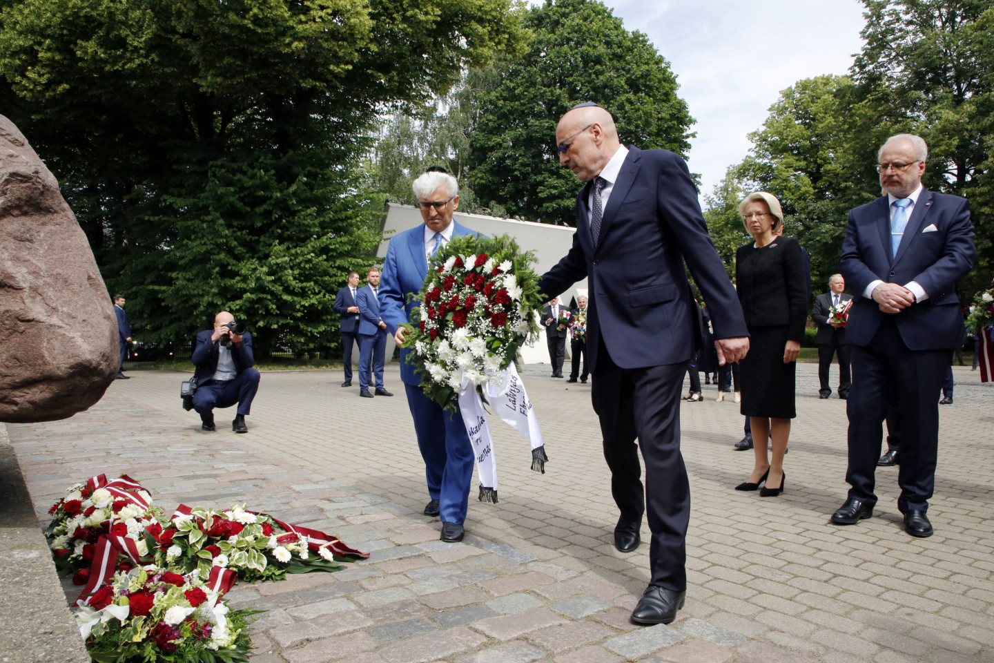 Ziedu nolikšana pie Rīgas Lielās horālās sinagogas Holokausta memoriāla