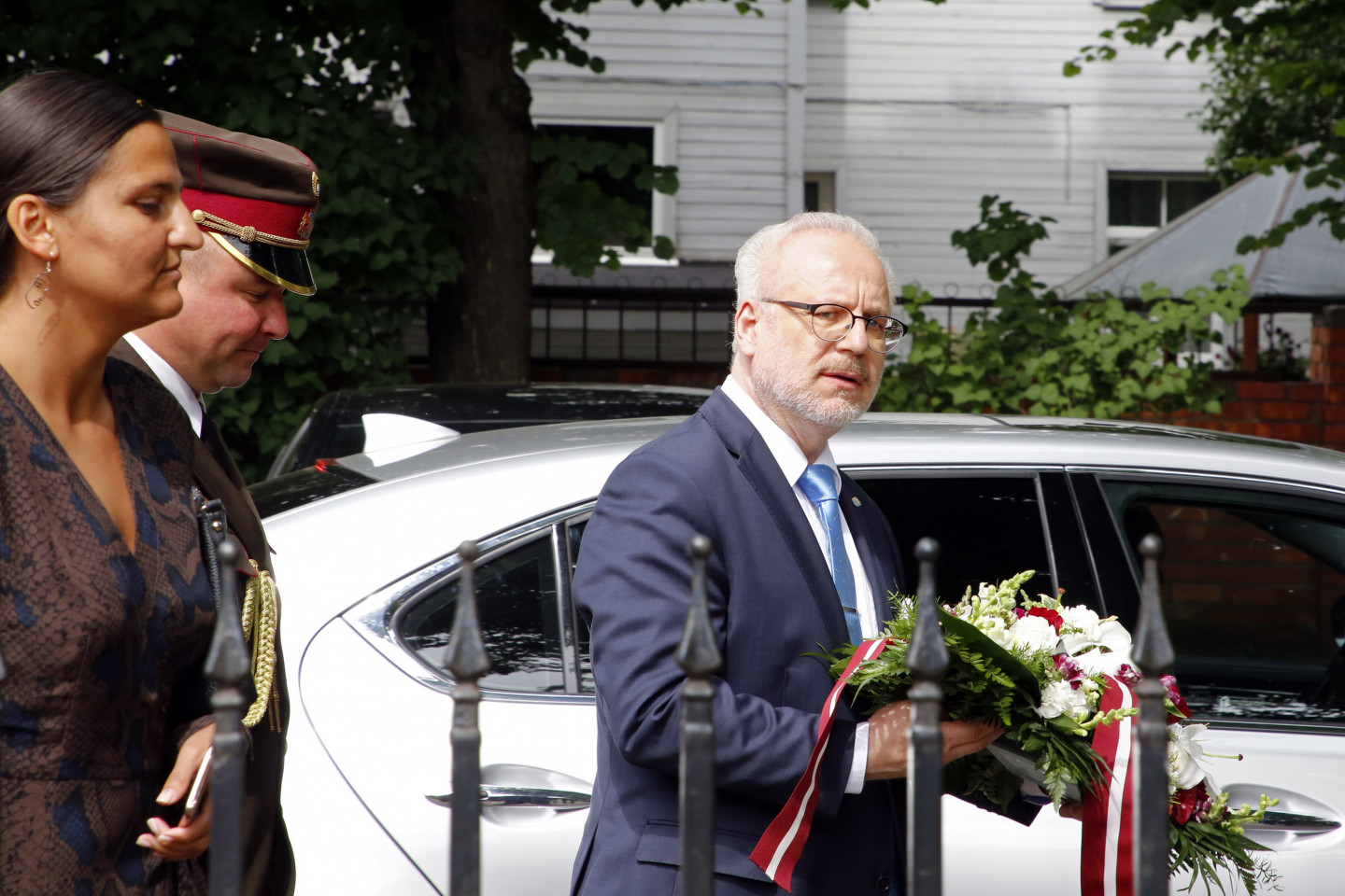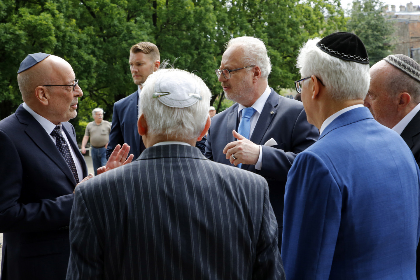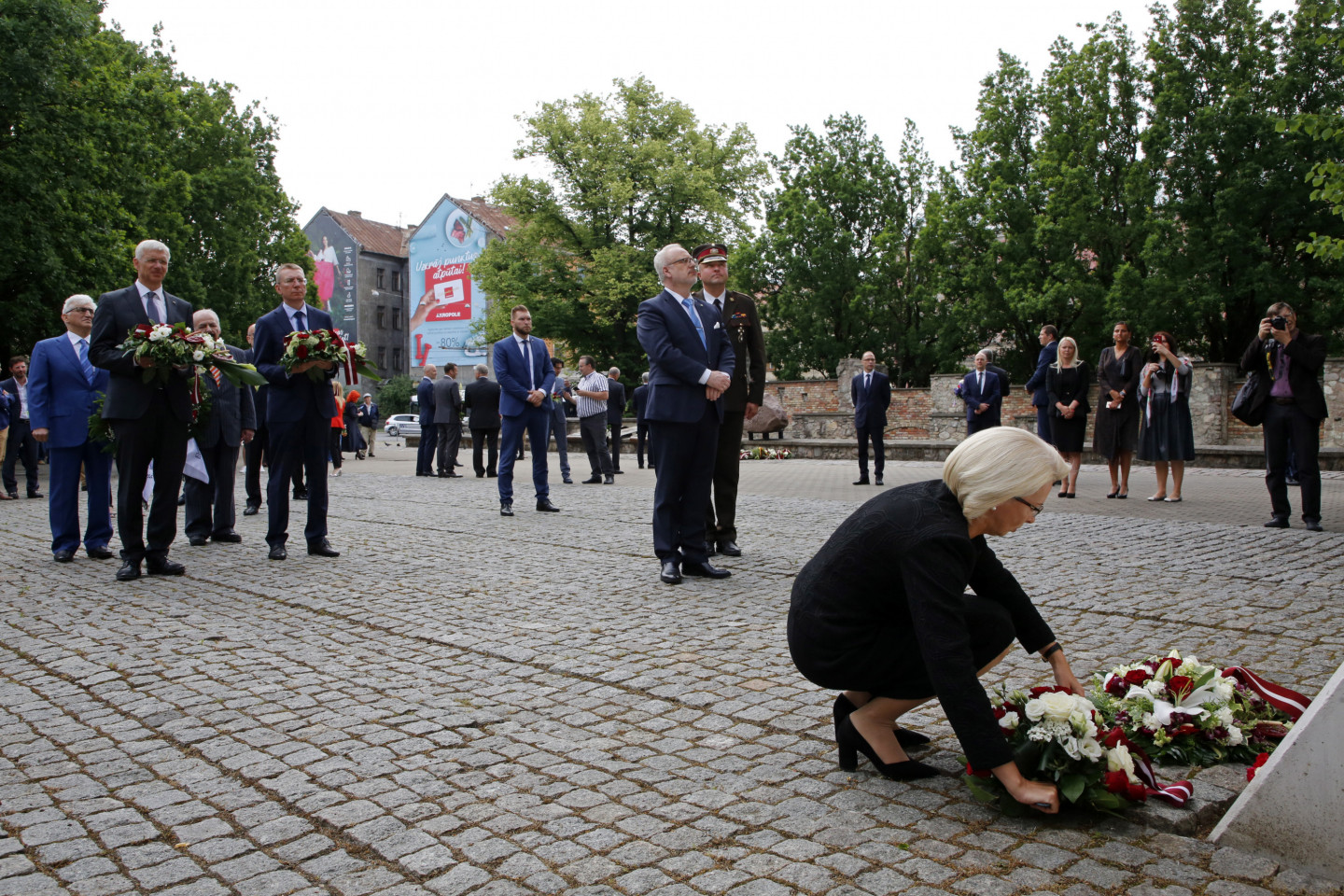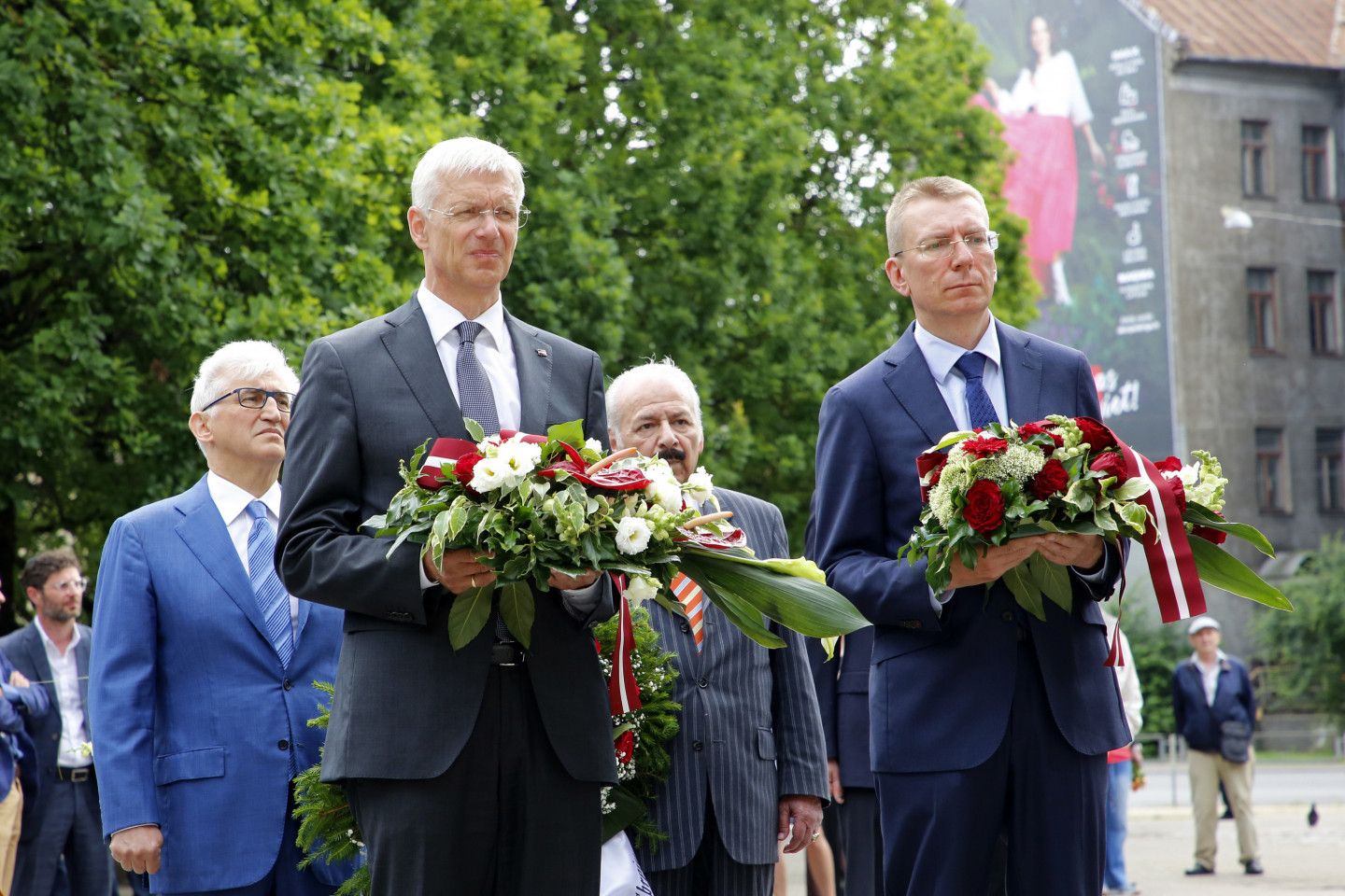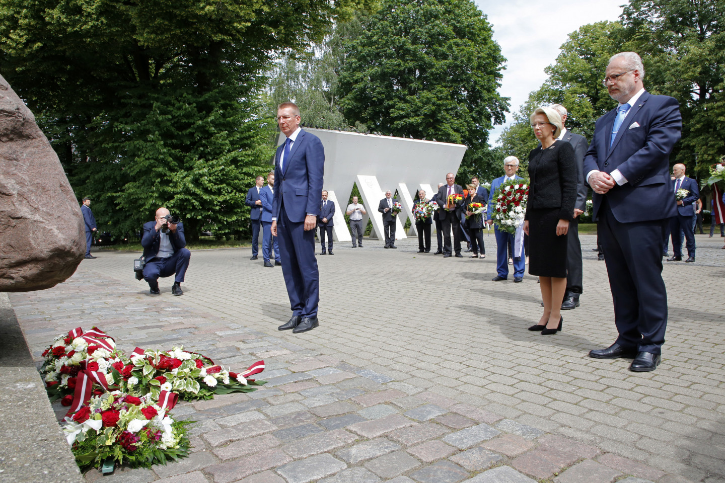 Ziedu nolikšana pie Rīgas Lielās horālās sinagogas Holokausta memoriāla