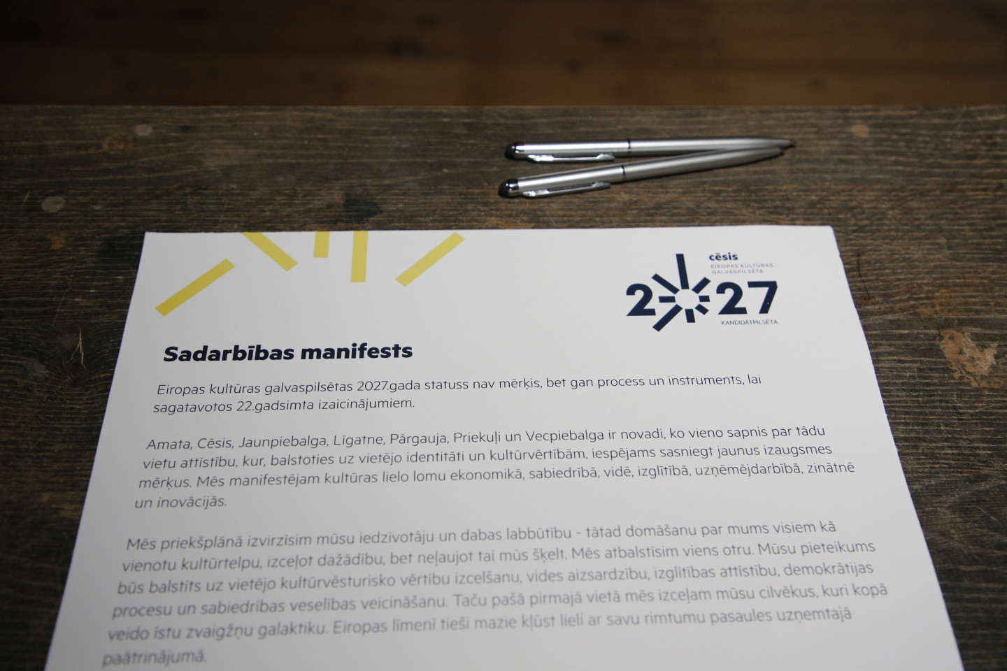Cēsu pilī notika svinīga manifesta parakstīšana, kurā jaunveidojamā Cēsu novada domju priekšsēdētāji apliecināja atbalstu un sadarbību Eiropas kultūras galvaspilsētas 2027.gada pieteikuma gatavošanā, procesa nodrošināšanā un kopīgu notikumu rīkošanā jaunveidojamā Cēsu novada robežās - Amatā, Cēsīs, Jaunpiebalgā, Līgatnē, Pārgaujā, Priekuļos un Vecpiebalgā. Piedalījās Vecpiebalgas novada domes priekšsēdētājs Indriķis Putniņš, Jaunpiebalgas novada domes priekšsēdētājs Laimis Šāvējs, Amatas novada domes priekšsēdētāja Elita Eglīte, Līgatnes novada domes priekšsēdētājs Ainārs Šteins, Priekuļu novada domes priekšsēdētāja Elīna Stapulone, Pārgaujas novada domes priekšsēdētājs Hardijs Vents un Cēsu novada domes priekšsēdētājs Jānis Rozenbergs.