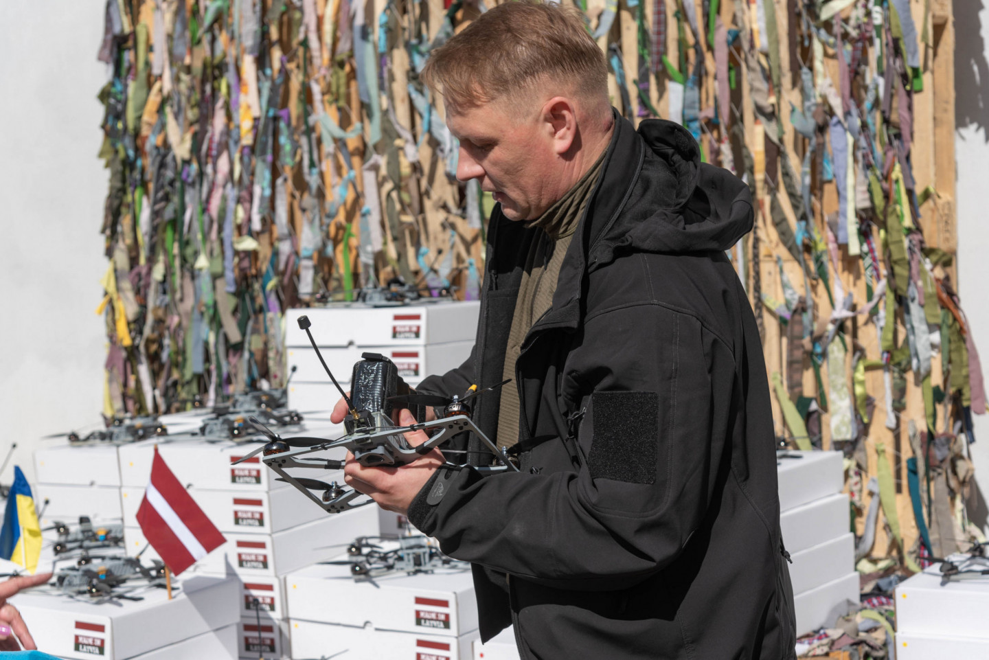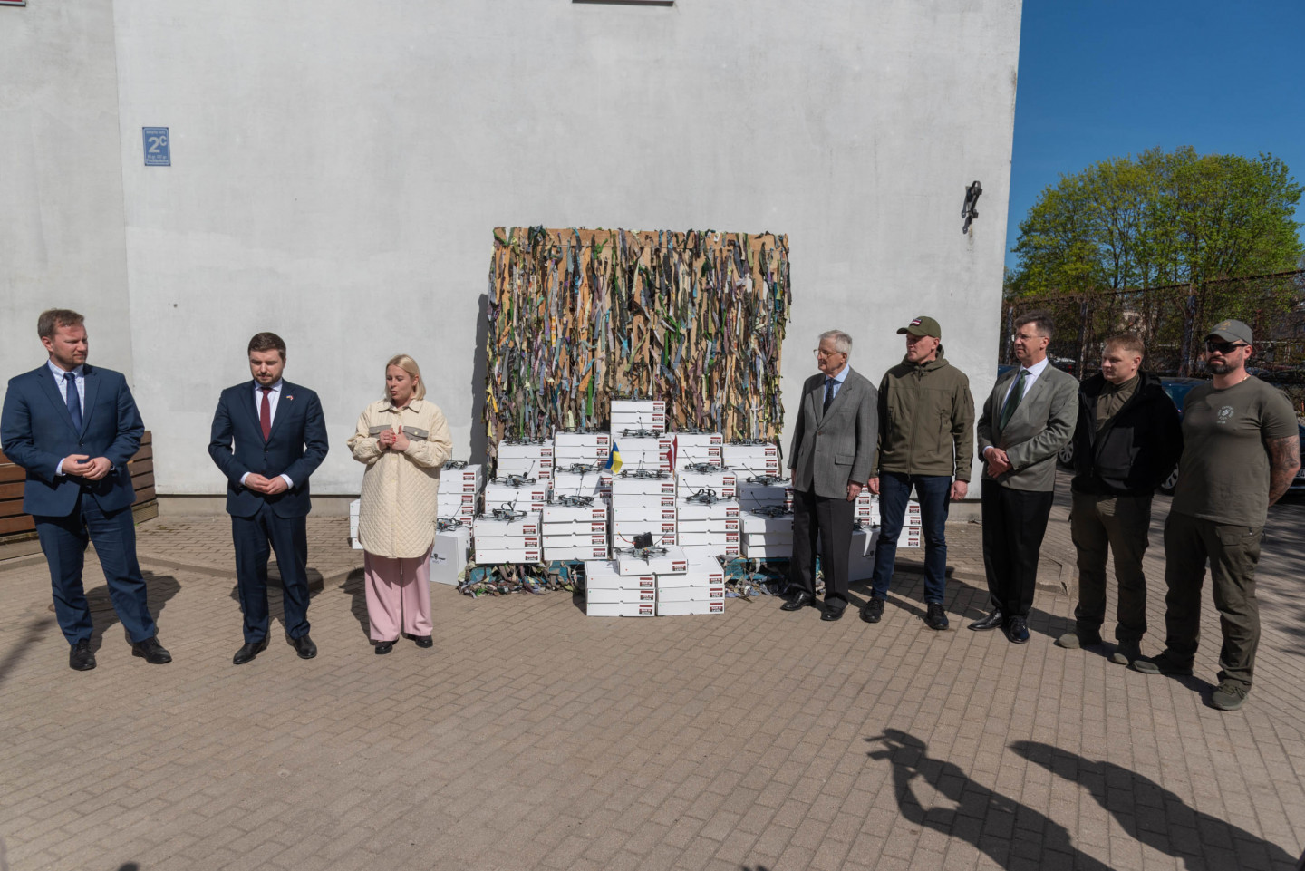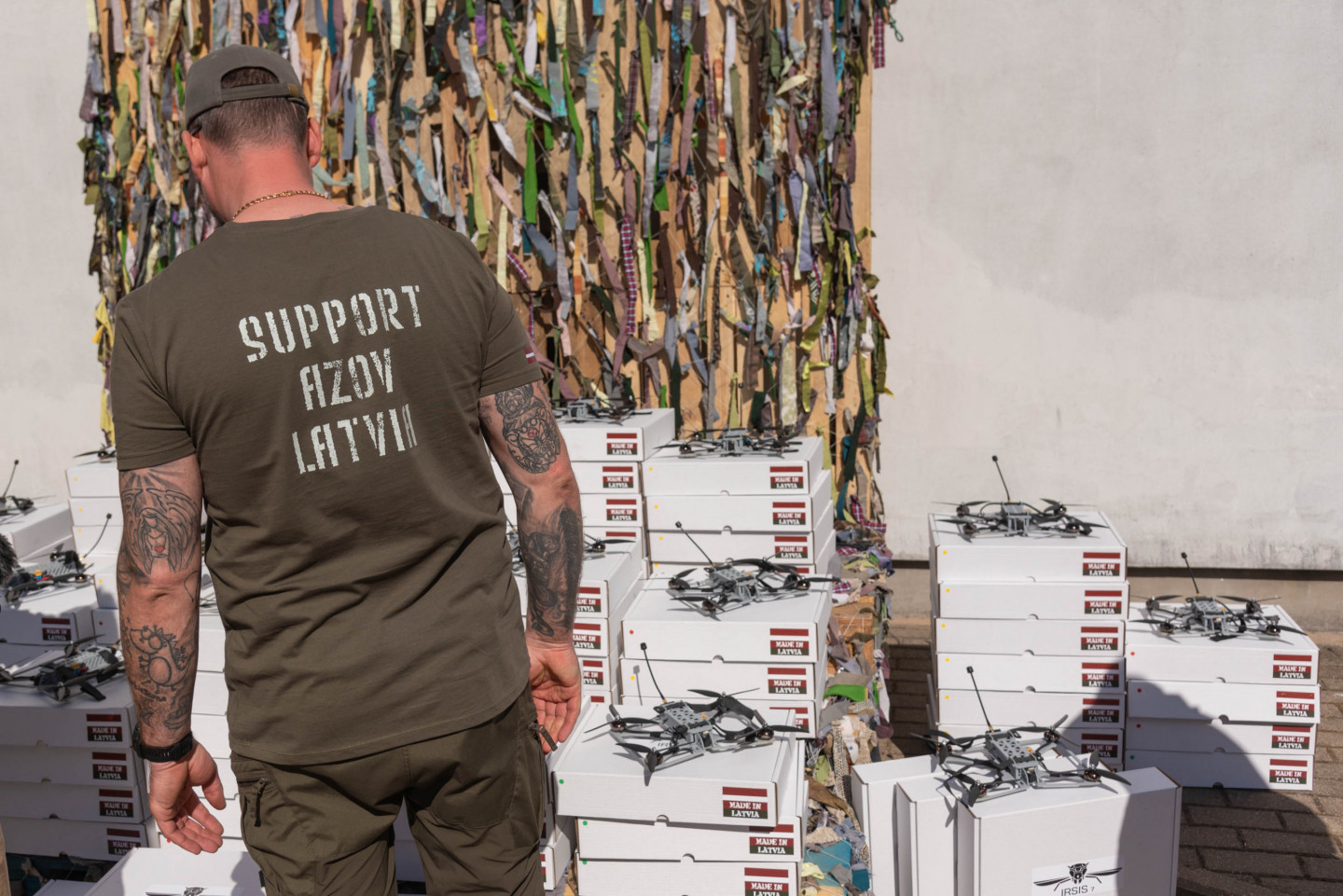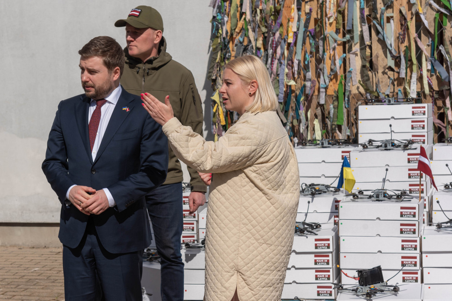 Organizācijas "Ziedot.lv" pagalmā norisinājies pasākums par godu Latvijā ražoto dronu "Irsis" nosūtīšanai uz Ukrainu.