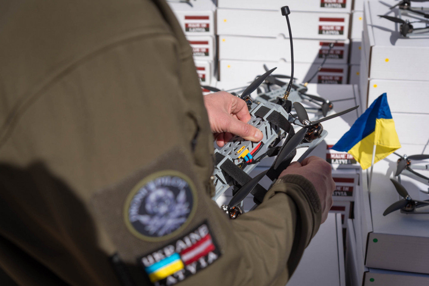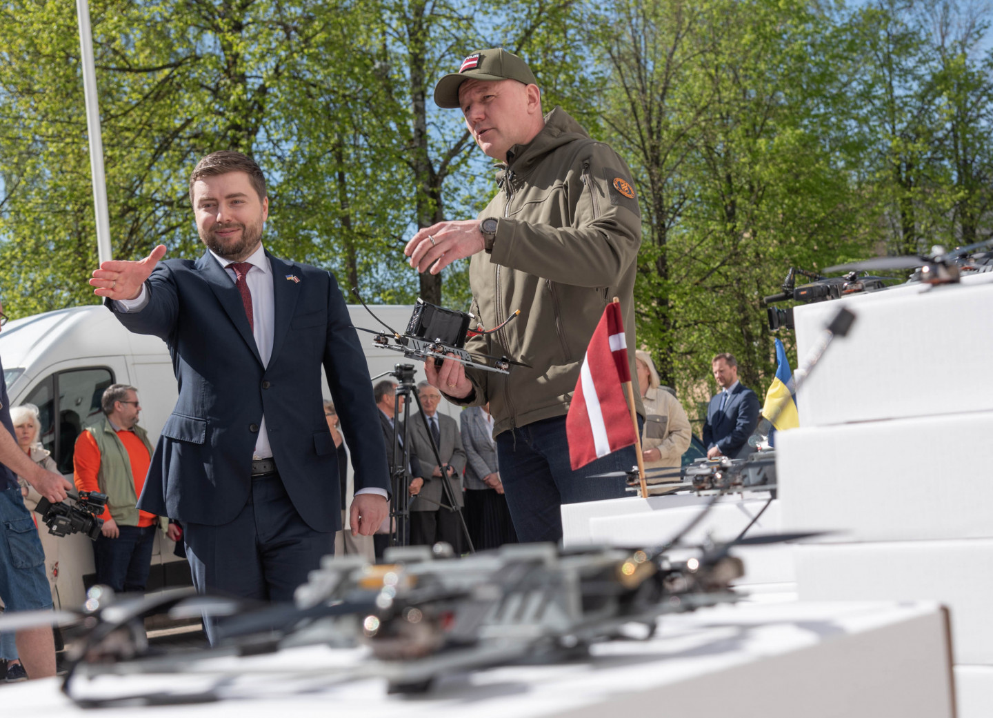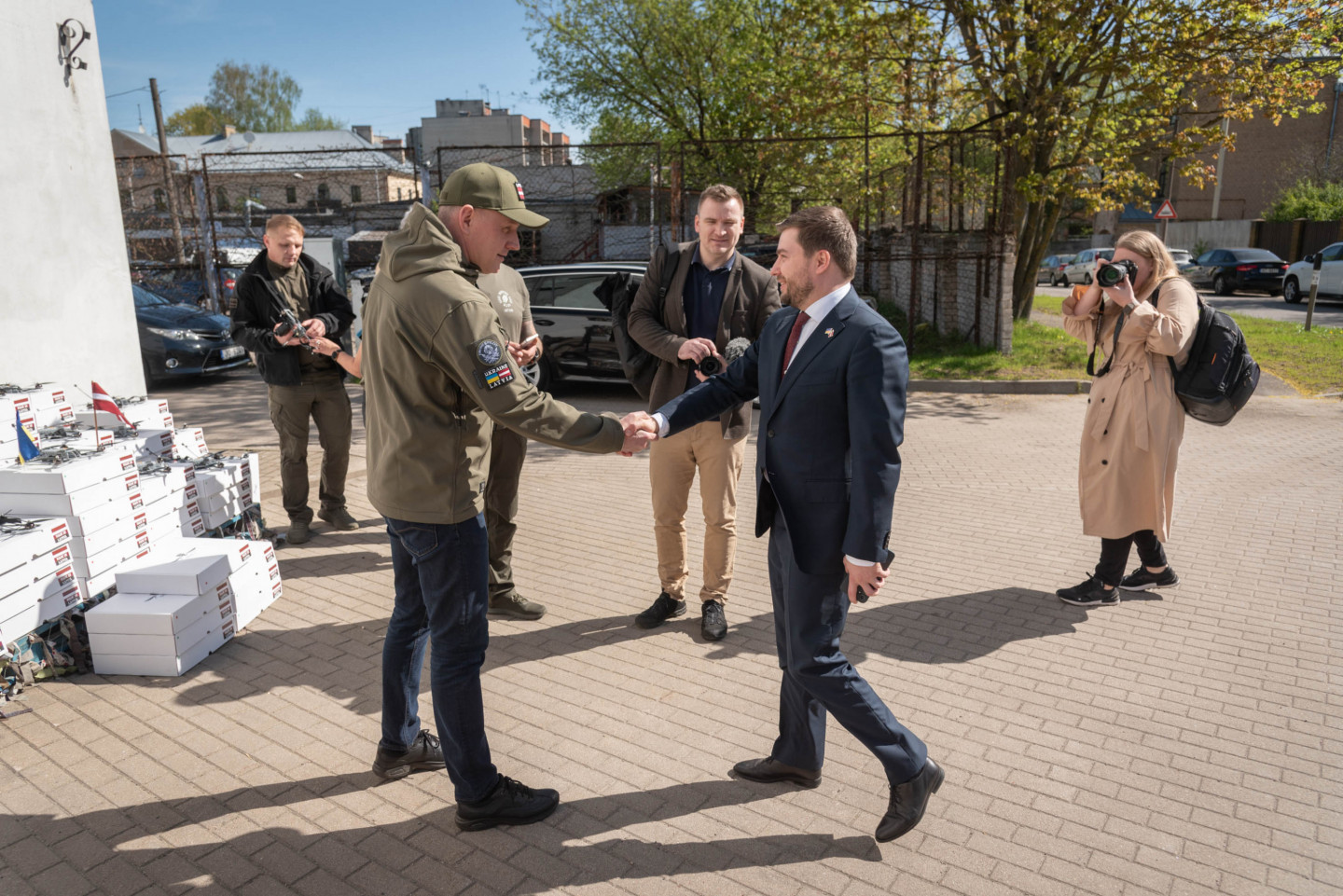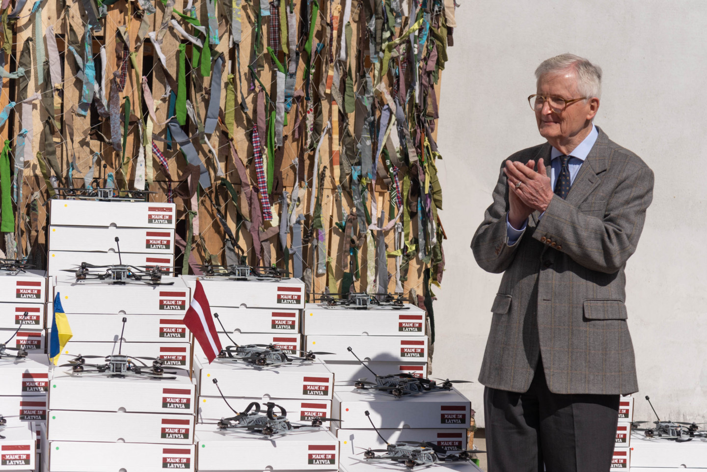 Organizācijas "Ziedot.lv" pagalmā norisinājies pasākums par godu Latvijā ražoto dronu "Irsis" nosūtīšanai uz Ukrainu.
