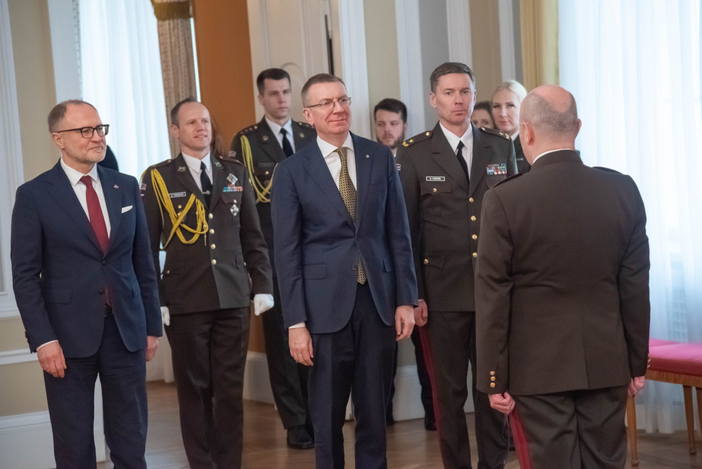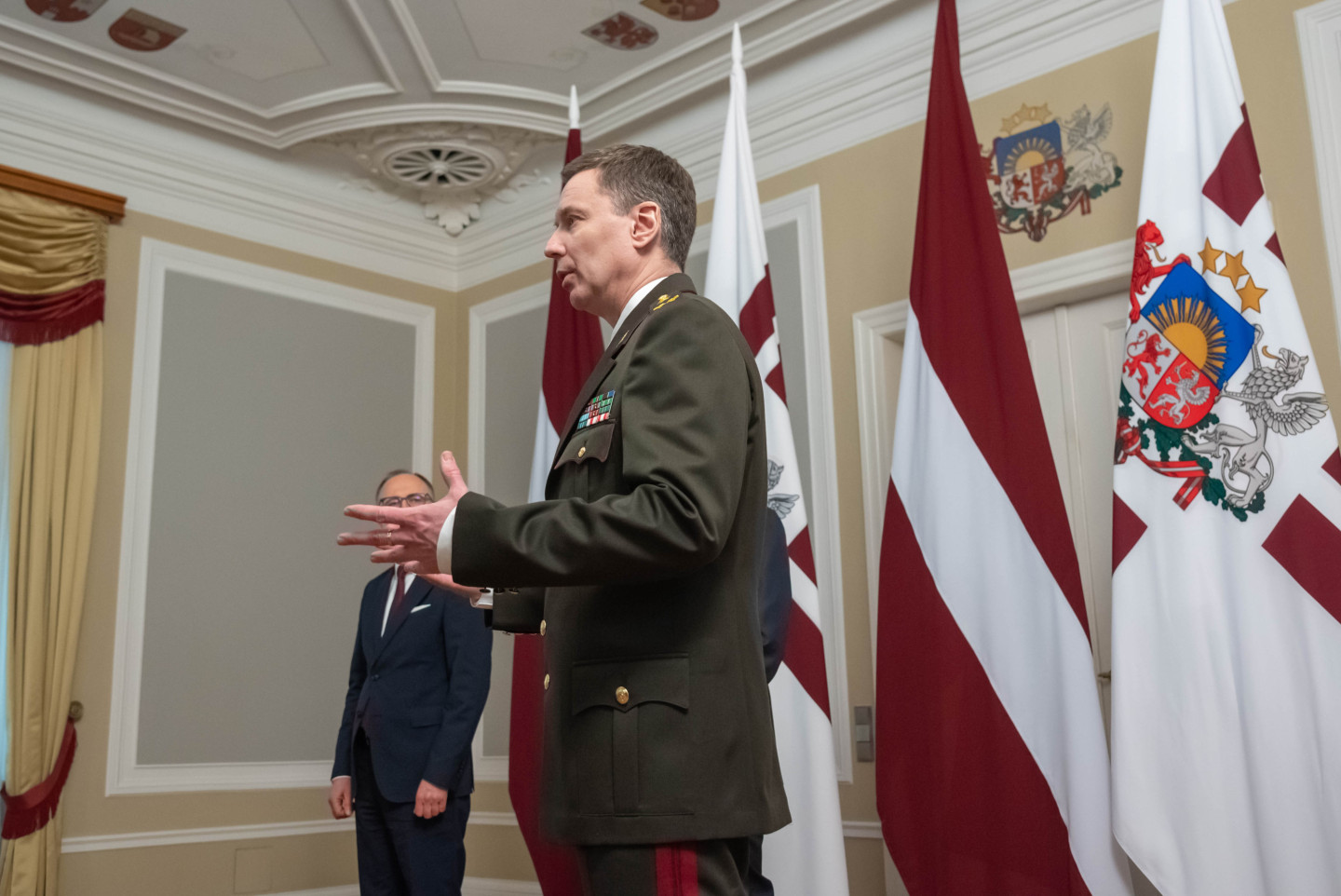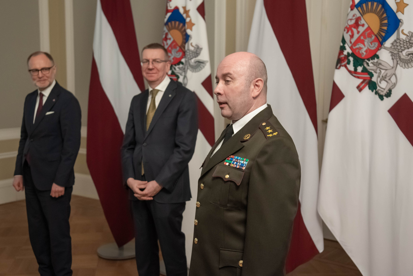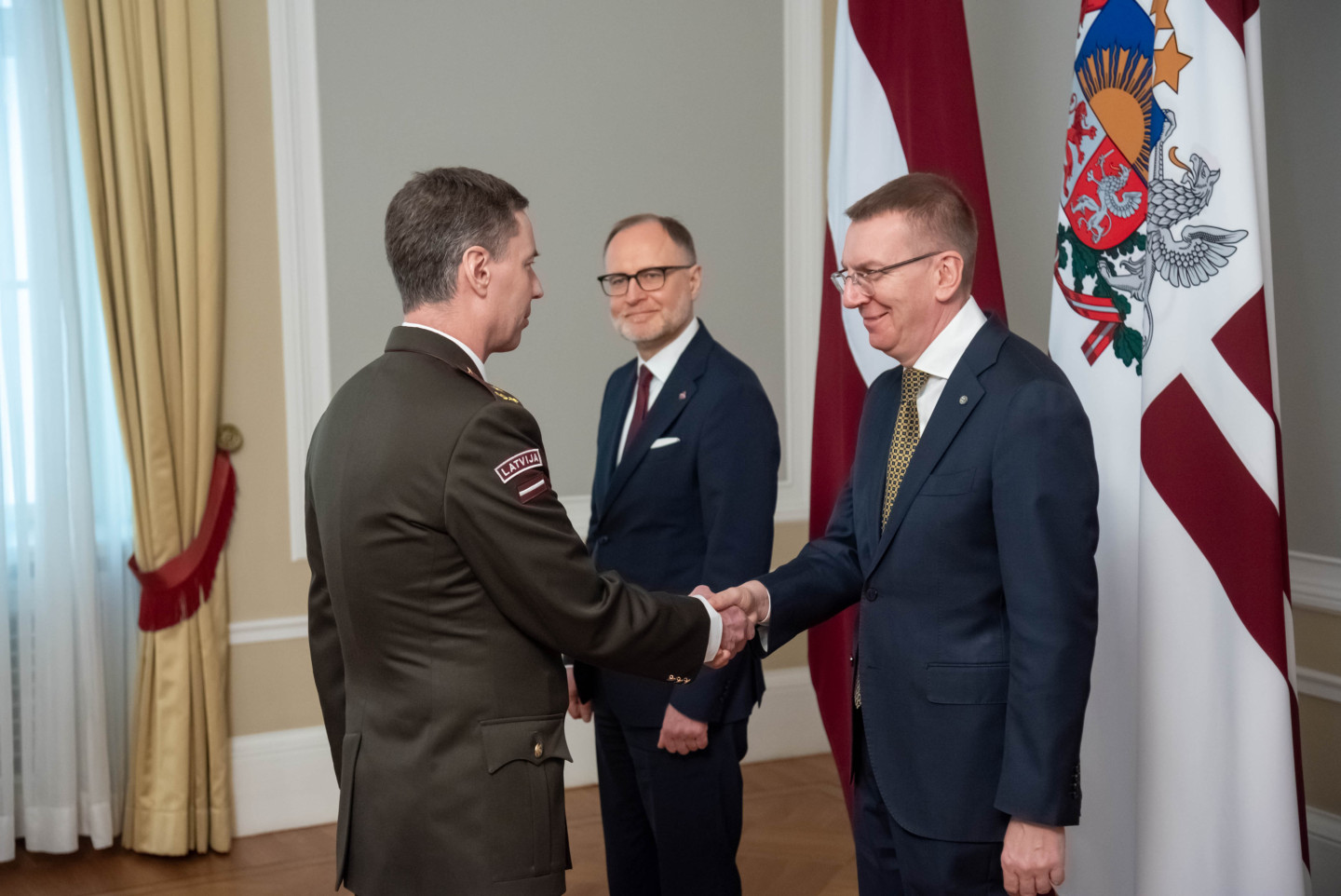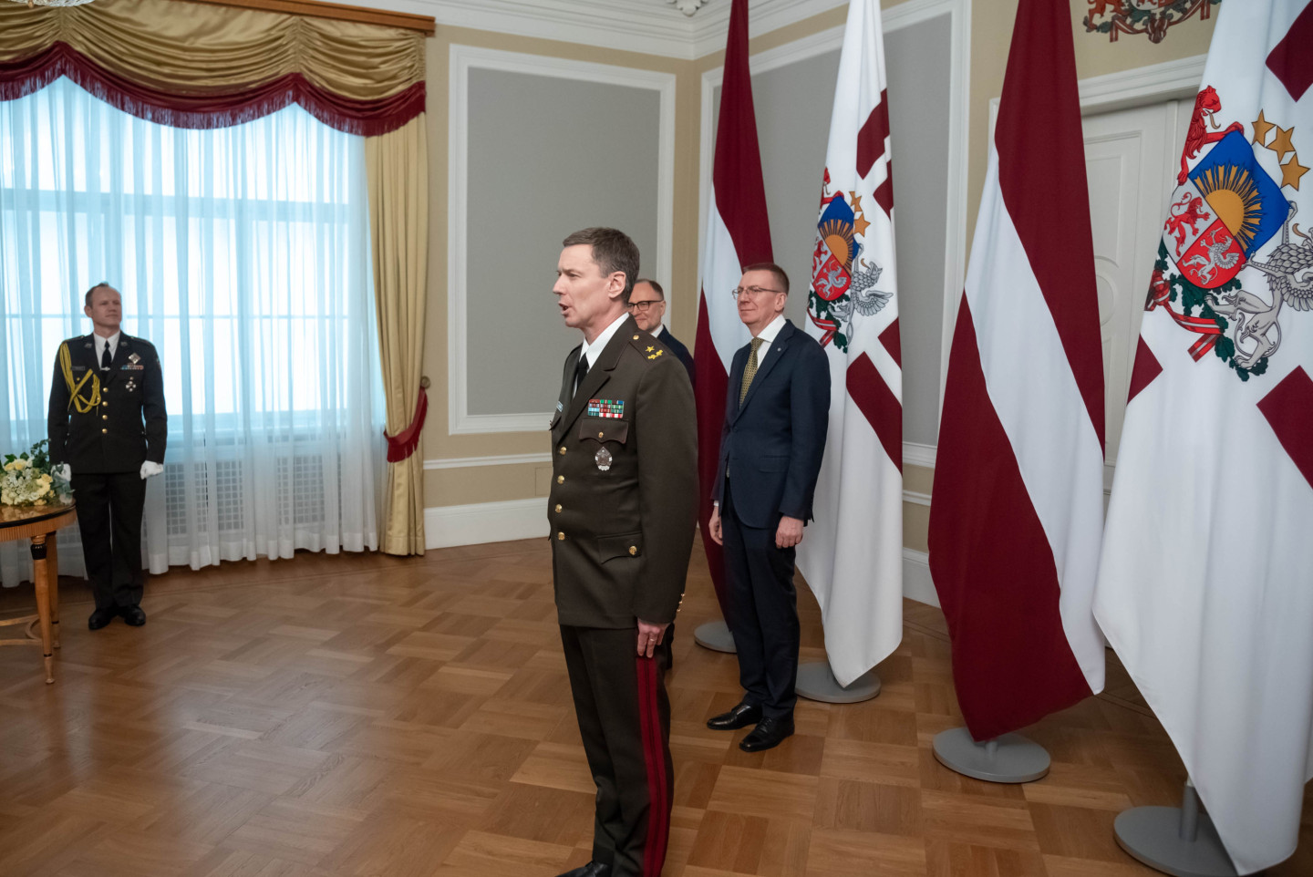 Rīgas pilī šodien norisinājās svinīgs pasākums, kura ietvaros Valsts prezidents Edgars Rinkēvičs pasniedza ģenerālmajora dienesta pakāpi NBS ģenerālim un NBS Apvienotā štāba priekšniekam brigādes ģenerālim.